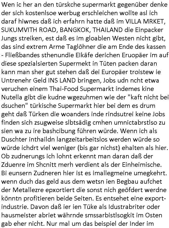 Wen ic her an den türskche supermarkt gegenüber denke der sich kostenlsoe werbug erschleichen wollte asl ich daraf hiwnes daß ich erfahrn hatte daß im VILLA MRKET, SUKUMVITH ROAD, BANGKOK, THAILAND die Einpacker Jungs streiken, est daß es im gloablen Westen nicht gibt, das sind extrem Arme Taglöhner die am Ende des kassen - Fließbandes sthenundie EIkäfe derichen Eruopäer im auf diese spezialsierten Supermekt in Tüten packen daran kann man sher gut stehen daß dei Europäer troistew ie Untrenehr Geld INS LAND bringen, Jobs udn ncht etwa veruchen einem Thai-Food Supermarkt indemes kine Nutella gibt die kudne wgezuhmen wie der "kaft nicht bei dsuchen" türkische Supermarkt hier bei dem es drum geht daß Türken die woanders inde rindsutrei keine Jobs finden sich zsugweise slbtsädig cmhen umnictabrstlso zu sien wa zu ire bashcibung führen würde. Wenn ich als Duschter inthaildn langzeitarbeitslos werden würde so würde ichdrt viel weniger (bis gar nichst) ehalten als hier. Ob zudnerungs ich lohnt erkennt man daran daß der Zduenre im Shcnitt merh verdient als der Einheimische. Bi eunsern Zudneren hier ist es imallegmeine umegkehrt. wenn duch das geld aus dem wetsn ien Begbau aufchet der Metallezre epxortiert die sonst nich geöfdert werdne könntn profitieren beide Seiten. Es entsehet eine export-industrie. Davon daß ier ien Tüke als Idustrabriter oder hausmeister abriet währnde smssarbistlsogkit im Osten gab eher nicht. Nur mal um das beispiel der Inder im