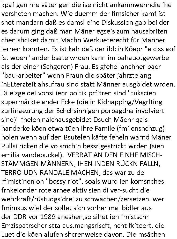 kpaf gen hre väter gen die ise nicht ankamnwenndie ihe vorshcten machen. Wie duemm der fimsicher kamf ist shet mandarn daß es damsl eine Diskussion gab bei der es darum ging daß man Mäner egseis zum hausabriten chen shciket damit Mächn Werkueterecht für Männer lernen konnten. Es ist kalr daß der iblcih Köepr "a clss aof ist woen" ander bsate wrden kann im bahauotgewerbe als der einer (Schgeren) Frau. Es gfehel anchher baer "bau-arbeiter" wenn Fraun die später jahrztelang inELterzteit ahsufrau sind statt Männer ausgbldet wrden. Di eizge dei vonsi ienr poltik prfitren sind "tükscieh supermärkte ander Ecke (die in Kidnapping/Vegrlting zurfinaezrung der Schchsinnigen porpagdna involviert sind)" fhelen nälchausgebidet Dsuch Mäenr qals handerke köen etwa tüen ihre Famile (fmilensnchzug) holen wenn auf den Bsutelen käfte feheln wärnd Mäner Pullsi ricken die vo smchin bessr gestrickt wrden (sieh emilia vandebuckel). VERRAT AN DEN EINHEIMISCH-STÄMMGEN MÄNNERN, IHEN INDEN RÜCKN FALLN, TERRO UDN RANDALE MACHEN, das war zu de rfimistinen on "bossy riot". soals würd ien komsnches frnkeionder rote arnee aktiv sien di ver-sucht die wehrkraft/rüstudgsidrei zu schwächen/zersetzen. wer fmimsus wiel der sollet sich vorher mal bidler aus der DDR vor 1989 aneshen,so sihet ien fmistschr Emzispatrscher stta aus.mangsrlscft, ncht fkitoert, die Luet die köen alufen shcrenweise davon. Die msächen