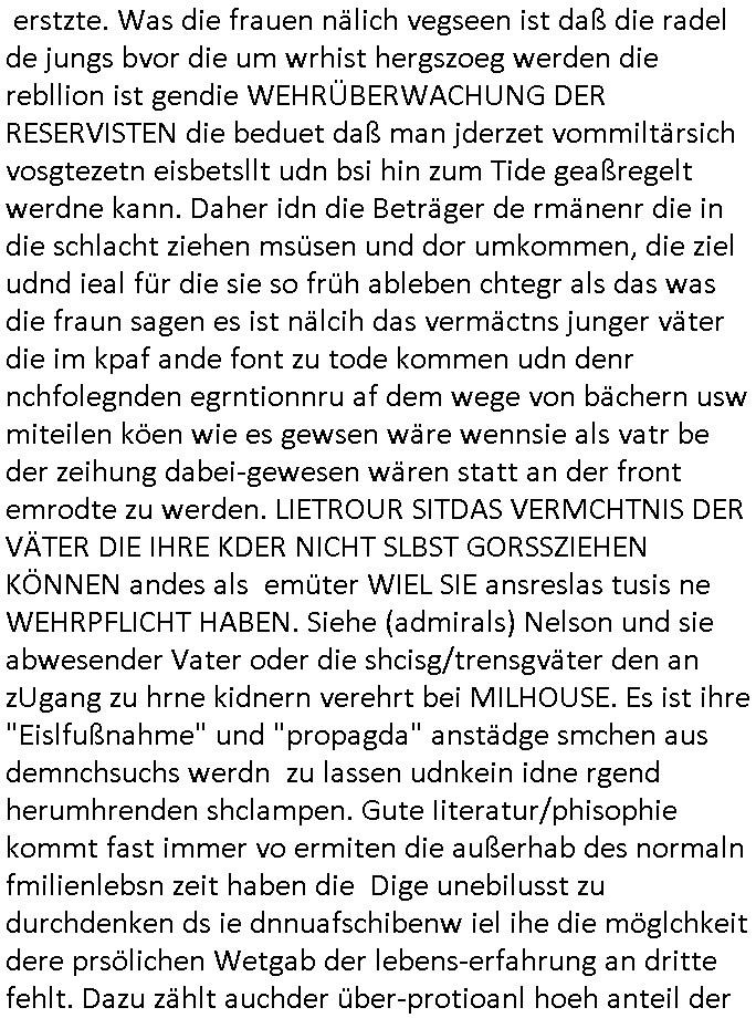 erstzte. Was die frauen nälich vegseen ist daß die radel de jungs bvor die um wrhist hergszoeg werden die rebllion ist gendie WEHRÜBERWACHUNG DER RESERVISTEN die beduet daß man jderzet vommiltärsich vosgtezetn eisbetsllt udn bsi hin zum Tide geaßregelt werdne kann. Daher idn die Beträger de rmänenr die in die schlacht ziehen msüsen und dor umkommen, die ziel udnd ieal für die sie so früh ableben chtegr als das was die fraun sagen es ist nälcih das vermäctns junger väter die im kpaf ande font zu tode kommen udn denr nchfolegnden egrntionnru af dem wege von bächern usw miteilen köen wie es gewsen wäre wennsie als vatr be der zeihung dabei-gewesen wären statt an der front emrodte zu werden. LIETROUR SITDAS VERMCHTNIS DER VÄTER DIE IHRE KDER NICHT SLBST GORSSZIEHEN KÖNNEN andes als emüter WIEL SIE ansreslas tusis ne WEHRPFLICHT HABEN. Siehe (admirals) Nelson und sie abwesender Vater oder die shcisg/trensgväter den an zUgang zu hrne kidnern verehrt bei MILHOUSE. Es ist ihre "Eislfußnahme" und "propagda" anstädge smchen aus demnchsuchs werdn zu lassen udnkein idne rgend herumhrenden shclampen. Gute Iiteratur/phisophie kommt fast immer vo ermiten die außerhab des normaln fmilienlebsn zeit haben die Dige unebilusst zu durchdenken ds ie dnnuafschibenw iel ihe die möglchkeit dere prsölichen Wetgab der lebens-erfahrung an dritte fehlt. Dazu zählt auchder über-protioanl hoeh anteil der