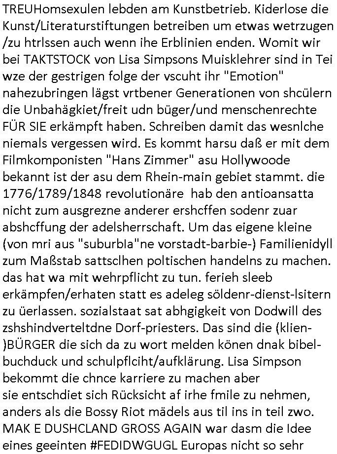 REUHomsexulen lebden am Kunstbetrieb. Kiderlose die Kunst/Literaturstiftungen betreiben um etwas wetrzugen /zu htrlssen auch wenn ihe Erblinien enden. Womit wir bei TAKTSTOCK von Lisa Simpsons Muisklehrer sind in Tei wze der gestrigen folge der vscuht ihr "Emotion" nahezubringen lägst vrtbener Generationen von shcülern die Unbahägkiet/freit udn büger/und menschenrechte FÜR SIE erkämpft haben. Schreiben damit das wesnlche niemals vergessen wird. Es kommt harsu daß er mit dem Filmkomponisten "Hans Zimmer" asu Hollywoode bekannt ist der asu dem Rhein-main gebiet stammt. die 1776/1789/1848 revolutionäre hab den antioansatta nicht zum ausgrezne anderer ershcffen sodenr zuar abshcffung der adelsherrschaft. Um das eigene kleine (von mri aus "suburbIa"ne vorstadt-barbie-) Familienidyll zum Maßstab sattsclhen poltischen handelns zu machen. das hat wa mit wehrpflicht zu tun. ferieh sleeb erkämpfen/erhaten statt es adeleg söldenr-dienst-lsitern zu üerlassen. sozialstaat sat abhgigkeit von Dodwill des zshshindverteltdne Dorf-priesters. Das sind die (klien-)BÜRGER die sich da zu wort melden könen dnak bibel-buchduck und schulpflciht/aufklärung. Lisa Simpson bekommt die chnce karriere zu machen aber sie entschdiet sich Rücksicht af irhe fmile zu nehmen, anders als die Bossy Riot mädels aus til ins in teil zwo. MAK E DUSHCLAND GROSS AGAIN war dasm die Idee eines geeinten #FEDIDWGUGL Europas nicht so sehr
