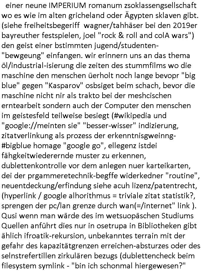 einer neune IMPERIUM romanum zsoklassengsellschaft wo es wie im alten gricheland oder Ägypten sklaven gibt. (siehe freiheitsbegeriff wagner/tahhäser bei den 2019er bayreuther festspielen, joel "rock & roll and colA wars") den geist einer bstimmten jugend/studenten-"bewgeung" einfangen. wir erinnern uns an das thema öl/industrial-isierung die zeiten des stummfilms wo die maschine den menschen üerholt noch lange bevopr "big blue" gegen "Kasparov" osbsiget beim schach, bevor die maschine nicht nir als trakto bei der meshcischen erntearbeit sondern auch der Computer den menschen im geistesfeld teilweise besiegt (#wikipedia und "google://meinten sie" "besser-wisser" indizierung, zitatverlinkung als prozess der erkenntnisgweinng- #bigblue homage "google go", ellegenz istdei fähgkeitwiederernde muster zu erkennen, dublettenkontrolle vor dem anlegen nuer karteikarten, dei der prgammeretechnik-begffe widerkedner "routine", neuentdeckung/erfindung siehe acuh lizenz/patentrecht, (hyperlink / google alhorithmus = triviale zitat statistik?, sprengen der pc/lan grenze durch wan(=/internet" link ). Qusi wenn man wärde des im wetsuopäschen Studiums Quellen anführt dies nur in osetrupa in Bibliotheken gibt ählich ifroatik-rekursion, unbekanntes terrain mit der gefahr des kapazitätgrenzen erreichen-absturzes oder des selnstrefertillen zirkulären bezugs (dublettencheck beim filesystem symlink - "bin ich schonmal hiergewesen?"