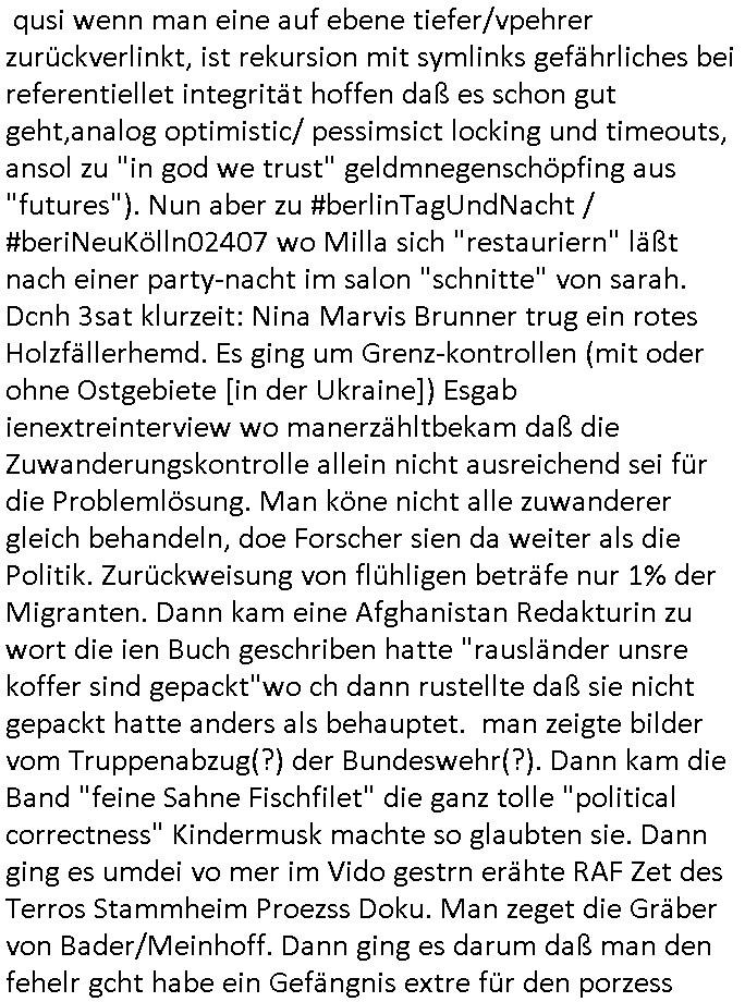 qusi wenn man eine auf ebene tiefer/vpehrer zurückverlinkt, ist rekursion mit symlinks gefährliches bei referentiellet integrität hoffen daß es schon gut geht,analog optimistic/ pessimsict locking und timeouts, ansol zu "in god we trust" geldmnegenschöpfing aus "futures"). Nun aber zu #berlinTagUndNacht / #beriNeuKölln02407 wo Milla sich "restauriern" läßt nach einer party-nacht im salon "schnitte" von sarah. Dcnh 3sat klurzeit: Nina Marvis Brunner trug ein rotes Holzfällerhemd. Es ging um Grenz-kontrollen (mit oder ohne Ostgebiete [in der Ukraine]) Esgab ienextreinterview wo manerzähltbekam daß die Zuwanderungskontrolle allein nicht ausreichend sei für die Problemlösung. Man köne nicht alle zuwanderer gleich behandeln, doe Forscher sien da weiter als die Politik. Zurückweisung von flühligen beträfe nur 1% der Migranten. Dann kam eine Afghanistan Redakturin zu wort die ien Buch geschriben hatte "rausländer unsre koffer sind gepackt"wo ch dann rustellte daß sie nicht gepackt hatte anders als behauptet. man zeigte bilder vom Truppenabzug(?) der Bundeswehr(?). Dann kam die Band "feine Sahne Fischfilet" die ganz tolle "political correctness" Kindermusk machte so glaubten sie. Dann ging es umdei vo mer im Vido gestrn erähte RAF Zet des Terros Stammheim Proezss Doku. Man zeget die Gräber von Bader/Meinhoff. Dann ging es darum daß man den fehelr gcht habe ein Gefängnis extre für den porzess