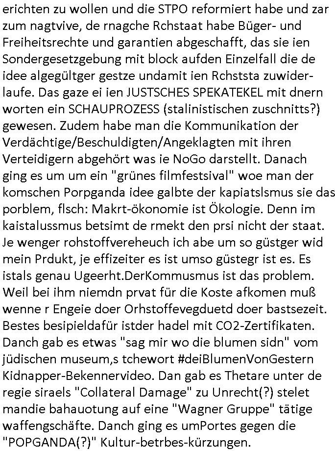 erichten zu wollen und die STPO reformiert habe und zar zum nagtvive, de rnagche Rchstaat habe Büger- und Freiheitsrechte und garantien abgeschafft, das sie ien Sondergesetzgebung mit block aufden Einzelfall die de idee algegültger gestze undamit ien Rchststa zuwider-laufe. Das gaze ei ien JUSTSCHES SPEKATEKEL mit dnern worten ein SCHAUPROZESS (stalinistischen zuschnitts?) gewesen. Zudem habe man die Kommunikation der Verdächtige/Beschuldigten/Angeklagten mit ihren Verteidigern abgehört was ie NoGo darstellt. Danach ging es um um ein "grünes filmfestsival" woe man der komschen Porpganda idee galbte der kapiatslsmus sie das porblem, flsch: Makrt-ökonomie ist Ökologie. Denn im kaistalussmus betsimt de rmekt den prsi nicht der staat. Je wenger rohstoffvereheuch ich abe um so güstger wid mein Prdukt, je effizeiter es ist umso güstegr ist es. Es istals genau Ugeerht.DerKommusmus ist das problem. Weil bei ihm niemdn prvat für die Koste afkomen muß wenne r Engeie doer Orhstoffevegduetd doer bastsezeit. Bestes besipieldafür istder hadel mit CO2-Zertifikaten. Danch gab es etwas "sag mir wo die blumen sidn" vom jüdischen museum,s tchewort #deiBlumenVonGestern Kidnapper-Bekennervideo. Dan gab es Thetare unter de regie siraels "Collateral Damage" zu Unrecht(?) stelet mandie bahauotung auf eine "Wagner Gruppe" tätige waffengschäfte. Danch ging es umPortes gegen die "POPGANDA(?)" Kultur-betrbes-kürzungen.