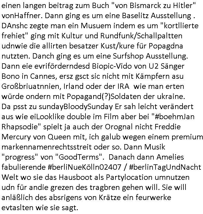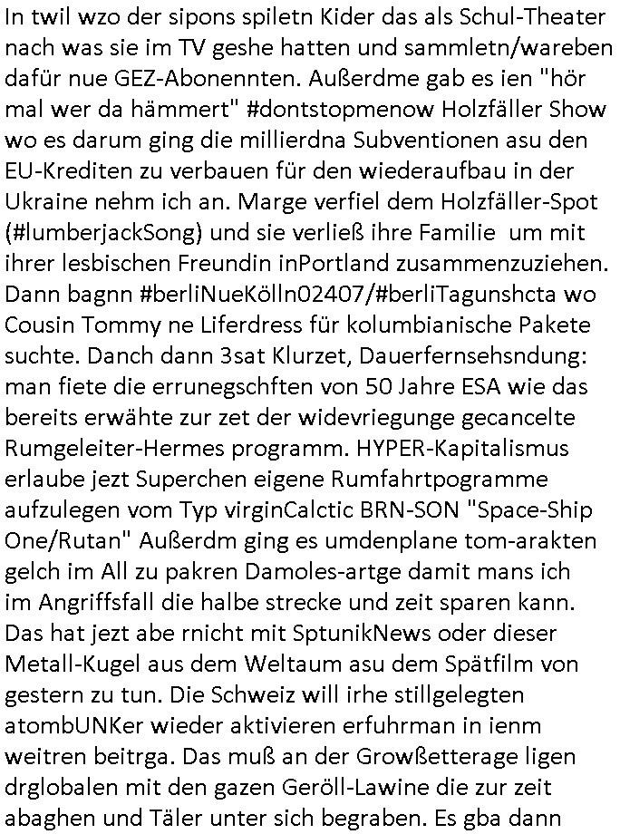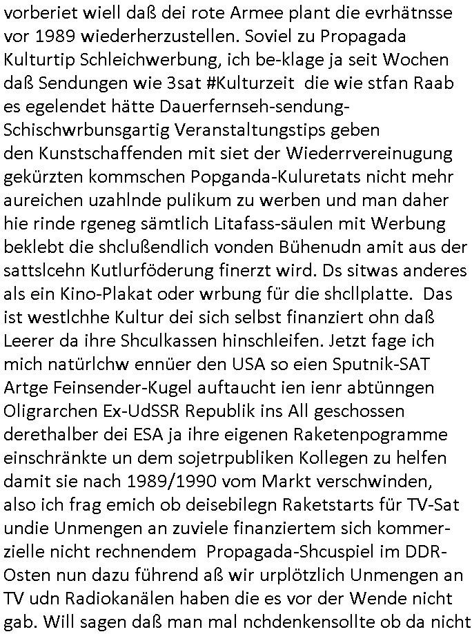vorberiet wiell daß dei rote Armee plant die evrhätnsse vor 1989 wiederherzustellen. Soviel zu Propagada Kulturtip Schleichwerbung, ich be-klage ja seit Wochen daß Sendungen wie 3sat #Kulturzeit die wie stfan Raab es egelendet hätte Dauerfernseh-sendung-Schischwrbunsgartig Veranstaltungstips geben den Kunstschaffenden mit siet der Wiederrvereinugung gekürzten kommschen Popganda-Kuluretats nicht mehr aureichen uzahlnde pulikum zu werben und man daher hie rinde rgeneg sämtlich Litafass-säulen mit Werbung beklebt die shclußendlich vonden Bühenudn amit aus der sattslcehn Kutlurföderung finerzt wird. Ds sitwas anderes als ein Kino-Plakat oder wrbung für die shcllplatte. Das ist westlchhe Kultur dei sich selbst finanziert ohn daß Leerer da ihre Shculkassen hinschleifen. Jetzt fage ich mich natürlchw ennüer den USA so eien Sputnik-SAT Artge Feinsender-Kugel auftaucht ien ienr abtünngen Oligrarchen Ex-UdSSR Republik ins All geschossen derethalber dei ESA ja ihre eigenen Raketenpogramme einschränkte un dem sojetrpubliken Kollegen zu helfen damit sie nach 1989/1990 vom Markt verschwinden, also ich frag emich ob deisebilegn Raketstarts für TV-Sat undie Unmengen an zuviele finanziertem sich kommer-zielle nicht rechnendem Propagada-Shcuspiel im DDR-Osten nun dazu führend aß wir urplötzlich Unmengen an TV udn Radiokanälen haben die es vor der Wende nicht gab. Will sagen daß man mal nchdenkensollte ob da nicht
