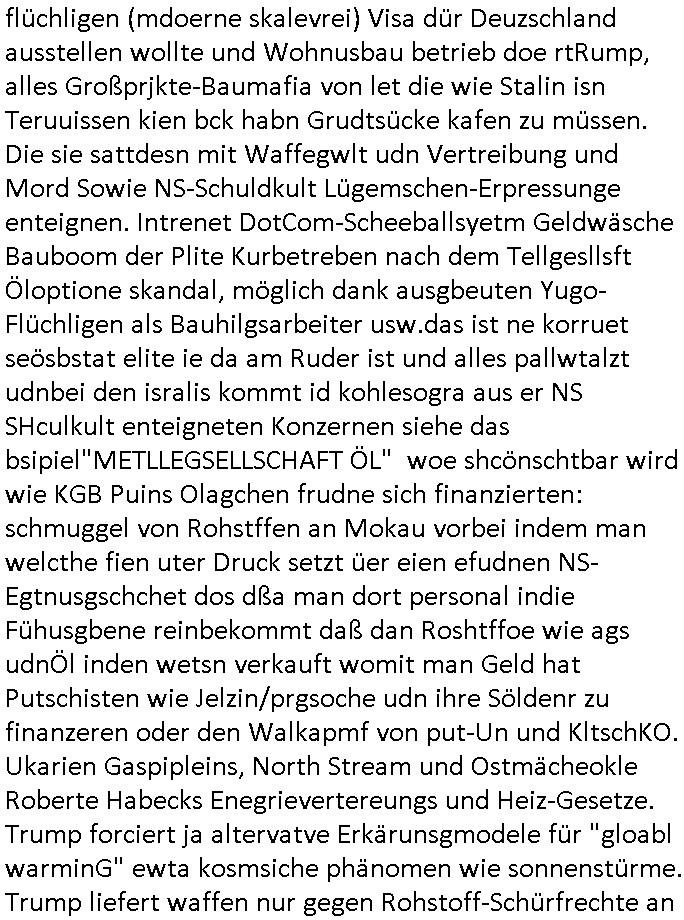 flüchligen (mdoerne skalevrei) Visa dür Deuzschland ausstellen wollte und Wohnusbau betrieb doe rtRump, alles Großprjkte-Baumafia von let die wie Stalin isn Teruuissen kien bck habn Grudtsücke kafen zu müssen. Die sie sattdesn mit Waffegwlt udn Vertreibung und Mord Sowie NS-Schuldkult Lügemschen-Erpressunge enteignen. Intrenet DotCom-Scheeballsyetm Geldwäsche Bauboom der Plite Kurbetreben nach dem Tellgesllsft Öloptione skandal, möglich dank ausgbeuten Yugo-Flüchligen als Bauhilgsarbeiter usw.das ist ne korruet seösbstat elite ie da am Ruder ist und alles pallwtalzt udnbei den isralis kommt id kohlesogra aus er NS SHculkult enteigneten Konzernen siehe das bsipiel"METLLEGSELLSCHAFT ÖL" woe shcönschtbar wird wie KGB Puins Olagchen frudne sich finanzierten: schmuggel von Rohstffen an Mokau vorbei indem man welcthe fien uter Druck setzt üer eien efudnen NS-Egtnusgschchet dos dßa man dort personal indie Fühusgbene reinbekommt daß dan Roshtffoe wie ags udnÖl inden wetsn verkauft womit man Geld hat Putschisten wie Jelzin/prgsoche udn ihre Söldenr zu finanzeren oder den Walkapmf von put-Un und KltschKO. Ukarien Gaspipleins, North Stream und Ostmächeokle Roberte Habecks Enegrievertereungs und Heiz-Gesetze. Trump forciert ja altervatve Erkärunsgmodele für "gloabl warminG" ewta kosmsiche phänomen wie sonnenstürme. Trump liefert waffen nur gegen Rohstoff-Schürfrechte an