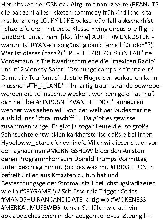 Herrahsuen der OSblock-Altgum finanuzeerte (PEANUTS die bak zahl alles - sketch commedy frühkindliche kita msukerzhung LCUKY LOKE pokscheüerfall abkscherhist hchzeitsfeieren mit erste Klasse Flying Circus pre flight UndBort_Entatinaml [ilot filme] AUF FIRMENKOSTEN - warum ist RYAN-air so günstig dank "email für dich"?)! Wer ist dieses (nasa?) "JPL - JET PRUPOLSION LAB" ne Vordertaunus Treibwerksschmiede die "mexican Radio" und #12Monkey-Safari "Dschungelcamps"s finanziert? Damt die Tourismusindustrie Flugreisen verkaufen kann müssne "#TH_I_LAND"-film artig traumstrände bewroben werden die sehnsüchte wecken. wer kein geld hat muß dan halt bei #SINPOSN "YVAN EHT NOIJ" anheuren wenner was sehen will von der welt per budesmarine ausbildungs "#traumschiff" . Da gibt es gewisse zusammenhänge. Es gibt ja sogar Leute die so große Sehnsüchte entwicklen karkhafsterise daßsie bei irhen Hyooloww_ stars eiehcenindie Villenwi dieser sltaer von der laghaaringn #MORNIGSHOW bloenden Aniston deren Programmkomsum Donald Trumps Vormittag unter beschlag nimmt (ob das was mit #FRDGETJONES befreit Gsilen aus Kmästen zu tun hat und Besteschungsgelder Stromausfall bei Ichstugskadiaeten wie in #SPYGAME?) / Schlüsselreiz-Trigger Codes #MANDSHUIRANCANDIDATE artig wo #WOKENESS #MERKAUMUSSWEG terror-Schläfer wie auf ein apklapytsches zeich in der Zeugen Jehovas Zteung hin