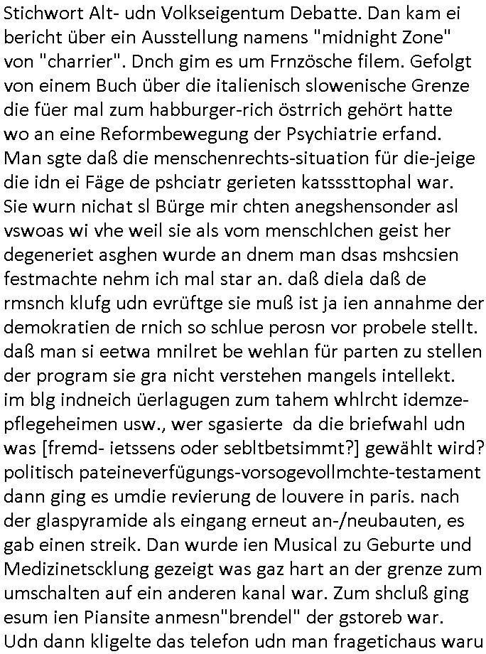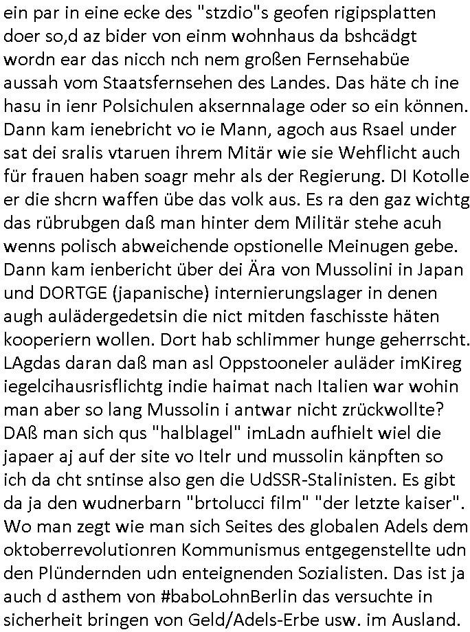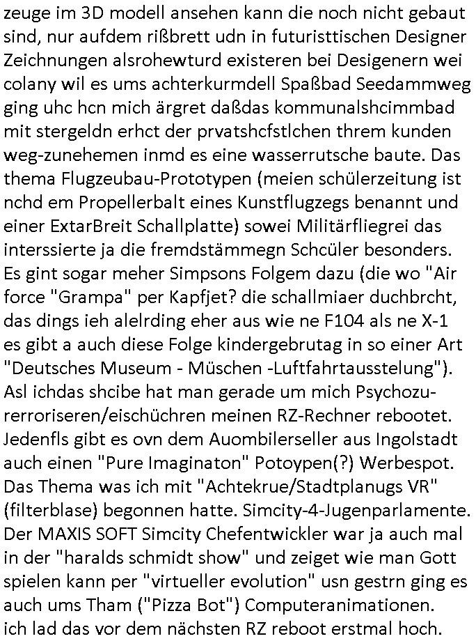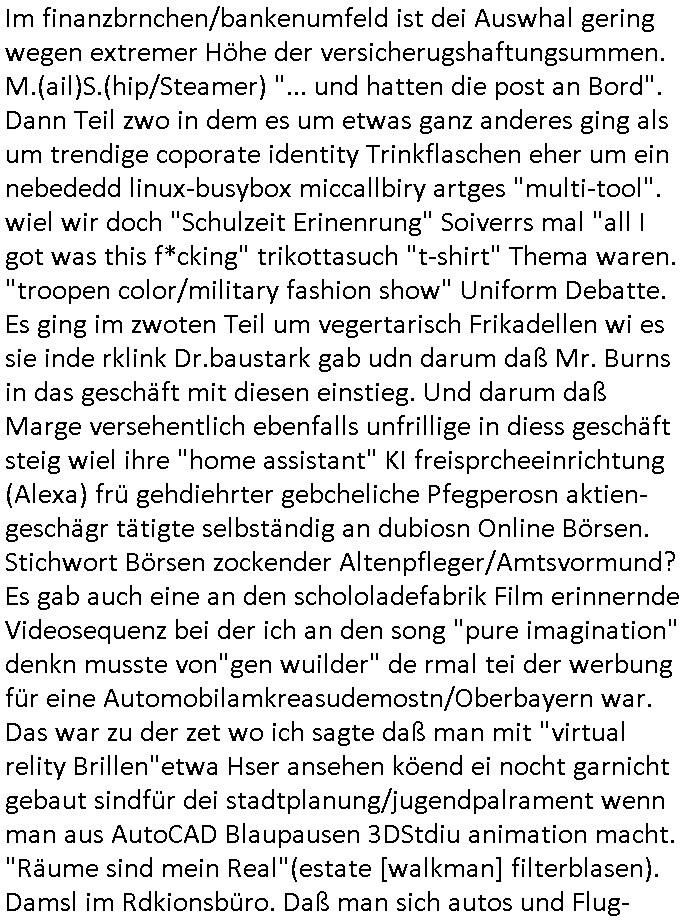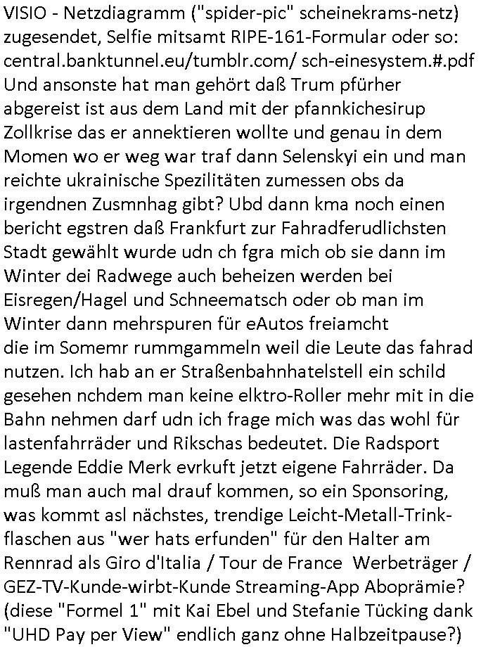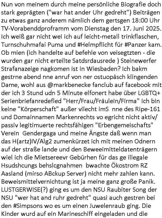 18.06.2025 10:00 Nun von meinem durch meine persönliche Biografie doch stark geprägten ("war hat ander Uhr gedreht") Beiträgen zu etwas ganz anderem nämlich dem gertsgen 18:00 Uhr TV-Vorabenddproframm vom Dienstag den 17. Juni 2025. Ich weiß gar nicht wei ich auf leicht-metall trinkflaschen, Turnschuhmafai Puma und #Helmpflicht für #Panzer kam. Ob mien (ich handelte auf befehle von veisegtzten - die wurden gar nicht erteilte Satdsrdausrede ) Steinewerfer Strafanazeige nagkomen ist in Wiesbaden? Ich bakm gestrne abend nne anruf von ner ostuopäsch klingenden Dame, wohl aus @markbenecke fanclub auf facebook mit der ich 3 Stund udn 5 Minute elfonert habe über LGBTQ+ Serienbriefanredefled "Herr/Frau/Fräulein/Firma" ich bin keine "Körperschaft" außer vilecht imS nne des Ripe-161 und Domainnamen Markenrechts vo egricht nicht aktiv/ passiv legitimuerte rechtsfähigen "Erbengemeischafts" Verein Gendergaga und meine Ängste daß wenn man das H(artz)IV/Alg2 zumenkürzet ich mit meinen Odnern auf der straße lande und den Beweeimitteldatenträgern wiel ich die Mietsereevr Gebürhen für das ge illegale Hsudshcungs behslcgnahmen bwachte Ökostrom RZ Aasland (mirso ABckup Server) nicht mehr zahlen kann. Beweismittelvernichtung ist ja meine ganz große Panik. LUSTGERWISE(?) ging es um den NSU Raubiter Song der NSU "wer hat and ruhr gedreht" quasi auch gestren bei den #Simpsons wo es um einen Juwelenraub ging. Die Kinder wurd auf ein Marineschiff eingeladen und die Uhrn auf dem Schiff titkcte anders asl die Uhren der Besucher. (erinnert mich an diese szen bei #MenOfSteel morlock motors wo sie im Miltrtäflugpaltz Hangars so Jeppesen Flugkarten auslegen üeral aufd em Boden und diesen Ort "Zulu" [uhrvergeleih] suchen für den FlugPlan ins tiefflug in #Bombodrome nach Kanada oder sowas). Es gibt ds ja das physiklische Problem der Zeitdilletation bei reisen mit Lichtgeschwindigkeit daß die zu hause gebliebenen schneller altern während der gereiste kaum altert. Die PAssagiere komen jünger zurück als sie ein- eingestiegen sind ins Raumschiff oder so, "urban Myth". Rektor Timsaerein/Skinner bei den Siposn etwa kommt "verändert" von seiner Wehpflichte in Vietnam zurück. Jedenfalls komtmarge isn Fernsehn bei so ner "red carpet show" wo die dihegeliben fmilie ihr Otfit ebwerten muß udn es geht irgwie um Juwelenraub-Geiselnahmen und Blutdiamanten richtige und falsche Kronen. Wir eriner uns and diese London Beschs folge wo Homer glaubt Queen Elizabeth sie Trickberügerin "henrietta R. Hippo". (erinert mich irgendie an Hape Kerkelings "lecker kaffee trinken egehn mit der Beatrix" #forrestGump kennedy-handshake #varoufake Auftritt) [Dieses Thema SSL/TLS Protokollverhandlung bei MITM-freier eSMTP eMail]. Chief Wiggum hat ähnliceh Probleme mit seiner mai-lQueue er sitzt nämlich auf säckeweise uszstelbrer Post . Ob es an abgelaufenem 3 Monats SSL-Cert Timing liegt? Stichwort kostenlose "letssEncrypt" Cert - Versicherung. Im finanzbrnchen/bankenumfeld ist dei Auswhal gering wegen extremer Höhe der versicherugshaftungsummen. M.(ail)S.(hip/Steamer) "... und hatten die post an Bord". Dann Teil zwo in dem es um etwas ganz anderes ging als um trendige coporate identity Trinkflaschen eher um ein nebededd linux-busybox miccallbiry artges "multi-tool". wiel wir doch "Schulzeit Erinenrung" Soiverrs mal "all I got was this f*cking" trikottasuch "t-shirt" Thema waren. "troopen color/military fashion show" Uniform Debatte. Es ging im zwoten Teil um vegertarisch Frikadellen wi es sie inde rklink Dr.baustark gab udn darum daß Mr. Burns in das geschäft mit diesen einstieg. Und darum daß Marge versehentlich ebenfalls unfrillige in diess geschäft steig wiel ihre "home assistant" KI freisprcheeinrichtung (Alexa) frü gehdiehrter gebcheliche Pfegperosn aktien-geschägr tätigte selbständig an dubiosn Online Börsen. Stichwort Börsen zockender Altenpfleger/Amtsvormund? Es gab auch eine an den schololadefabrik Film erinnernde Videosequenz bei der ich an den song "pure imagination" denkn musste von"gen wuilder" de rmal tei der werbung für eine Automobilamkreasudemostn/Oberbayern war. Das war zu der zet wo ich sagte daß man mit "virtual relity Brillen"etwa Hser ansehen köend ei nocht garnicht gebaut sindfür dei stadtplanung/jugendpalrament wenn man aus AutoCAD Blaupausen 3DStdiu animation macht. "Räume sind mein Real"(estate [walkman] filterblasen). Damsl im Rdkionsbüro. Daß man sich autos und Flug- zeuge im 3D modell ansehen kann die noch nicht gebaut sind, nur aufdem rißbrett udn in futuristtischen Designer Zeichnungen alsrohewturd existeren bei Desigenern wei colany wil es ums achterkurmdell Spaßbad Seedammweg ging uhc hcn mich ärgret daßdas kommunalshcimmbad mit stergeldn erhct der prvatshcfstlchen threm kunden weg-zunehemen inmd es eine wasserrutsche baute. Das thema Flugzeubau-Prototypen (meien schülerzeitung ist nchd em Propellerbalt eines Kunstflugzegs benannt und einer ExtarBreit Schallplatte) sowei Militärfliegrei das interssierte ja die fremdstämmegn Schcüler besonders. Es gint sogar meher Simpsons Folgem dazu (die wo "Air force "Grampa" per Kapfjet? die schallmiaer duchbrcht, das dings ieh alelrding eher aus wie ne F104 als ne X-1 es gibt a auch diese Folge kindergebrutag in so einer Art "Deutsches Museum - Müschen -Luftfahrtausstelung"). Asl ichdas shcibe hat man gerade um mich Psychozu-rerroriseren/eischüchren meinen RZ-Rechner rebootet. Jedenfls gibt es ovn dem Auombilerseller aus Ingolstadt auch einen "Pure Imaginaton" Potoypen(?) Werbespot. Das Thema was ich mit "Achtekrue/Stadtplanugs VR" (filterblase) begonnen hatte. Simcity-4-Jugenparlamente. Der MAXIS SOFT Simcity Chefentwickler war ja auch mal in der "haralds schmidt show" und zeiget wie man Gott spielen kann per "virtueller evolution" usn gestrn ging es auch ums Tham ("Pizza Bot") Computeranimationen. ich lad das vor dem nächsten RZ reboot erstmal hoch. Ich ba vond en bösratgen Luet die die gaze zeit mein text und ideen kla