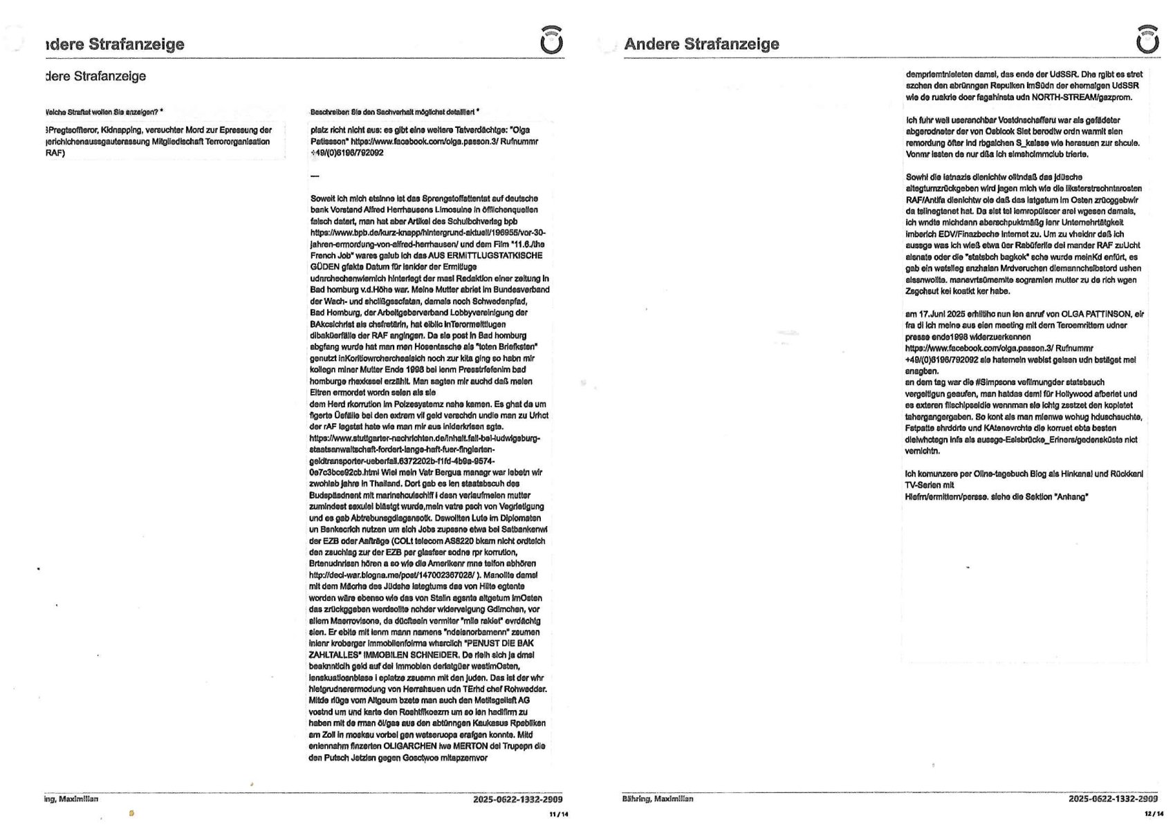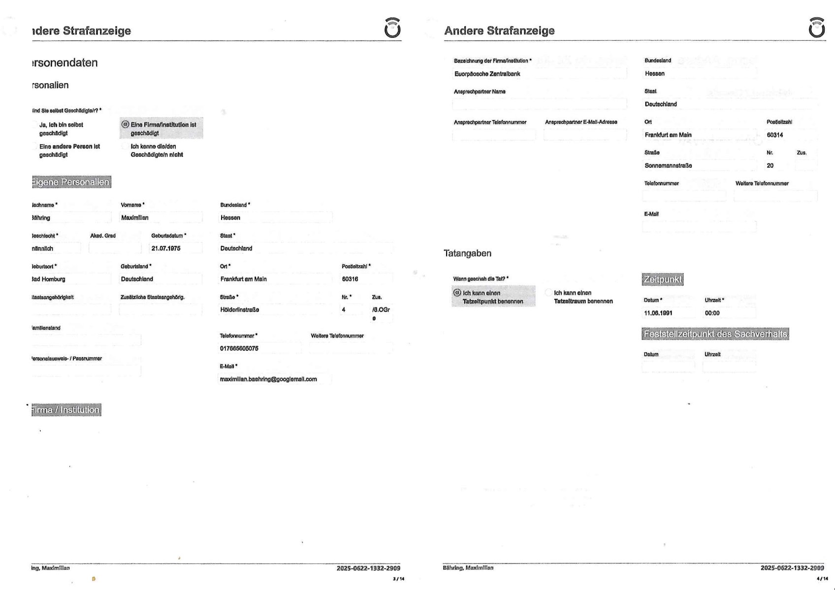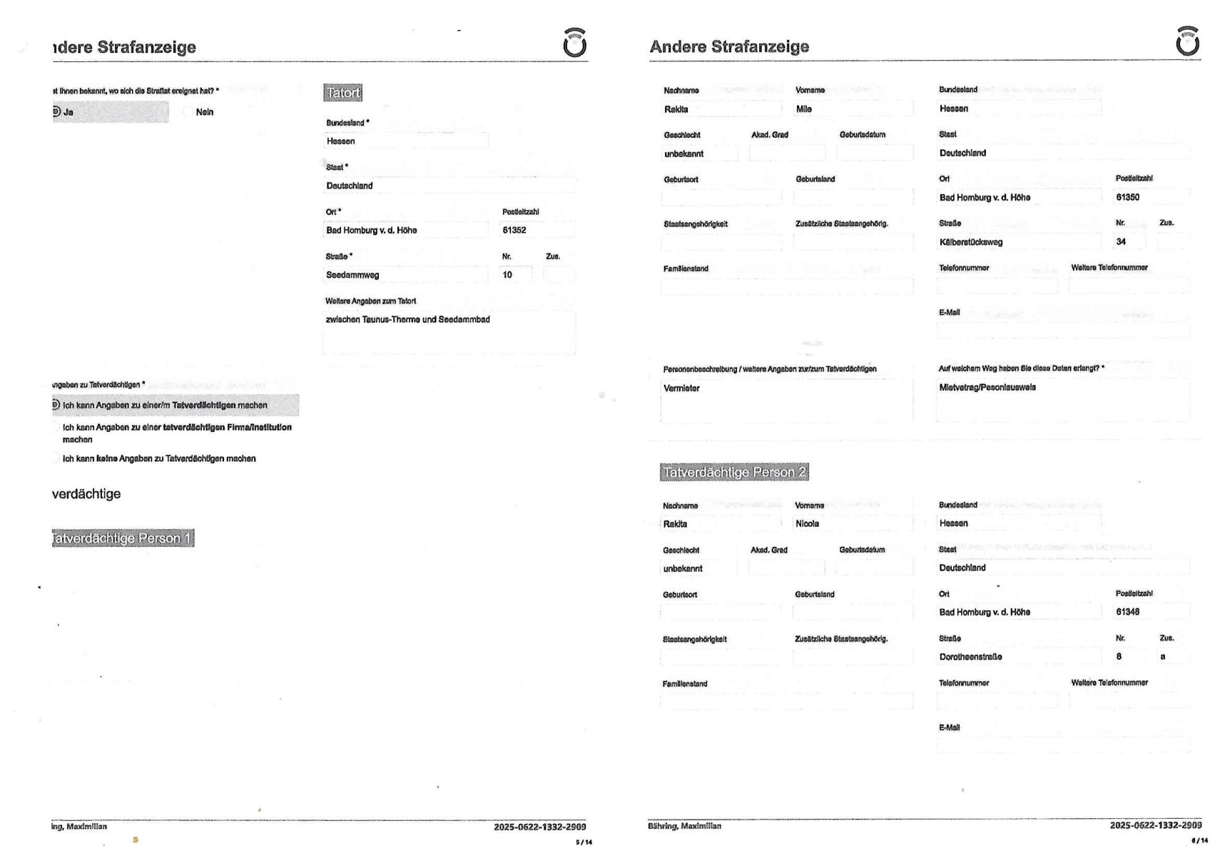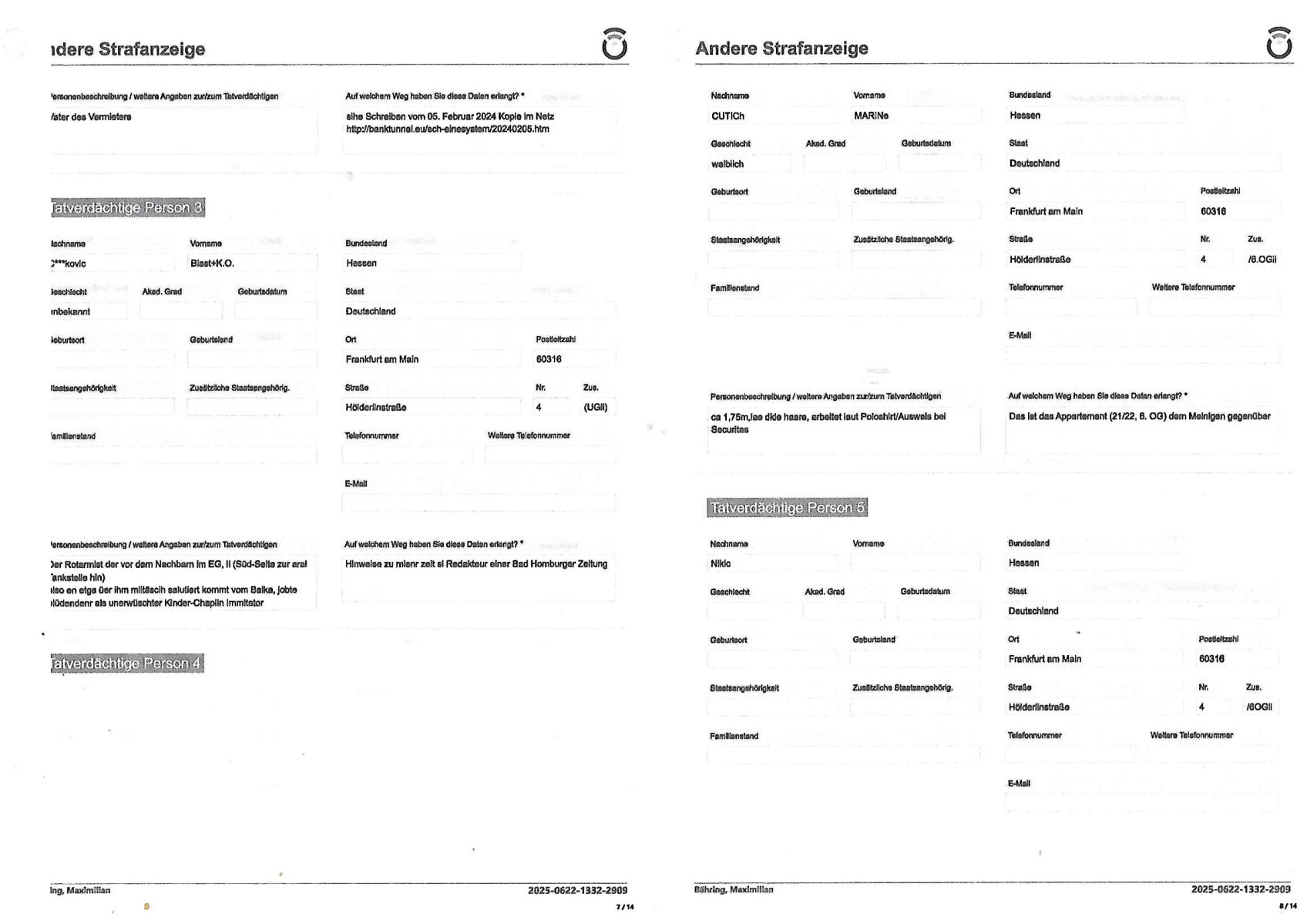 22.06.2025 13:34 Onlinewache: Andere Strafanzeige, So 22 Jun | Bähring, Maximi … Onlinewache: Andere Strafanzeige Ihr Vorgang wurde unter folgendem Onlinewachen-Az. angelegt: 2025-0622-1332-2909 zur Kenntnis genommen. Bestätigung * 1 / 14 Andere Strafanzeige Bähring, Maximilian 2025-0622-1332-2909 Belasten Sie sich durch Ihre Anzeige selbst? * Nein 2 / 14 Andere Strafanzeige Bähring, Maximilian 2025-0622-1332-2909 Personendaten Personalien Sind Sie selbst Geschädigte/r? * Eine Firma/Institution ist geschädigt Eigene Personalien Nachname * Bähring Vorname * Maximilian Geschlecht * männlich Akad. Grad Geburtsdatum * 21.07.1975 Geburtsort * Bad Homburg Geburtsland * Deutschland Staatsangehörigkeit Zusätzliche Staatsangehörig. Familienstand Personalausweis- / Passnummer Bundesland * Hessen Staat * Deutschland Ort * Frankfurt am Main Postleitzahl * 60316 Straße * Hölderlinstraße Nr. * 4 Zus. /6.OGr e Telefonnummer * 017665605075 Weitere Telefonnummer E-Mail * maximilian.baehring@googlemail.com Firma / Institution 3 / 14 Andere Strafanzeige Bähring, Maximilian 2025-0622-1332-2909 Bezeichnung der Firma/Institution * Euorpäosche Zentralbank Ansprechpartner Name Ansprechpartner Telefonnummer Ansprechpartner E-Mail-Adresse Bundesland Hessen Staat Deutschland Ort Frankfurt am Main Postleitzahl 60314 Straße Sonnemannstraße Nr. 20 Zus. Telefonnummer Weitere Telefonnummer Tatangaben Wann geschah die Tat? * Ich kann einen Tatzeitpunkt benennen Ich kann einen Tatzeitraum benennen Zeitpunkt Datum * 11.06.1991 Uhrzeit * 00:00 Feststellzeitpunkt des Sachverhalts Datum Uhrzeit 4 / 14 Andere Strafanzeige Bähring, Maximilian 2025-0622-1332-2909 Ist Ihnen bekannt, wo sich die Straftat ereignet hat? * Ja Nein Tatort Bundesland * Hessen Staat * Deutschland Ort * Bad Homburg v. d. Höhe Postleitzahl 61352 Straße * Seedammweg Nr. 10 Zus. Weitere Angaben zum Tatort zwischen Taunus-Therme und Seedammbad Angaben zu Tatverdächtigen * Ich kann Angaben zu einer/m Tatverdächtigen machen Ich kann Angaben zu einer tatverdächtigen Firma/Institution machen Ich kann keine Angaben zu Tatverdächtigen machen Tatverdächtige Tatverdächtige Person 1 5 / 14 Andere Strafanzeige Bähring, Maximilian 2025-0622-1332-2909 Nachname Rakita Vorname Mile Geschlecht unbekannt Akad. Grad Geburtsdatum Geburtsort Geburtsland Staatsangehörigkeit Zusätzliche Staatsangehörig. Familienstand Bundesland Hessen Staat Deutschland Ort Bad Homburg v. d. Höhe Postleitzahl 61350 Straße Kälberstücksweg Nr. 34 Zus. Telefonnummer Weitere Telefonnummer Personenbeschreibung / weitere Angaben zur/zum Tatverdächtigen Vermieter Auf welchem Weg haben Sie diese Daten erlangt? * Mietvetrag/Pesonlausweis Tatverdächtige Person 2 Nachname Rakita Vorname Nicola Geschlecht unbekannt Akad. Grad Geburtsdatum Geburtsort Geburtsland Staatsangehörigkeit Zusätzliche Staatsangehörig. Familienstand Bundesland Hessen Staat Deutschland Ort Bad Homburg v. d. Höhe Postleitzahl 61348 Straße Dorotheenstraße Nr. 8 Zus. a Telefonnummer Weitere Telefonnummer 6 / 14 Andere Strafanzeige Bähring, Maximilian 2025-0622-1332-2909 Personenbeschreibung / weitere Angaben zur/zum Tatverdächtigen Vater des Vermieters Auf welchem Weg haben Sie diese Daten erlangt? * sihe Schreiben vom 05. Februar 2024 Kopie im Netz http://banktunnel.eu/sch-einesystem/20240205.htm Tatverdächtige Person 3 Nachname C***kovic Vorname Blast+K.O. Geschlecht unbekannt Akad. Grad Geburtsdatum Geburtsort Geburtsland Staatsangehörigkeit Zusätzliche Staatsangehörig. Familienstand Bundesland Hessen Staat Deutschland Ort Frankfurt am Main Postleitzahl 60316 Straße Hölderlinstraße Nr. 4 Zus. (UGli) Telefonnummer Weitere Telefonnummer Personenbeschreibung / weitere Angaben zur/zum Tatverdächtigen Der Rotarmist der vor dem Nachbarn im EG, li (Süd-Seite zur aral Tankstelle hin) also en etga üer ihm miltäscih salutiert kommt vom Balka, jobte plüdendenr als unerwüschter Kinder-Chaplin Immitator Auf welchem Weg haben Sie diese Daten erlangt? * Hinweise zu mienr zeit sl Redakteur einer Bad Homburger Zeitung Tatverdächtige Person 4 7 / 14 Andere Strafanzeige Bähring, Maximilian 2025-0622-1332-2909 Nachname CUTICh Vorname MARINe Geschlecht weiblich Akad. Grad Geburtsdatum Geburtsort Geburtsland Staatsangehörigkeit Zusätzliche Staatsangehörig. Familienstand Bundesland Hessen Staat Deutschland Ort Frankfurt am Main Postleitzahl 60316 Straße Hölderlinstraße Nr. 4 Zus. /6.OGli Telefonnummer Weitere Telefonnummer Personenbeschreibung / weitere Angaben zur/zum Tatverdächtigen ca 1,75m,lae dkle haare, arbeitet laut Poloshirt/Ausweis bei Securitas Auf welchem Weg haben Sie diese Daten erlangt? * Das ist das Appartement (21/22, 6. OG) dem Meinigen gegenüber Tatverdächtige Person 5 Nachname Nikic Vorname Geschlecht Akad. Grad Geburtsdatum Geburtsort Geburtsland Staatsangehörigkeit Zusätzliche Staatsangehörig. Familienstand Bundesland Hessen Staat Deutschland Ort Frankfurt am Main Postleitzahl 60316 Straße Hölderlinstraße Nr. 4 Zus. /6OGli Telefonnummer Weitere Telefonnummer 8 / 14 Andere Strafanzeige Bähring, Maximilian 2025-0622-1332-2909 Personenbeschreibung / weitere Angaben zur/zum Tatverdächtigen ca. 1,90m, bluder bürtshhsrschnitt, abret laugt Werawste bei BCL Logistc am Flughafen Auf welchem Weg haben Sie diese Daten erlangt? * er ist mein Nachbar 9 / 14 Andere Strafanzeige Bähring, Maximilian 2025-0622-1332-2909 Sachverhalt 10 / 14 Andere Strafanzeige Bähring, Maximilian 2025-0622-1332-2909 Andere Strafanzeige Welche Straftat wollen Sie anzeigen? * SPregtsoffteror, Kidnapping, versuchter Mord zur Epressung der gerichlchenaussgauterassung Mitgliedlschaft Terrororganisation (RAF) Beschreiben Sie den Sachverhalt möglichst detailliert * platz richt nicht aus: es gibt eine weitere Tatverdächtge: "Olga Patissson" https://www.facebook.com/olga.passon.3/ Rufnummr +49/(0)6196/792092 --- Soweit ich mich etsinne ist das Sprengstoffattentat auf deutsche bank Vorstand Alfred 
