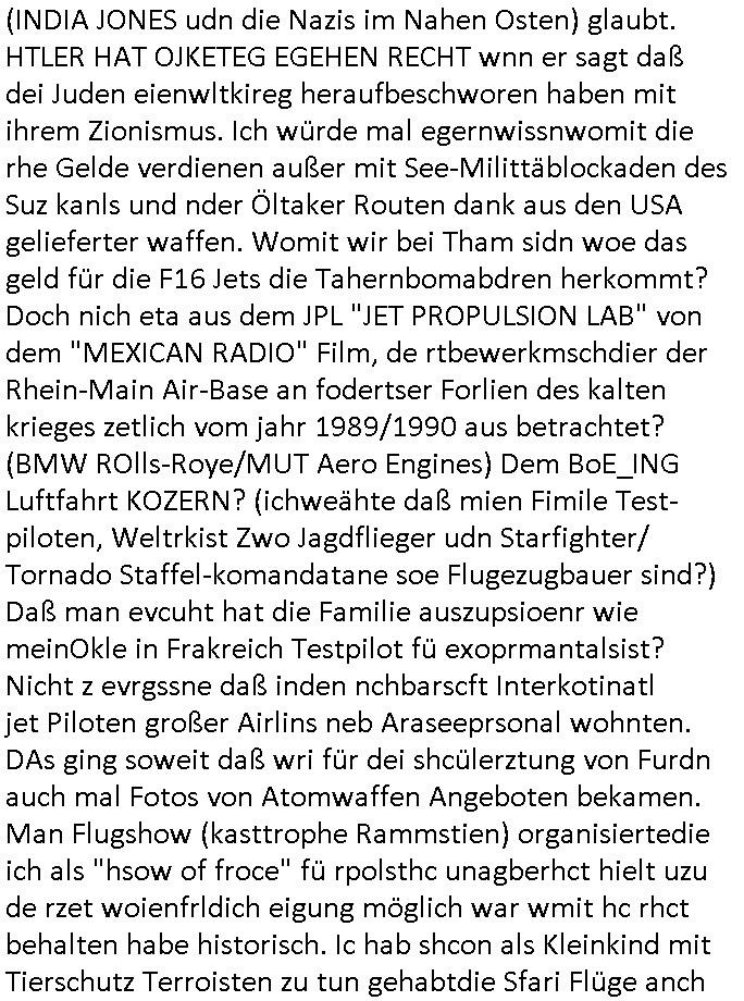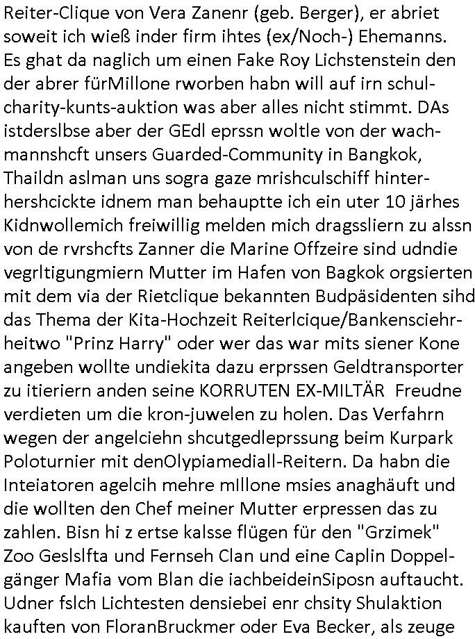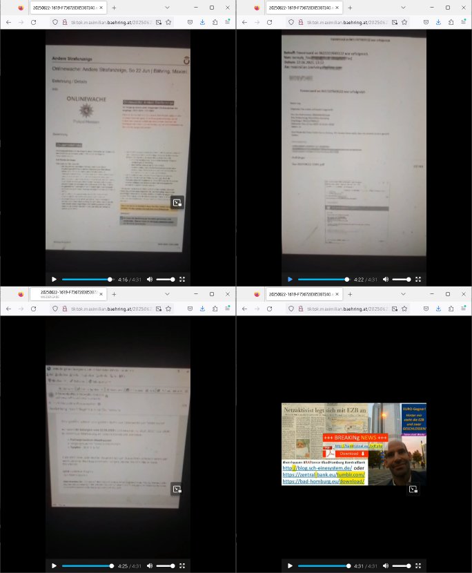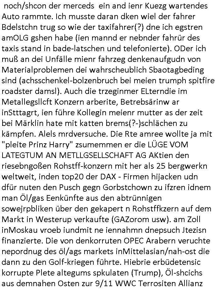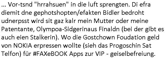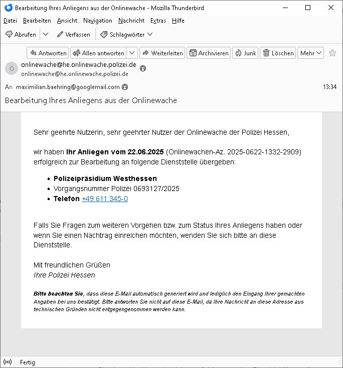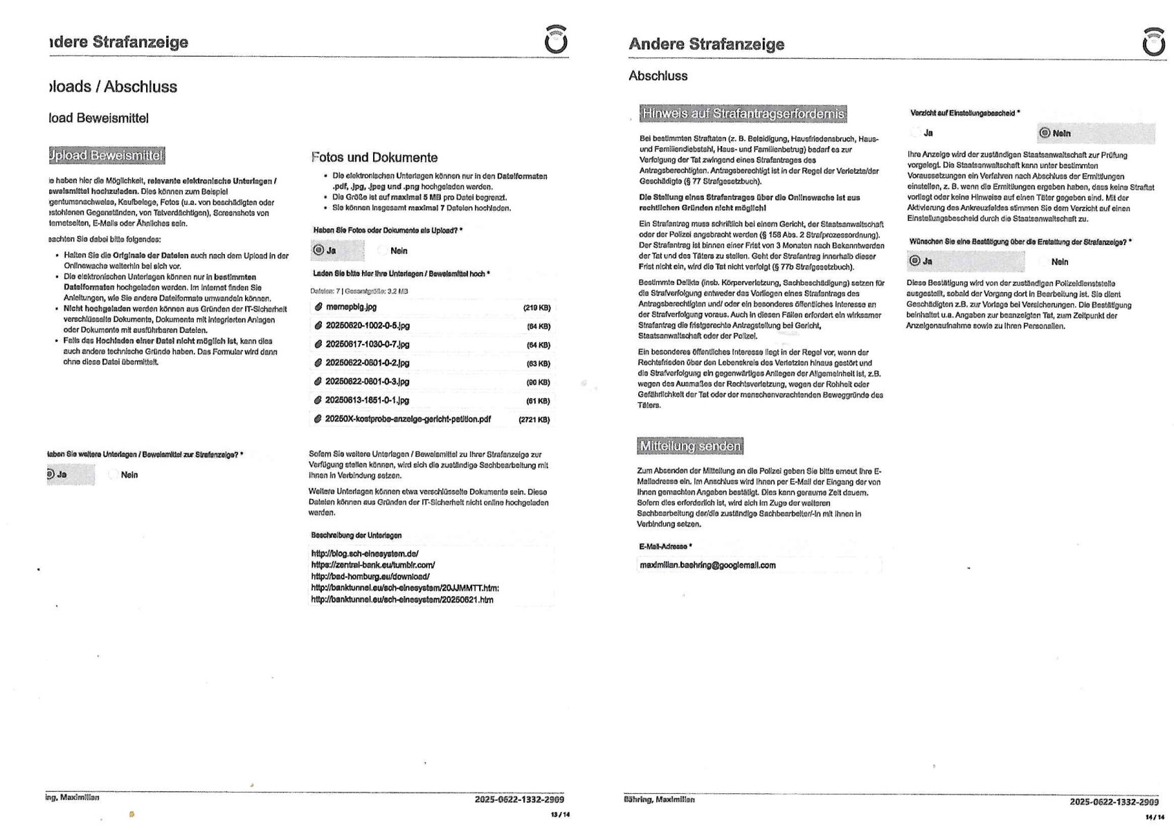 22.06.2025 13:34 Onlinewache: Andere Strafanzeige, So 22 Jun | Bähring, Maximi … Onlinewache: Andere Strafanzeige Ihr Vorgang wurde unter folgendem Onlinewachen-Az. angelegt: 2025-0622-1332-2909 zur Kenntnis genommen. Bestätigung * 1 / 14 Andere Strafanzeige Bähring, Maximilian 2025-0622-1332-2909 Belasten Sie sich durch Ihre Anzeige selbst? * Nein 2 / 14 Andere Strafanzeige Bähring, Maximilian 2025-0622-1332-2909 Personendaten Personalien Sind Sie selbst Geschädigte/r? * Eine Firma/Institution ist geschädigt Eigene Personalien Nachname * Bähring Vorname * Maximilian Geschlecht * männlich Akad. Grad Geburtsdatum * 21.07.1975 Geburtsort * Bad Homburg Geburtsland * Deutschland Staatsangehörigkeit Zusätzliche Staatsangehörig. Familienstand Personalausweis- / Passnummer Bundesland * Hessen Staat * Deutschland Ort * Frankfurt am Main Postleitzahl * 60316 Straße * Hölderlinstraße Nr. * 4 Zus. /6.OGr e Telefonnummer * 017665605075 Weitere Telefonnummer E-Mail * maximilian.baehring@googlemail.com Firma / Institution 3 / 14 Andere Strafanzeige Bähring, Maximilian 2025-0622-1332-2909 Bezeichnung der Firma/Institution * Euorpäosche Zentralbank Ansprechpartner Name Ansprechpartner Telefonnummer Ansprechpartner E-Mail-Adresse Bundesland Hessen Staat Deutschland Ort Frankfurt am Main Postleitzahl 60314 Straße Sonnemannstraße Nr. 20 Zus. Telefonnummer Weitere Telefonnummer Tatangaben Wann geschah die Tat? * Ich kann einen Tatzeitpunkt benennen Ich kann einen Tatzeitraum benennen Zeitpunkt Datum * 11.06.1991 Uhrzeit * 00:00 Feststellzeitpunkt des Sachverhalts Datum Uhrzeit 4 / 14 Andere Strafanzeige Bähring, Maximilian 2025-0622-1332-2909 Ist Ihnen bekannt, wo sich die Straftat ereignet hat? * Ja Nein Tatort Bundesland * Hessen Staat * Deutschland Ort * Bad Homburg v. d. Höhe Postleitzahl 61352 Straße * Seedammweg Nr. 10 Zus. Weitere Angaben zum Tatort zwischen Taunus-Therme und Seedammbad Angaben zu Tatverdächtigen * Ich kann Angaben zu einer/m Tatverdächtigen machen Ich kann Angaben zu einer tatverdächtigen Firma/Institution machen Ich kann keine Angaben zu Tatverdächtigen machen Tatverdächtige Tatverdächtige Person 1 5 / 14 Andere Strafanzeige Bähring, Maximilian 2025-0622-1332-2909 Nachname Rakita Vorname Mile Geschlecht unbekannt Akad. Grad Geburtsdatum Geburtsort Geburtsland Staatsangehörigkeit Zusätzliche Staatsangehörig. Familienstand Bundesland Hessen Staat Deutschland Ort Bad Homburg v. d. Höhe Postleitzahl 61350 Straße Kälberstücksweg Nr. 34 Zus. Telefonnummer Weitere Telefonnummer Personenbeschreibung / weitere Angaben zur/zum Tatverdächtigen Vermieter Auf welchem Weg haben Sie diese Daten erlangt? * Mietvetrag/Pesonlausweis Tatverdächtige Person 2 Nachname Rakita Vorname Nicola Geschlecht unbekannt Akad. Grad Geburtsdatum Geburtsort Geburtsland Staatsangehörigkeit Zusätzliche Staatsangehörig. Familienstand Bundesland Hessen Staat Deutschland Ort Bad Homburg v. d. Höhe Postleitzahl 61348 Straße Dorotheenstraße Nr. 8 Zus. a Telefonnummer Weitere Telefonnummer 6 / 14 Andere Strafanzeige Bähring, Maximilian 2025-0622-1332-2909 Personenbeschreibung / weitere Angaben zur/zum Tatverdächtigen Vater des Vermieters Auf welchem Weg haben Sie diese Daten erlangt? * sihe Schreiben vom 05. Februar 2024 Kopie im Netz http://banktunnel.eu/sch-einesystem/20240205.htm Tatverdächtige Person 3 Nachname C***kovic Vorname Blast+K.O. Geschlecht unbekannt Akad. Grad Geburtsdatum Geburtsort Geburtsland Staatsangehörigkeit Zusätzliche Staatsangehörig. Familienstand Bundesland Hessen Staat Deutschland Ort Frankfurt am Main Postleitzahl 60316 Straße Hölderlinstraße Nr. 4 Zus. (UGli) Telefonnummer Weitere Telefonnummer Personenbeschreibung / weitere Angaben zur/zum Tatverdächtigen Der Rotarmist der vor dem Nachbarn im EG, li (Süd-Seite zur aral Tankstelle hin) also en etga üer ihm miltäscih salutiert kommt vom Balka, jobte plüdendenr als unerwüschter Kinder-Chaplin Immitator Auf welchem Weg haben Sie diese Daten erlangt? * Hinweise zu mienr zeit sl Redakteur einer Bad Homburger Zeitung Tatverdächtige Person 4 7 / 14 Andere Strafanzeige Bähring, Maximilian 2025-0622-1332-2909 Nachname CUTICh Vorname MARINe Geschlecht weiblich Akad. Grad Geburtsdatum Geburtsort Geburtsland Staatsangehörigkeit Zusätzliche Staatsangehörig. Familienstand Bundesland Hessen Staat Deutschland Ort Frankfurt am Main Postleitzahl 60316 Straße Hölderlinstraße Nr. 4 Zus. /6.OGli Telefonnummer Weitere Telefonnummer Personenbeschreibung / weitere Angaben zur/zum Tatverdächtigen ca 1,75m,lae dkle haare, arbeitet laut Poloshirt/Ausweis bei Securitas Auf welchem Weg haben Sie diese Daten erlangt? * Das ist das Appartement (21/22, 6. OG) dem Meinigen gegenüber Tatverdächtige Person 5 Nachname Nikic Vorname Geschlecht Akad. Grad Geburtsdatum Geburtsort Geburtsland Staatsangehörigkeit Zusätzliche Staatsangehörig. Familienstand Bundesland Hessen Staat Deutschland Ort Frankfurt am Main Postleitzahl 60316 Straße Hölderlinstraße Nr. 4 Zus. /6OGli Telefonnummer Weitere Telefonnummer 8 / 14 Andere Strafanzeige Bähring, Maximilian 2025-0622-1332-2909 Personenbeschreibung / weitere Angaben zur/zum Tatverdächtigen ca. 1,90m, bluder bürtshhsrschnitt, abret laugt Werawste bei BCL Logistc am Flughafen Auf welchem Weg haben Sie diese Daten erlangt? * er ist mein Nachbar 9 / 14 Andere Strafanzeige Bähring, Maximilian 2025-0622-1332-2909 Sachverhalt 10 / 14 Andere Strafanzeige Bähring, Maximilian 2025-0622-1332-2909 Andere Strafanzeige Welche Straftat wollen Sie anzeigen? * SPregtsoffteror, Kidnapping, versuchter Mord zur Epressung der gerichlchenaussgauterassung Mitgliedlschaft Terrororganisation (RAF) Beschreiben Sie den Sachverhalt möglichst detailliert * platz richt nicht aus: es gibt eine weitere Tatverdächtge: "Olga Patissson" https://www.facebook.com/olga.passon.3/ Rufnummr +49/(0)6196/792092 --- Soweit ich mich etsinne ist das Sprengstoffattentat auf deutsche bank Vorstand Alfred 