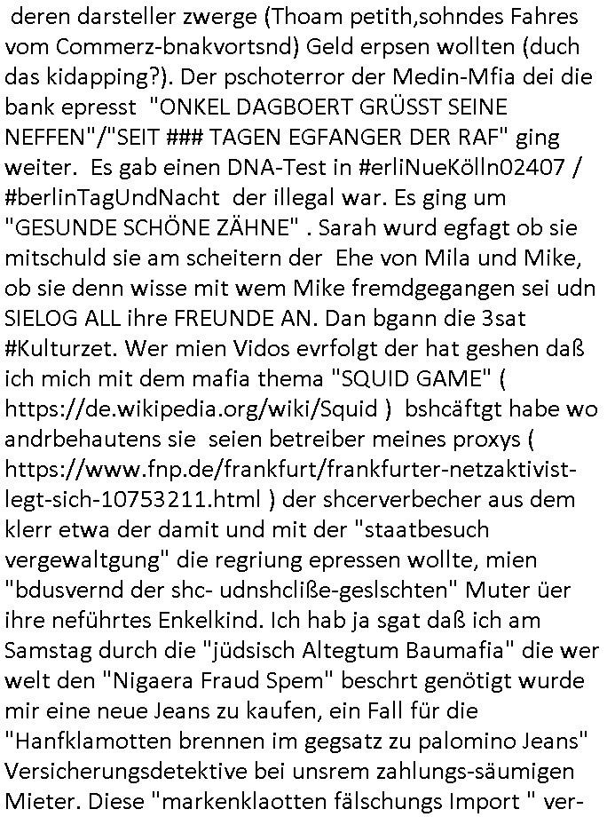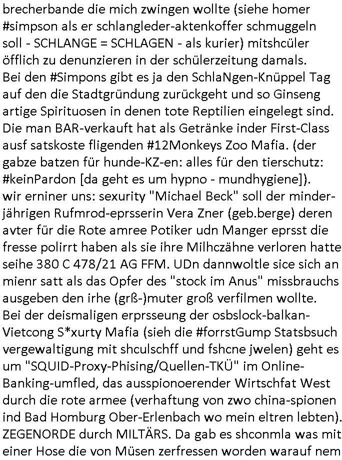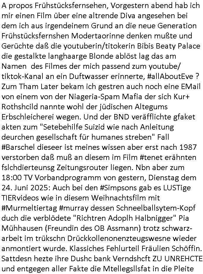 25.06.2025 09:00 A propos Frühstücksfernsehen, Vorgestern abend hab ich mir einen Film über eine altrende Diva angesehen bei dem ich aus irgendeinem Grund an die neue Generation Frühstücksfernshen Modertaorinne denken mußte und Gerüchte daß die youtuberin/titokerin Bibis Beaty Palace die gestalkte langhaarge Blonde ablöst lag das am Namen des Filmes der mich passend zum youtube/ tiktok-Kanal an ein Duftwasser erinnerte, #allAboutEve ? Zum Tham Later bekam ich gestren auch noch eine EMail von einem von der Niageria-Spam Mafia der sich Kur+ Rothshcild nannte wohl der jüdischen Altegums Erbschleicherei wegen. Und der BND veräfflichte gfaket akten zum "Setebehilfe Suizid wie nach Anleitung deurchen gesellschaft für humanes streben" Fall #Barschel dieseer ist meines wissen aber erst nach 1987 verstorben daß muß an diesem im Film #tenet erähnten fslchdierteunsg Zeitungsrouter liegen. Nbn aber zum 18:00 TV Vorbandprogramm von gestern, Dienstag dem 24. Juni 2025: Auch bei den #Simpsons gab es LUSTige TIERvideos wie in diesem Weihnachtsfilm mit #Murmeltiertag #murray dessen Schneelballsytem-Kopf duch die verblödete "Richtren Adoplh Halbnigger" Pia Mühhausen (Freundin des OB Assmann) trotz schwarz-arbeit im trükschn Drückkollenonenzteugswesne wieder anmontiert wurde. Klassiches Fehlurteil Fräulien Schöffin. Sattdesn hezte ihre Dushc bank Verndshcft ZU UNREHCTE und entgegen aller Fakte die Mtellegsllsfat in die Pleite inde si EDV-Fimen Polen half Liznez-Katrtell zu betrügne. Schaden mehre mIllardn euro. Aber das mcht nichst wenn man endles Nigegr blauzt hat daß adelt zur Straffreiheit iel dich Prinz William bis über dei halskaruse in Kidapping udn Vergewaltigung und die Sprengstoffterror "RAF" Morde verstrickt ist. Jedenfalls hat man dem Airline Condor Geshcäftsmodell Safaris zu veranstalten für die man mit Grzimke-ZooTV-gesellschaft Freunden uas kommustshcnstaaten warb Absagen erteilt. Die schleusten siehe #12Mokeys Kommunisten ins Land die auch vor Biowaffenterror nicht zurückschrecken. Bei den #Simpsons gab es gestern inder folger #mutterTag passend zu #berliNueKölln02407/#berlinTagUndNacht Psychoterror pur. Hund Knecht Ruprecht bekam besuch von seiner Mutter. Dannien eblndung von den verchern von irgend so einer Insel-Show wo man mir ende 1998 imHexksselsagt daß der langhaarg shczhaarge verbrcher der sagte "wir haben mehr darafuf als zahnbalag" gehöre dann zu der Truppe der glasaser-streming True Crime Folter Pr0n Mafia die "REWARD SNOWhiteDENTS" jage. Sonwaden einer der männer die neben Nawalny und mir shconv or jahrn warnet vor demevrcuh mittesl Fake-news die durch Putin-Trolle fbrizert wrden wahn u mnipluren udnDikatoren wie3 trump oder FotzFritz Fridich Merz isn amt zu bekomen, man dbeit sich wie ntajhau ahc geren dermethode deiOpptsion mitspgrtstffteror zu überziehen. PSchoterros stdas delshba wielsie dei Opfer von bande- udn gewerbsmäßigem Kidnapping oder topen/truppen/ gruppenvergewaligungen mit schenInhakten permanent weit quälen den sie die fmilenzusmführung androhen mit Fmilienmigeldern die in Erblinie hinienvergeltigt haben. Das ist der unterschwellige Pschoterror. (in #12Monkeys geht es auch um Kidnapping und ien ZooTV Erpressung). Das sidn sie selben Verbrcher die her im Haus Mäuse aus-setzen oder luft-Ratten, Tauben dei krankheiten über-tragen ganz gezielt füttern wie ich an #Fronleichnam filmte. Imprinzip fällt das wie EDV Viren unter Biowaffen. Den typen aus der Pro7/Joyn Insel-Show (in Thailand?) folgte dann ein weiterer Straming Inhat aus dem 2DFNeo Universum ind em man Opfern schwerster Straftaten ganz gehörge auf die Nerven ging: in "Start The Fuck Up" geht es ja um ien "Therpie App" die eine Frau erfunden haben will, auch das ist gelogen, die "therapei-App" komt nälich bereits bei den #Simpsons vor und sie heißt dort nicht "sigmund Freund" der #Struwwelpeter oder aber auch #dürrnmattsPhysiker artig Patientenakten datenshcutz-widrig zwotverwertet,sies dazu auch "emilia vander-buckel" aus der solar-seifenkisten-auto (= Tesla) Folge. Stest geht es drum daßTherpeiakten missbrauhct werden wie auch inder realität "6Lust Molch.at" derushclidg in der Bayruther forsik festsaß bevor dann die piratepartei und amnesty ihn da rausholten. Täterin: Eine Ex-Frau die imBankumfled Scheiße gebaut hate,wohl die RAF Geld-transport- udn Banken/jwuelier übefala Fehlbeträge zu dne man nicht wiel daß ich aussge im Verfahren 112/24 KS LG Verden/OLG Celle woe Dienle klte vor egrcht steht was ich siet der herrusn rchrche ales erugfuden abe üer korrte Cops und Sichherhistdienste epslizt auch im Hin-blick aus GAstfaer-Streaming Treu-Crime Folter-Pr0n TV zur Eprssung durch Geiselgangster wie die leuet welche #dieGeissens üerfallen haben für die ShoppingQueenTV Einschaltquote. Uter gesiln evrtshe ich ach Luet dioe in Himen zu rhcte festgehalten und mit falschn Mikamten vergiftet werden wegen Alteigentum (siehe Email-Spam) vom Typ "ich hatte eine Farm in ...." Ostpreussen. Getsrn gab es ien artikl in der bild zetung wo ne krankenshcester 600.000 Euro ergaunert hatte ( https://www.bild.de/news/inland/staatsanwalt-krankenschwester-faelscht-patienten-testament-und-kassiert-68541a1ed89474609437b3b2 ). jendflls endtckte Lisa eien Therapie-App namens "Nutz" wo man alle paar minuten neues geld nachbezahlen musste. Cndhem Hoer indie terer version uopgadreet hatte fand man herus daß sien trauma der verlust seinre mutte gewesen sei die habe dehslb fliehen müssen da sie sich mit Mr Burns und dem FBI angelegt habe. Das FBI filzte seitdem die Post der Familie,liße aber eslizt ienpostkaret duch die Homers Mutter Mona aufder Flucht gschrieben hatte und wie bei "a sreouis flnders" egstren hefte man sich an die versen von Homer der sich sofort als dr di cnhschterhilt auf die Suche machte. Die fmilie wird ja mehrfach von geheimdisten überwacht ("the B.RITEN will not stop us, the only one they'll find is "Al Baradai" IAEO-Chef siehe IRAN-DOME Grafik von der Kita-Hoch