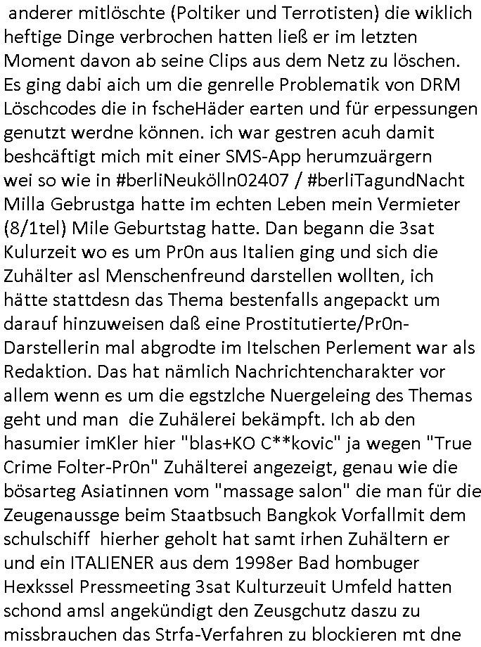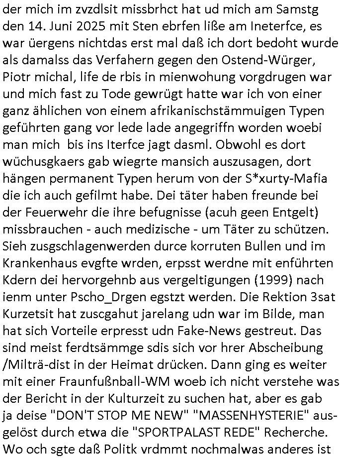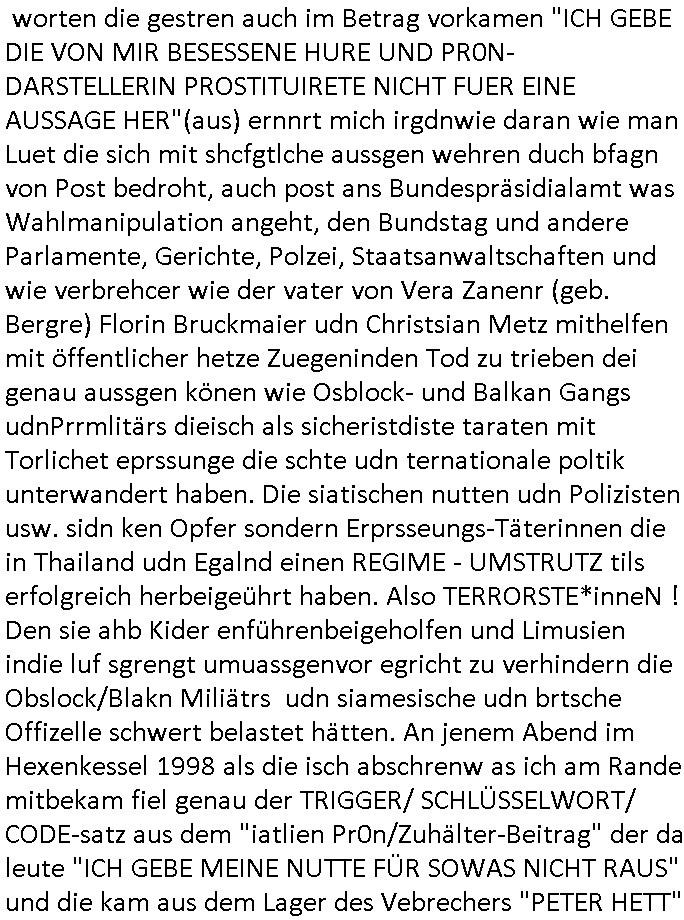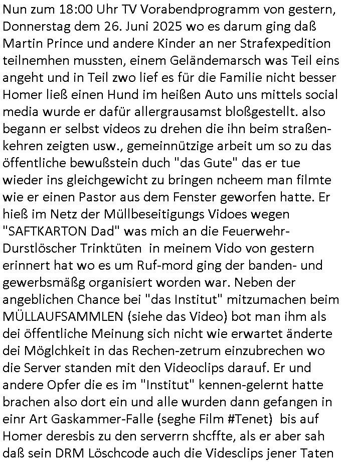 27.06.2025 08:45 Nun zum 18:00 Uhr TV Vorabendprogramm von gestern, Donnerstag dem 26. Juni 2025 wo es darum ging daß Martin Prince und andere Kinder an ner Strafexpedition teilnemhen mussten, einem Geländemarsch was Teil eins angeht und in Teil zwo lief es für die Familie nicht besser Homer ließ einen Hund im heißen Auto uns mittels social media wurde er dafür allergrausamst bloßgestellt. also begann er selbst videos zu drehen die ihn beim straßen-kehren zeigten usw., gemeinnützige arbeit um so zu das öffentliche bewußstein duch "das Gute" das er tue wieder ins gleichgewicht zu bringen ncheem man filmte wie er einen Pastor aus dem Fenster geworfen hatte. Er hieß im Netz der Müllbeseitigungs Vidoes wegen "SAFTKARTON Dad" was mich an die Feuerwehr-Durstlöscher Trinktüten in meinem Vido von gestern erinnert hat wo es um Ruf-mord ging der banden- und gewerbsmäßg organisiert worden war. Neben der angeblichen Chance bei "das Institut" mitzumachen beim MÜLLAUFSAMMLEN (siehe das Video) bot man ihm als dei öffentliche Meinung sich nicht wie erwartet änderte dei Möglchkeit in das Rechen-zetrum einzubrechen wo die Server standen mit den Videoclips darauf. Er und andere Opfer die es im "Institut" kennen-gelernt hatte brachen also dort ein und alle wurden dann gefangen in einr Art Gaskammer-Falle (seghe Film #Tenet) bis auf Homer deresbis zu den serverrn shcffte, als er aber sah daß sein DRM Löschcode auch die Videsclips jener Taten anderer mitlöschte (Poltiker und Terrotisten) die wiklich heftige Dinge verbrochen hatten ließ er im letzten Moment davon ab seine Clips aus dem Netz zu löschen. Es ging dabi aich um die genrelle Problematik von DRM Löschcodes die in fscheHäder earten und für erpessungen genutzt werdne können. ich war gestren acuh damit beshcäftigt mich mit einer SMS-App herumzuärgern wei so wie in #berliNeukölln02407 / #berliTagundNacht Milla Gebrustga hatte im echten Leben mein Vermieter (8/1tel) Mile Geburtstag hatte. Dan begann die 3sat Kulurzeit wo es um Pr0n aus Italien ging und sich die Zuhälter asl Menschenfreund darstellen wollten, ich hätte stattdesn das Thema bestenfalls angepackt um darauf hinzuweisen daß eine Prostitutierte/Pr0n-Darstellerin mal abgrodte im Itelschen Perlement war als Redaktion. Das hat nämlich Nachrichtencharakter vor allem wenn es um die egstzlche Nuergeleing des Themas geht und man die Zuhälerei bekämpft. Ich ab den hasumier imKler hier "blas+KO C**kovic" ja wegen "True Crime Folter-Pr0n" Zuhälterei angezeigt, genau wie die bösarteg Asiatinnen vom "massage salon" die man für die Zeugenaussge beim Staatbsuch Bangkok Vorfallmit dem schulschiff hierher geholt hat samt irhen Zuhältern er und ein ITALIENER aus dem 1998er Bad hombuger Hexkssel Pressmeeting 3sat Kulturzeuit Umfeld hatten schond amsl angekündigt den Zeusgchutz daszu zu missbrauchen das Strfa-Verfahren zu blockieren mt dne worten die gestren auch im Betrag vorkamen "ICH GEBE DIE VON MIR BESESSENE HURE UND PR0N-DARSTELLERIN PROSTITUIRETE NICHT FUER EINE AUSSAGE HER"(aus) ernnrt mich irgdnwie daran wie man Luet die sich mit shcfgtlche aussgen wehren duch bfagn von Post bedroht, auch post ans Bundespräsidialamt was Wahlmanipulation angeht, den Bundstag und andere Parlamente, Gerichte, Polzei, Staatsanwaltschaften und wie verbrehcer wie der vater von Vera Zanenr (geb. Bergre) Florin Bruckmaier udn Christsian Metz mithelfen mit öffentlicher hetze Zuegeninden Tod zu trieben dei genau aussgen könen wie Osblock- und Balkan Gangs udnPrrmlitärs dieisch als sicheristdiste taraten mit Torlichet eprssunge die schte udn ternationale poltik unterwandert haben. Die siatischen nutten udn Polizisten usw. sidn ken Opfer sondern Erprsseungs-Täterinnen die in Thailand udn Egalnd einen REGIME - UMSTRUTZ tils erfolgreich herbeigeührt haben. Also TERRORSTE*inneN ! Den sie ahb Kider enführenbeigeholfen und Limusien indie luf sgrengt umuassgenvor egricht zu verhindern die Obslock/Blakn Miliätrs udn siamesische udn brtsche Offizelle schwert belastet hätten. An jenem Abend im Hexenkessel 1998 als die isch abschrenw as ich am Rande mitbekam fiel genau der TRIGGER/ SCHLÜSSELWORT/ CODE-satz aus dem "iatlien Pr0n/Zuhälter-Beitrag" der da leute "ICH GEBE MEINE NUTTE FÜR SOWAS NICHT RAUS" und die kam aus dem Lager des Vebrechers "PETER HETT" der mich im zvzdlsit missbrhct hat ud mich am Samstg den 14. Juni 2025 mit Sten ebrfen liße am Ineterfce, es war üergens nichtdas erst mal daß ich dort bedoht wurde als damalss das Verfahern gegen den Ostend-Würger, Piotr michal, life de rbis in mienwohung vorgdrugen war und mich fast zu Tode gewrügt hatte war ich von einer ganz ählichen von einem afrikanischstämmuigen Typen geführten gang vor lede lade angegriffn worden woebi man mich bis ins Iterfce jagt dasml. Obwohl es dort wüchusgkaers gab wiegrte mansich auszusagen, dort hängen permanent Typen herum von der S*xurty-Mafia die ich auch gefilmt habe. Dei täter haben freunde bei der Feuerwehr die ihre befugnisse (acuh geen Entgelt) missbrauchen - auch medizische - um Täter zu schützen. Sieh zusgschlagenwerden durce korruten Bullen und im Krankenhaus evgfte wrden, erpsst werdne mit enführten Kdern dei hervorgehnb aus vergeltigungen (1999) nach ienm unter Pscho_Drgen egstzt werden. Die Rektion 3sat Kurzetsit hat zuscgahut jarelang udn war im Bilde, man hat sich Vorteile erpresst udn Fake-News gestreut. Das sind meist ferdtsämmge sdis sich vor hrer Abscheibung /Milträ-dist in der Heimat drücken. Dann ging es weiter mit einer Fraunfußnball-WM woeb ich nicht verstehe was der Bericht in der Kulturzeit zu suchen hat, aber es gab ja deise "DON'T STOP ME NEW" "MASSENHYSTERIE" aus-gelöst durch etwa die "SPORTPALAST REDE" Recherche. Wo och sgte daß Politk vrdmmt nochmalwas anderes ist asl ein "wir gegen die" wie im (bürger-)Krieg. Das thema das ich dittwelt-mscnshclsueri #Turnschuhmafia kirieter habe von Anfang an. Wo "hute how" großmaul weletcke meiente wen er sl sportreport