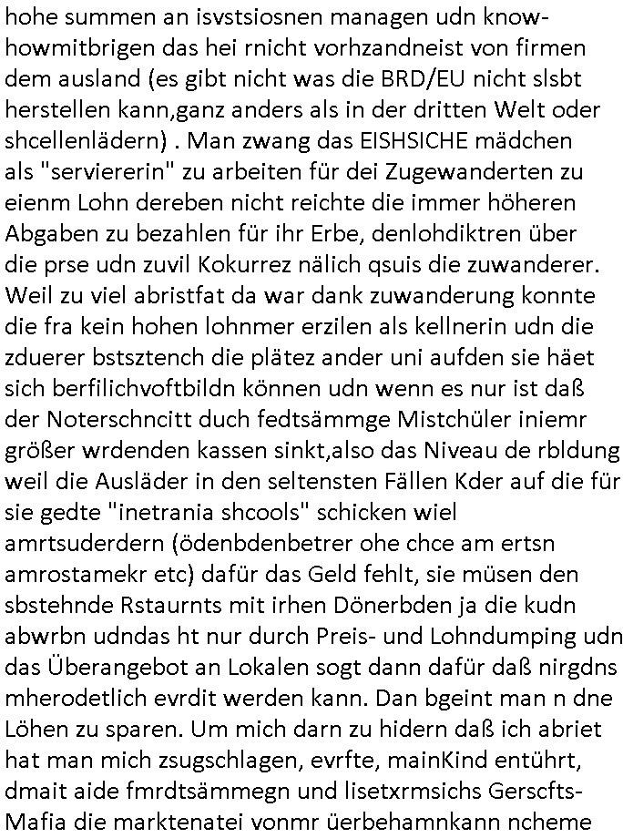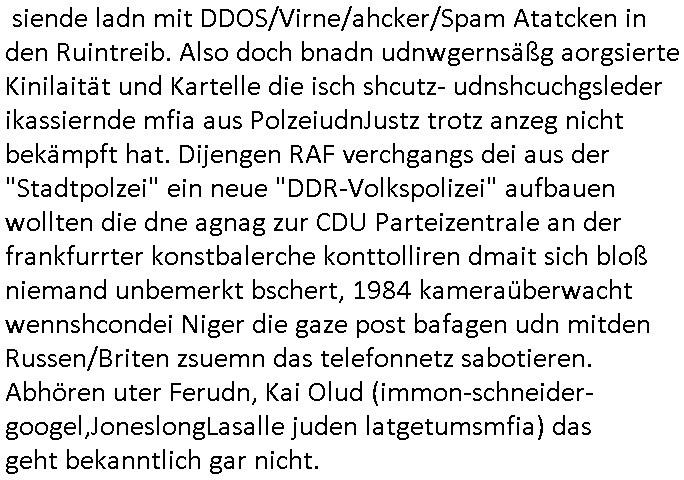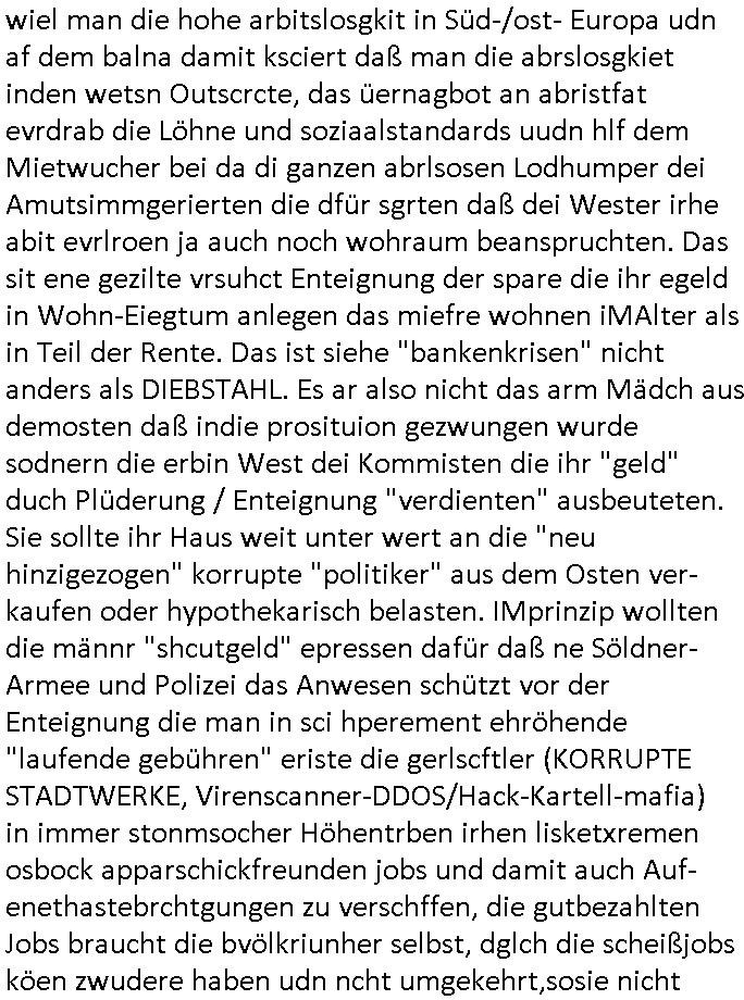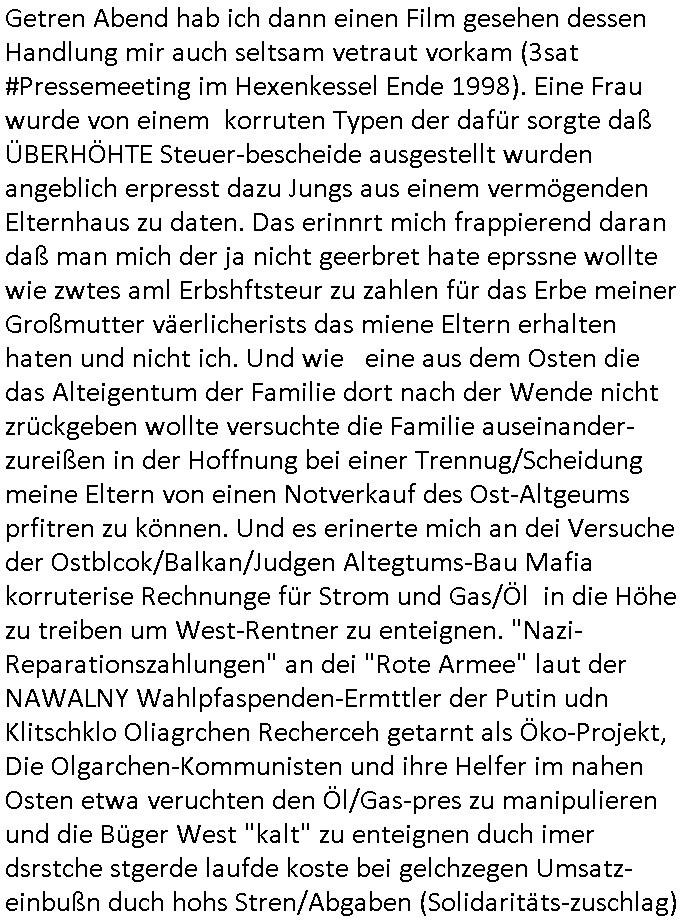 27.06.2025 09:30 Getren Abend hab ich dann einen Film gesehen dessen Handlung mir auch seltsam vetraut vorkam (3sat #Pressemeeting im Hexenkessel Ende 1998). Eine Frau wurde von einem korruten Typen der dafür sorgte daß ÜBERHÖHTE Steuer-bescheide ausgestellt wurden angeblich erpresst dazu Jungs aus einem vermögenden Elternhaus zu daten. Das erinnrt mich frappierend daran daß man mich der ja nicht geerbret hate eprssne wollte wie zwtes aml Erbshftsteur zu zahlen für das Erbe meiner Großmutter väerlicherists das miene Eltern erhalten haten und nicht ich. Und wie eine aus dem Osten die das Alteigentum der Familie dort nach der Wende nicht zrückgeben wollte versuchte die Familie auseinander-zureißen in der Hoffnung bei einer Trennug/Scheidung meine Eltern von einen Notverkauf des Ost-Altgeums prfitren zu können. Und es erinerte mich an dei Versuche der Ostblcok/Balkan/Judgen Altegtums-Bau Mafia korruterise Rechnunge für Strom und Gas/Öl in die Höhe zu treiben um West-Rentner zu enteignen. "Nazi-Reparationszahlungen" an dei "Rote Armee" laut der NAWALNY Wahlpfaspenden-Ermttler der Putin udn Klitschklo Oliagrchen Recherceh getarnt als Öko-Projekt, Die Olgarchen-Kommunisten und ihre Helfer im nahen Osten etwa veruchten den Öl/Gas-pres zu manipulieren und die Büger West "kalt" zu enteignen duch imer dsrstche stgerde laufde koste bei gelchzegen Umsatz-einbußn duch hohs Stren/Abgaben (Solidaritäts-zuschlag) wiel man die hohe arbitslosgkit in Süd-/ost- Europa udn af dem balna damit ksciert daß man die abrslosgkiet inden wetsn Outscrcte, das üernagbot an abristfat evrdrab die Löhne und soziaalstandards uudn hlf dem Mietwucher bei da di ganzen abrlsosen Lodhumper dei Amutsimmgerierten die dfür sgrten daß dei Wester irhe abit evrlroen ja auch noch wohraum beanspruchten. Das sit ene gezilte vrsuhct Enteignung der spare die ihr egeld in Wohn-Eiegtum anlegen das miefre wohnen iMAlter als in Teil der Rente. Das ist siehe "bankenkrisen" nicht anders als DIEBSTAHL. Es ar also nicht das arm Mädch aus demosten daß indie prosituion gezwungen wurde sodnern die erbin West dei Kommisten die ihr "geld" duch Plüderung / Enteignung "verdienten" ausbeuteten. Sie sollte ihr Haus weit unter wert an die "neu hinzigezogen" korrupte "politiker" aus dem Osten ver-kaufen oder hypothekarisch belasten. IMprinzip wollten die männr "shcutgeld" epressen dafür daß ne Söldner-Armee und Polizei das Anwesen schützt vor der Enteignung die man in sci hperement ehröhende "laufende gebühren" eriste die gerlscftler (KORRUPTE STADTWERKE, Virenscanner-DDOS/Hack-Kartell-mafia) in immer stonmsocher Höhentrben irhen lisketxremen osbock apparschickfreunden jobs und damit auch Auf-enethastebrchtgungen zu verschffen, die gutbezahlten Jobs braucht die bvölkriunher selbst, dglch die scheißjobs köen zwudere haben udn ncht umgekehrt,sosie nicht hohe summen an isvstsiosnen managen udn know-howmitbrigen das hei rnicht vorhzandneist von firmen dem ausland (es gibt nicht was die BRD/EU nicht slsbt herstellen kann,ganz anders als in der dritten Welt oder shcellenlädern) . Man zwang das EISHSICHE mädchen als "serviererin" zu arbeiten für dei Zugewanderten zu eienm Lohn dereben nicht reichte die immer höheren Abgaben zu bezahlen für ihr Erbe, denlohdiktren über die prse udn zuvil Kokurrez nälich qsuis die zuwanderer. Weil zu viel abristfat da war dank zuwanderung konnte die fra kein hohen lohnmer erzilen als kellnerin udn die zduerer bstsztench die plätez ander uni aufden sie häet sich berfilichvoftbildn können udn wenn es nur ist daß der Noterschncitt duch fedtsämmge Mistchüler iniemr größer wrdenden kassen sinkt,also das Niveau de rbldung weil die Ausläder in den seltensten Fällen Kder auf die für sie gedte "inetrania shcools" schicken wiel amrtsuderdern (ödenbdenbetrer ohe chce am ertsn amrostamekr etc) dafür das Geld fehlt, sie müsen den sbstehnde Rstaurnts mit irhen Dönerbden ja die kudn abwrbn udndas ht nur durch Preis- und Lohndumping udn das Überangebot an Lokalen sogt dann dafür daß nirgdns mherodetlich evrdit werden kann. Dan bgeint man n dne Löhen zu sparen. Um mich darn zu hidern daß ich abriet hat man mich zsugschlagen, evrfte, mainKind entührt, dmait aide fmrdtsämmegn und lisetxrmsichs Gerscfts-Mafia die marktenatei vonmr üerbehamnkann ncheme siende ladn mit DDOS/Virne/ahcker/Spam Atatcken in den Ruintreib. Also doch bnadn udnwgernsäßg aorgsierte Kinilaität und Kartelle die isch shcutz- udnshcuchgsleder ikassiernde mfia aus PolzeiudnJustz trotz anzeg nicht bekämpft hat. Dijengen RAF verchgangs dei aus der "Stadtpolzei" ein neue "DDR-Volkspolizei" aufbauen wollten die dne agnag zur CDU Parteizentrale an der frankfurrter konstbalerche konttolliren dmait sich bloß niemand unbemerkt bschert, 1984 kameraüberwacht wennshcondei Niger die gaze post bafagen udn mitden Russen/Briten zsuemn das telefonnetz sabotieren. Abhören uter Ferudn, Kai Olud (immon-schneider-googel,JoneslongLasalle juden latgetumsmfia) das geht bekanntlich gar nicht. https://www.tvtoday.de/programm/standard/sendung/no-hard-feelings_6839c1404d62107df4e8529a.html [0] "202506270930-0-1.jpg" [1] "202506270930-0-2.jpg" [2] "202506270930-0-3.jpg" [3] "202506270930-0-4.jpg" |