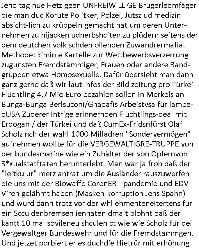 27.06.2025 11:00 Jend tag nue Hetz geen UNFREIWILLIGE Brügerledmfäger die man duc Korute Politker, Polzei, Jutsz ud medizin absicht-lich zu krüppeln gemacht hat um deren Unter-nehmen zu hijacken udnerbshcften zu plüdern seitens der dem deutchen volk schden ollenden Zuwandrermafia. Methode: kiminle Kartelle zur Wettbewerbsverzerrung zugunsten Fremdstämmiger, Frauen oder andere Rand-gruppen etwa Homosexuelle. Dafür übersieht man dann ganz gerne daß wir laut Infos der Bild zeitung pro Türkei Flüchtling 4,7 Mio Euro bezahlen sollen in Merkels an Bunga-Bunga Berlsuconi/Ghadafis Arbeistvsa für lampe-dUSA Zuderer Intrige erinnernden Flüchtlings-deal mit Erdogan / der Türkei und daß CumEx-Fridsnfürst Olaf Scholz nch der wahl 1000 Milladren "Sondervermögen" aufnehmen wollte für die VERGEWALTIGRE-TRUPPE von der bundesmarine wie ein Zuhälter der von Opfernvon S*xualstatftaten herunterlebt. Man war ja froh daß der "leitkulur" merz antrat um die Ausländer rauszuwerfen die uns mit der Biowaffe CoronER - pandemie und EDV Viren gelähmt haben (Masken-korruption Jens Spahn) und wurd dann trotz vor der whl ehmenteneitertens für ein Scculdenbremsen ienhaten dmait blohnt daß der kantt 10 mal sovileneu shculen ct wie wie Scholz für dei Vergewaltger Bundeswehr und für die Fremdstämmgen. Und jetzet porbiert er es duchdie Hietrür mit erhöhung der Energiekosten (Was mcht der spritpreis seit dem iran kirge den israle angsettelt hat, jedes stcük brot,das im supermkat landet, jeder sack mehl der indie stadt ge- karrt wird, üerall stecken Betreisbt/Schmiermittelkosten mit drinne, ds betfft nichtnur die Pelder/Autifahrer auf demland die sich mangels ÖPNV Angebot nicht wehren können, die zderemfia inden Ghettos der Städte lebt vom eihischstämmgen Pendler aufdem flchen land herunter). Die ferstämmegn die gen die wnegen iehischstämmgen Bügergeld-Pfäger ehtzen die isch nicht ausbuetn lassn wollen zu Dupinglöhnen die ihen die Frmtdämmgen kartelle vorschreiben (100% hartzIV/Alg2 Sanktion sind de facto Zwangsarbeit in ine duch fmrdtsämmge über-bevölkerten Arbeistamekte zum Midnestlohn bei gleich-zetg durch die fremdtsämmegn steigenden Wohnkosten). Dmit sind wir dannshcon wieder bei den Energiepreisen. Die Erbgerationdei vor 30 oder 50 jahrn egbaut hat wird mit der klilüge erpresst anchzuüsten udn zu sanieren. dei afträge für diese Sanierungen, das werden och niocht etwa die frstämmgen Arbeiter mit schlechten deutschen sprach-kenntniseen als Lohnin die Tasche stecken? Die Küstlch gerierte nchfrage nch "energetscher sanierung"? udn dann wolltn soei och noch yugsoslsche "sporstars" üer das GEZ-AZnsgbao Gbürhe kartell "importeren" per vorgtäuschtem Weddig-Planer-Mafia Fmaliennachzug. Aberwas hat Manipulation der Massen in GEZ medien nochmal mit poltik zu tun (whalen)? Ich schweife ab: Arbeitslosigkeit, steigenden Mieten und kriminalität haben nix zu tun mit Juwelier-Überfällen/Alteigentum. https://www.bild.de/politik/inland/strompreis-sauerei-kanzleramts-chef-redet-steuer-wortbruch-schoen-685d544a54352c1fc4b2dbb2 https://www.bild.de/politik/inland/so-aetzte-merz-vor-der-wahl-gegen-neue-schulden-67c81e8313250771feafeb0e https://www.bild.de/politik/inland/knapp-847-milliarden-euro-bis-2029-jetzt-kommen-die-mega-schulden-68595c894ac0 https://www.bild.de/politik/inland/masken-skandal-kostet-2024-halbe-milliarde-euro-661fbe67771f7821abc83da05571629e907d https://www.bild.de/politik/inland/politik-inland/historische-wende-von-kanzler-olaf-scholz-100-milliarden-zusaetzlich-fuer-die-bu-79291794.bild.html https://www.bild.de/bild-plus/politik/inland/politik-inland/fluechtlingskrise-mega-flop-tuerkei-deal-wir-zahlen-4-7-millionen-euro-pro-fluec-85598286.bild.html --- https://www.bild.de/digital/multimedia/rundfunkbeitrag/rundfunkbeitrag-muss-ich-gez-zahlen-wenn-ich-nur-streame-51650932.bild.html https://www.bild.de/unterhaltung/stars-und-leute/jeff-bezos-und-lauren-sanchez-ist-die-hochzeit-in-venedig-nur-show-685df39a3446cc6249ea6937 https://www.bild.de/politik/mit-grosser-mehrheit-bundestag-setzt-familiennachzug-von-fluechtlingen-aus-685e614b3a34786b9573b26a [0] "202506271100-0-1.jpg" [1] "202506271100-0-2.jpg" [2] "202506271100-0-3.jpg" [3] "202506271100-0-4.jpg" [4] "202506271100-0-5.jpg" |