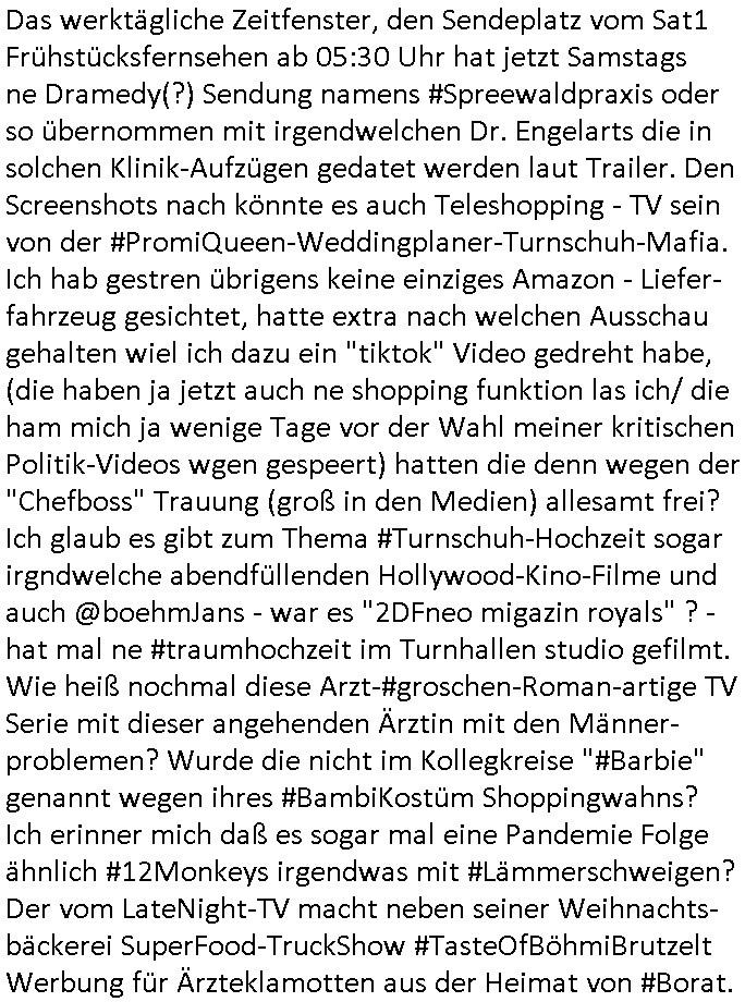 28.06.2025 08:55 Das werktägliche Zeitfenster, den Sendeplatz vom Sat1 Frühstücksfernsehen ab 05:30 Uhr hat jetzt Samstags ne Dramedy(?) Sendung namens #Spreewaldpraxis oder so übernommen mit irgendwelchen Dr. Engelarts die in solchen Klinik-Aufzügen gedatet werden laut Trailer. Den Screenshots nach könnte es auch Teleshopping - TV sein von der #PromiQueen-Weddingplaner-Turnschuh-Mafia. Ich hab gestren übrigens keine einziges Amazon - Liefer- fahrzeug gesichtet, hatte extra nach welchen Ausschau gehalten wiel ich dazu ein "tiktok" Video gedreht habe, (die haben ja jetzt auch ne shopping funktion las ich/ die ham mich ja wenige Tage vor der Wahl meiner kritischen Politik-Videos wgen gespeert) hatten die denn wegen der "Chefboss" Trauung (groß in den Medien) allesamt frei? Ich glaub es gibt zum Thema #Turnschuh-Hochzeit sogar irgndwelche abendfüllenden Hollywood-Kino-Filme und auch @boehmJans - war es "2DFneo migazin royals" ? - hat mal ne #traumhochzeit im Turnhallen studio gefilmt. Wie heiß nochmal diese Arzt-#groschen-Roman-artige TV Serie mit dieser angehenden Ärztin mit den Männer-problemen? Wurde die nicht im Kollegkreise "#Barbie" genannt wegen ihres #BambiKostüm Shoppingwahns? Ich erinner mich daß es sogar mal eine Pandemie Folge ähnlich #12Monkeys irgendwas mit #Lämmerschweigen? Der vom LateNight-TV macht neben seiner Weihnachts-bäckerei SuperFood-TruckShow #TasteOfBöhmiBrutzelt Werbung für Ärzteklamotten aus der Heimat von #Borat. https://www.tvtoday.de/programm/standard/sendung/die-landarztpraxis_683edcca4d62107df4ef9686.html [0] "202506280855-0-1.jpg" [1] "202506280855-0-2.jpg" |