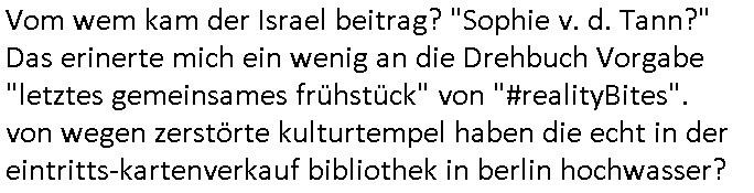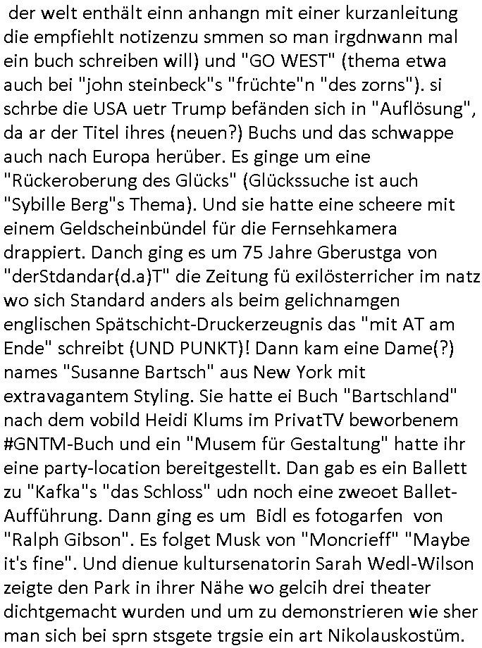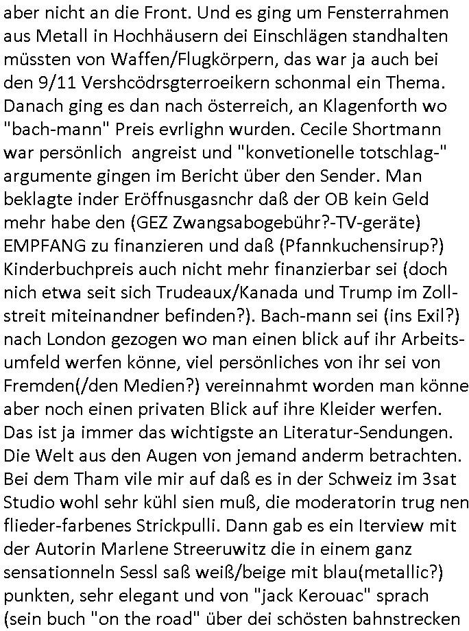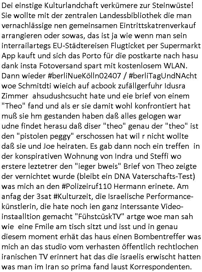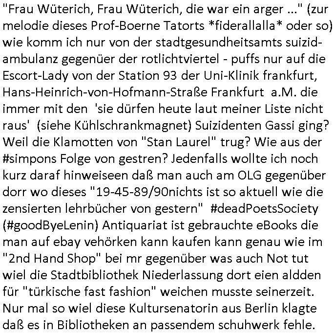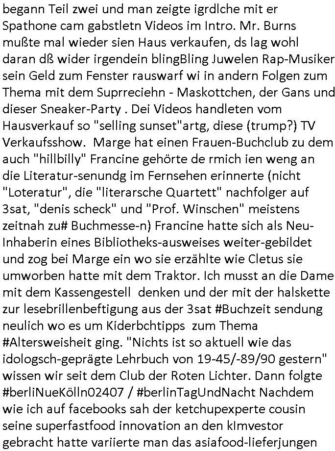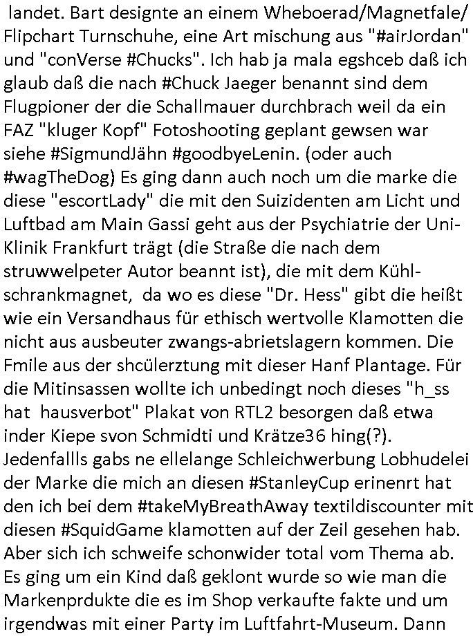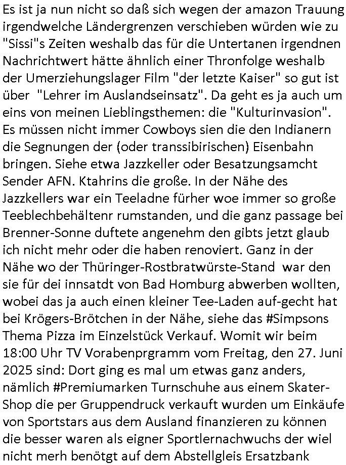 28.06.2025 09:00 Es ist ja nun nicht so daß sich wegen der amazon Trauung irgendwelche Ländergrenzen verschieben würden wie zu "Sissi"s Zeiten weshalb das für die Untertanen irgendnen Nachrichtwert hätte ähnlich einer Thronfolge weshalb der Umerziehungslager Film "der letzte Kaiser" so gut ist über "Lehrer im Auslandseinsatz". Da geht es ja auch um eins von meinen Lieblingsthemen: die "Kulturinvasion". Es müssen nicht immer Cowboys sien die den Indianern die Segnungen der (oder transsibirischen) Eisenbahn bringen. Siehe etwa Jazzkeller oder Besatzungsamcht Sender AFN. Ktahrins die große. In der Nähe des Jazzkellers war ein Teeladne fürher woe immer so große Teeblechbehältenr rumstanden, und die ganz passage bei Brenner-Sonne duftete angenehm den gibts jetzt glaub ich nicht mehr oder die haben renoviert. Ganz in der Nähe wo der Thüringer-Rostbratwürste-Stand war den sie für dei innsatdt von Bad Homburg abwerben wollten, wobei das ja auch einen kleiner Tee-Laden auf-gecht hat bei Krögers-Brötchen in der Nähe, siehe das #Simpsons Thema Pizza im Einzelstück Verkauf. Womit wir beim 18:00 Uhr TV Vorabenprgramm vom Freitag, den 27. Juni 2025 sind: Dort ging es mal um etwas ganz anders, nämlich #Premiumarken Turnschuhe aus einem Skater-Shop die per Gruppendruck verkauft wurden um Einkäufe von Sportstars aus dem Ausland finanzieren zu können die besser waren als eigner Sportlernachwuchs der wiel nicht merh benötgt auf dem Abstellgleis Ersatzbank landet. Bart designte an einem Wheboerad/Magnetfale/ Flipchart Turnschuhe, eine Art mischung aus "#airJordan" und "conVerse #Chucks". Ich hab ja mala egshceb daß ich glaub daß die nach #Chuck Jaeger benannt sind dem Flugpioner der die Schallmauer durchbrach weil da ein FAZ "kluger Kopf" Fotoshooting geplant gewsen war siehe #SigmundJähn #goodbyeLenin. (oder auch #wagTheDog) Es ging dann auch noch um die marke die diese "escortLady" die mit den Suizidenten am Licht und Luftbad am Main Gassi geht aus der Psychiatrie der Uni-Klinik Frankfurt trägt (die Straße die nach dem struwwelpeter Autor beannt ist), die mit dem Kühl-schrankmagnet, da wo es diese "Dr. Hess" gibt die heißt wie ein Versandhaus für ethisch wertvolle Klamotten die nicht aus ausbeuter zwangs-abrietslagern kommen. Die Fmile aus der shcülerztung mit dieser Hanf Plantage. Für die Mitinsassen wollte ich unbedingt noch dieses "h_ss hat hausverbot" Plakat von RTL2 besorgen daß etwa inder Kiepe svon Schmidti und Krätze36 hing(?). Jedenfallls gabs ne ellelange Schleichwerbung Lobhudelei der Marke die mich an diesen #StanleyCup erinenrt hat den ich bei dem #takeMyBreathAway textildiscounter mit diesen #SquidGame klamotten auf der Zeil gesehen hab. Aber sich ich schweife schonwider total vom Thema ab. Es ging um ein Kind daß geklont wurde so wie man die Markenprdukte die es im Shop verkaufte fakte und um irgendwas mit einer Party im Luftfahrt-Museum. Dann begann Teil zwei und man zeigte igrdlche mit er Spathone cam gabstletn Videos im Intro. Mr. Burns mußte mal wieder sien Haus verkaufen, ds lag wohl daran dß wider irgendein blingBling Juwelen Rap-Musiker sein Geld zum Fenster rauswarf wi in andern Folgen zum Thema mit dem Suprreciehn - Maskottchen, der Gans und dieser Sneaker-Party . Dei Videos handleten vom Hausverkauf so "selling sunset"artg, diese (trump?) TV Verkaufsshow. Marge hat einen Frauen-Buchclub zu dem auch "hillbilly" Francine gehörte de rmich ien weng an die Literatur-senundg im Fernsehen erinnerte (nicht "Loteratur", die "literarsche Quartett" nachfolger auf 3sat, "denis scheck" und "Prof. Winschen" meistens zeitnah zu# Buchmesse-n) Francine hatte sich als Neu-Inhaberin eines Bibliotheks-ausweises weiter-gebildet und zog bei Marge ein wo sie erzählte wie Cletus sie umworben hatte mit dem Traktor. Ich musst an die Dame mit dem Kassengestell denken und der mit der halskette zur lesebrillenbeftigung aus der 3sat #Buchzeit sendung neulich wo es um Kiderbchtipps zum Thema #Altersweisheit ging. "Nichts ist so aktuell wie das idologsch-geprägte Lehrbuch von 19-45/-89/90 gestern" wissen wir seit dem Club der Roten Lichter. Dann folgte #berliNueKölln02407 / #berlinTagUndNacht Nachdem wie ich auf facebooks sah der ketchupexperte cousin seine superfastfood innovation an den kImvestor gebracht hatte variierte man das asiafood-lieferjungen teham aus den szten von conOhr udn Tierschutz-Terror Toni diesmal um fastfood aus nordwestafrika/Marokko. Dan begann die 3sat #Kulturzeit mit bIldenr aus Tle-avib von einer performance Küstlerin die sich mit dem thame des Wäsche waschens während daubedohugs-gefahren-situationen in zerbombten Städten beschäftigt wo de weg zum Waschsalon( wo die "amazon locker" paketststaion steht nahe der EZB) wegen steinewerfern die es auf ien absgen haben schon zu gefährlich sien kann( genau wie das zur post-annahmestelle bringen von briefen / faxen). Wirklich großes Glück hat der den F(lowers)B(y) - I(rene) [so heißt übrigens ein anderes Patenkind meines Vaters, diese Mercedes-Benz Connection] nicht abhört mittels eines schwarzen Kleinbusses vor der Tür. (ich hab das ja schriftlich daß barak Obama persönlich angeordnet hat mich hauszudurchsuchen und mein Intrenet/telefon/-fax email suw. abzuhören). dei ständig zwecks zensur aus reztrumracks gerissenen/anderitge saborteten server fresn zudem extremvil von ime essngsld siet man mich mit DDOS/Viren/Hacker/Spam gezielt in den Ruin trieb. Teils Fake Rechnugen wie für Strom suw.. Ich zahl das alels aus HartzIV/Alg2/Bürgergeld, neben Prozessksoten dei CumEx artge total an denhaarenr herbeigezoegn sind. Abr das thema Haare hat nicht mit der Kulurzeit zu tun. Dann erklärte man daß in Israel Einzelkinder zwar zur Armee müssen (da gibt es auch Wehrpföicht für Frauen) aber nicht an die Front. Und es ging um Fensterrahmen aus Metall in Hochhäusern dei Einschlägen standhalten müssten von Waffen/Flugkörpern, das war ja auch bei den 9/11 Vershcödrsgterroeikern schonmal ein 