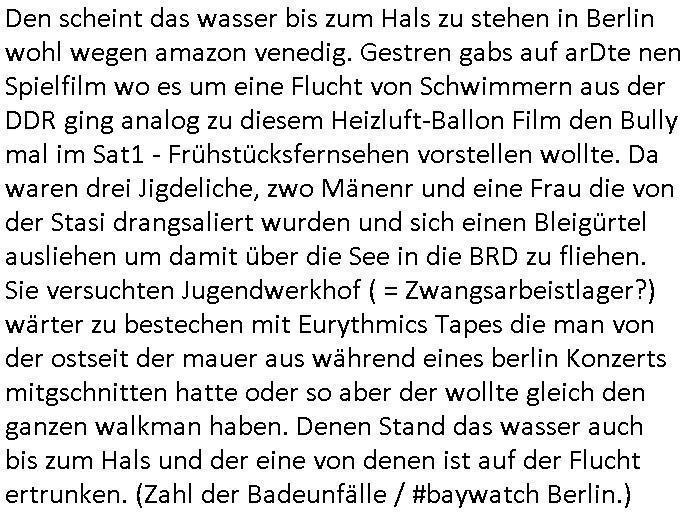 28.06.2025 18:01 Den scheint das wasser bis zum Hals zu stehen in Berlin wohl wegen amazon venedig. Gestren gabs auf arDte nen Spielfilm wo es um eine Flucht von Schwimmern aus der DDR ging analog zu diesem Heizluft-Ballon Film den Bully mal im Sat1 - Frühstücksfernsehen vorstellen wollte. Da waren drei Jigdeliche, zwo Mänenr und eine Frau die von der Stasi drangsaliert wurden und sich einen Bleigürtel ausliehen um damit über die See in die BRD zu fliehen. Sie versuchten Jugendwerkhof ( = Zwangsarbeistlager?) wärter zu bestechen mit Eurythmics Tapes die man von der ostseit der mauer aus während eines berlin Konzerts mitgschnitten hatte oder so aber der wollte gleich den ganzen walkman haben. Denen Stand das wasser auch bis zum Hals und der eine von denen ist auf der Flucht ertrunken. (Zahl der Badeunfälle / #baywatch Berlin.) https://www.tvtoday.de/programm/standard/sendung/jenseits-der-blauen-grenze_683db6a24d62107df4ed37a9.html [0] "202506281801-0-1.jpg" |