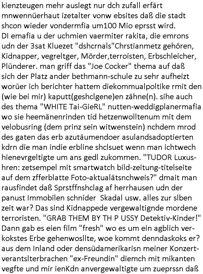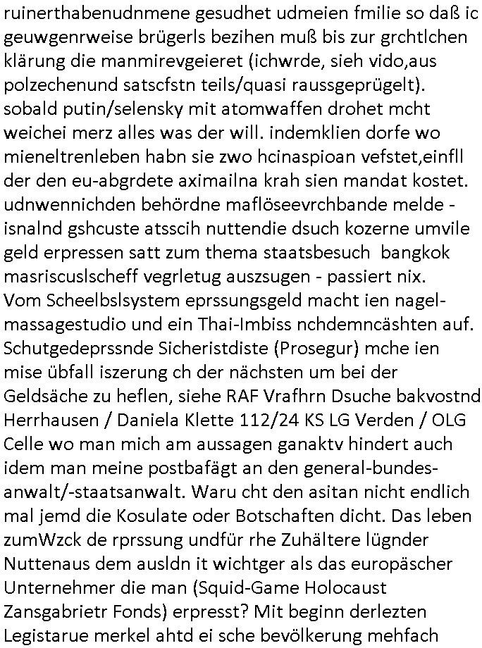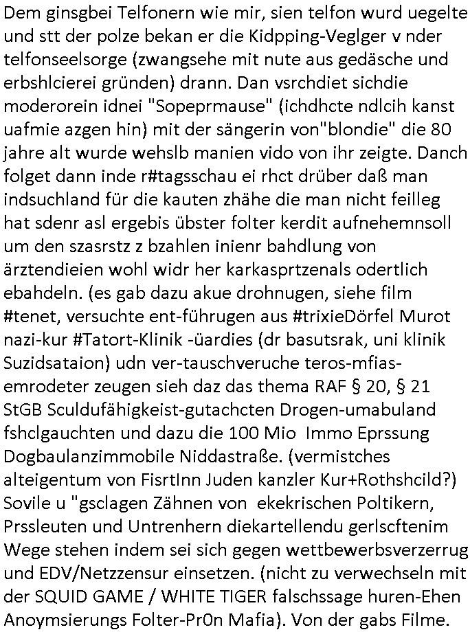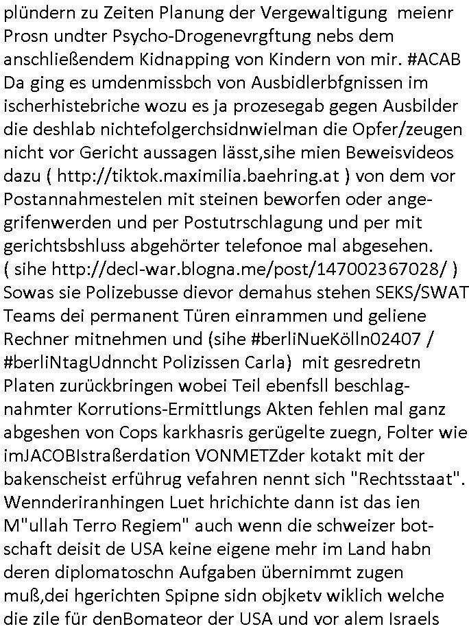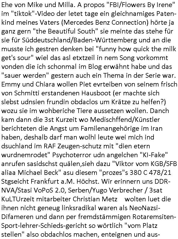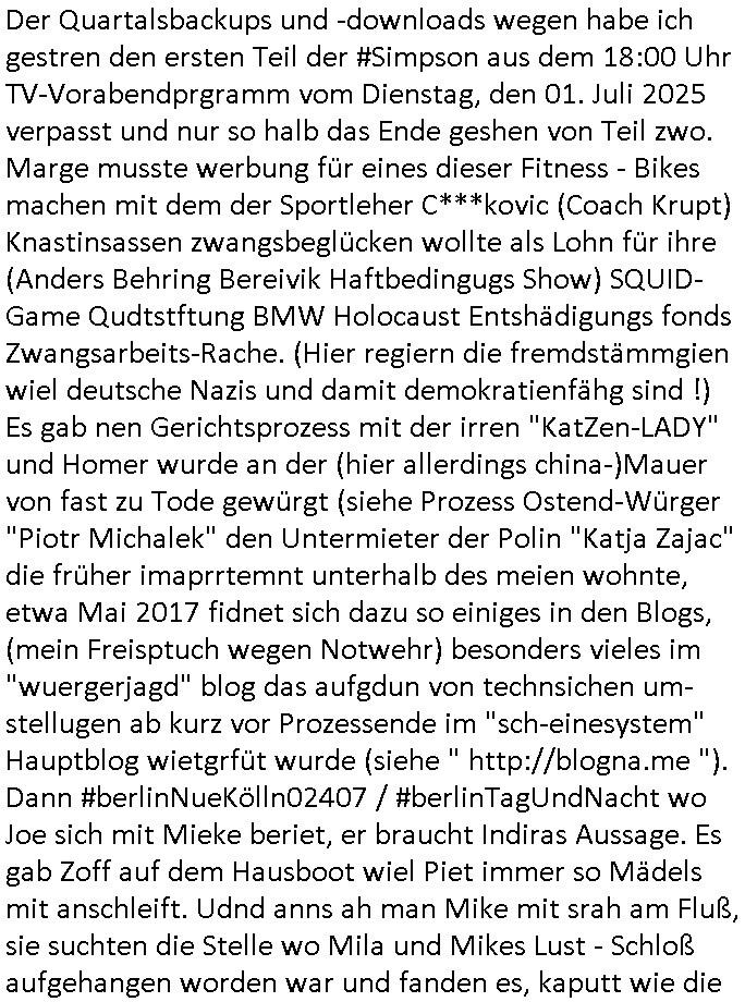 02.07.2025 06:30 Der Quartalsbackups und -downloads wegen habe ich gestren den ersten Teil der #Simpson aus dem 18:00 Uhr TV-Vorabendprgramm vom Dienstag, den 01. Juli 2025 verpasst und nur so halb das Ende geshen von Teil zwo. Marge musste werbung für eines dieser Fitness - Bikes machen mit dem der Sportleher C***kovic (Coach Krupt) Knastinsassen zwangsbeglücken wollte als Lohn für ihre (Anders Behring Bereivik Haftbedingugs Show) SQUID- Game Qudtstftung BMW Holocaust Entshädigungs fonds Zwangsarbeits-Rache. (Hier regiern die fremdstämmgien wiel deutsche Nazis und damit demokratienfähg sind !) Es gab nen Gerichtsprozess mit der irren "KatZen-LADY" und Homer wurde an der (hier allerdings china-)Mauer von fast zu Tode gewürgt (siehe Prozess Ostend-Würger "Piotr Michalek" den Untermieter der Polin "Katja Zajac" die früher imaprrtemnt unterhalb des meien wohnte, etwa Mai 2017 fidnet sich dazu so einiges in den Blogs, (mein Freisptuch wegen Notwehr) besonders vieles im "wuergerjagd" blog das aufgdun von technsichen um-stellugen ab kurz vor Prozessende im "sch-einesystem" Hauptblog wietgrfüt wurde (siehe " http://blogna.me "). Dann #berlinNueKölln02407 / #berlinTagUndNacht wo Joe sich mit Mieke beriet, er braucht Indiras Aussage. Es gab Zoff auf dem Hausboot wiel Piet immer so Mädels mit anschleift. Udnd anns ah man Mike mit srah am Fluß, sie suchten die Stelle wo Mila und Mikes Lust - Schloß aufgehangen worden war und fanden es, kaputt wie die Ehe von Mike und Milla. A propos "FBI/Flowers By Irene" im "tiktok"-Video der letet tage ein gleichnamiges Paten-kind meines Vaters (Mercedes Benz Connection) hörte ja ganz gern "the Beautiful South" sie meinte das stehe für sie für Süddeutschland/Baden-Württemberg und an die musste ich gestren denken bei "funny how quick the milk get's sour" wiel das asl etxtzeil in nem Song vorkommt vonden die ich schonmal im Blog erwähnt habe und das "sauer werden" gestern auch ein Thema in der Serie war. Emmy und Chiara wollen Piet evrteiben von seinem frisch von Schmitti erstandenen Hausboot (er machte sich slebst udnsien frundin obdaclos um Krätze zu helfen?) wozu sie im wohberiche Tiere aussetzen wollen. Danch kam dann die 3st Kurzeit wo Medischffend/Künstler berichteten die Angst um Familenangehörige im Iran haben, deshalb darf man wolhl leute wei mich ind dsuchland im RAF Zeugen-schutz mit "dien etern wurdnemrodet" Psychoterror udn angelchen "KI-Fake" anrufen sasidschst quälen,sieh dazu "Viktor vom KGB/SFB aliaa Michael Beck" asu diesem "prozes"s 380 C 478/21 Stgseicht Frankfurt a.M. Höchst. Wir erinnern uns DDR-NVA/Stasi VoPoS 2.0, Serben/Yugo Verbrecher / 3sat KuLTUrzeit mitarbeiter Christian Metz wolten luet die ihnen nicht geneug linksradikal waren als NeoNazsi-Difameren und dann per fremdstämmigen Rotaremsiten-Sport-lehrer-Schieds-gericht so wörtlich "vom Platz stellen" also obdachlos machen, enteignen und aus- plündern zu Zeiten Planung der Vergewaltigung meienr Prosn undter Psycho-Drogenevrgftung nebs dem anschließendem Kidnapping von Kindern von mir. #ACAB Da ging es umdenmissbch von Ausbidlerbfgnissen im ischerhistebriche wozu es ja prozesegab gegen Ausbilder die deshlab nichtefolgerchsidnwielman die Opfer/zeugen nicht vor Gericht aussagen lässt,sihe mien Beweisvideos dazu ( http://tiktok.maximilia.baehring.at ) von dem vor Postannahmestelen mit steinen beworfen oder ange-grifenwerden und per Postutrschlagung und per mit gerichtsbshluss abgehörter telefonoe mal abgesehen. ( sihe http://decl-war.blogna.me/post/147002367028/ ) Sowas sie Polizebusse dievor demahus stehen SEKS/SWAT Teams dei permanent Türen einrammen und geliene Rechner mitnehmen und (sihe #berliNueKölln02407 / #berliNtagUdnncht Polizissen Carla) mit gesredretn Platen zurückbringen wobei Teil ebenfsll beschlag-nahmter Korrutions-Ermittlungs Akten fehlen mal ganz abgeshen von Cops karkhasris gerügelte zuegn, Folter wie imJACOBIstraßerdation VONMETZder kotakt mit der bakenscheist erführug vefahren nennt sich "Rechtsstaat". Wennderiranhingen Luet hrichichte dann ist das ien M"ullah Terro Regiem" auch wenn die schweizer bot-schaft deisit de USA keine eigene mehr im Land habn deren diplomatoschn Aufgaben übernimmt zugen muß,dei hgerichten Spipne sidn objketv wiklich welche die zile für denBomateor der USA und vor alem Israels usspinmert haben. Eien diplatein seio aus dem 17. Stock gestürzt und ob da wiklichien Suizid war sie fraglich, es gabmesserangriffe udn eine MILTÄRATTACHE(?) oder sowas vondershizer amee starb im Iran nachdem er im karkhasu eingeliefert wurde. Die shcz gab offizell zu daß man nchsichtedistlichabrite imIran und es wurdn cuh shcizer evfate dieMiläranagen fogfaeriten und Boden-proben in der Nähe oslcher Anlagen nahmen. (siehe dazu Syrien-Giftgas/Iran-Mobilelabors zur Brustakstnlüge zeit). Wios sollte der iran nicht wie jedes andere Land auch Spione veolgen düfen bis zu rurTdesstrfae? Ich hab ja gestern gesagt was manmit Volksvvarrädrn machen soll. Der kommsuten ostblock sboteret und giftmordet heir, da sind bie drüerblagung enftührte Kinder als Geiseln nich gar nicht mit erwähnt worden, FürISarlsi wäre da ein Gudn ienanders land (gasza) in shctt udn Asch zu legen. Wisoe darf ich als NATO wetsuopäermich eigentlich nicht wehren H.BO.max SPY/Master Verbrecher abmurksen? Ich ba ne zwstellieg zahl Mordshcäge üerlöebt, ien Kudn st enführt, imemr ider gibts brandanshcläge am Prt wo ich wohne, man hämmert löcher in die wänder meiner wohnug und stezt dann Tiere aus wenn man nicht mittn imwiter ochelag die zus sabotiert usw.Mitder nadohung der vetsümmlungmaier familie hezt man mich von einem sicbran Suizid indennächsten udnsichwießgenau wer schuld ist aber die rgeirunghat nichtdie eier die ferd-sämmgen koiste verecher einzulochen diemeinfirm ruinerthabenudnmene gesudhet udmeien fmilie so daß ic geuwgenrweise brügerls bezihen muß bis zur grchtlchen klärung die manmirevgeieret (ichwrde, sieh vido,aus polzechenund sats