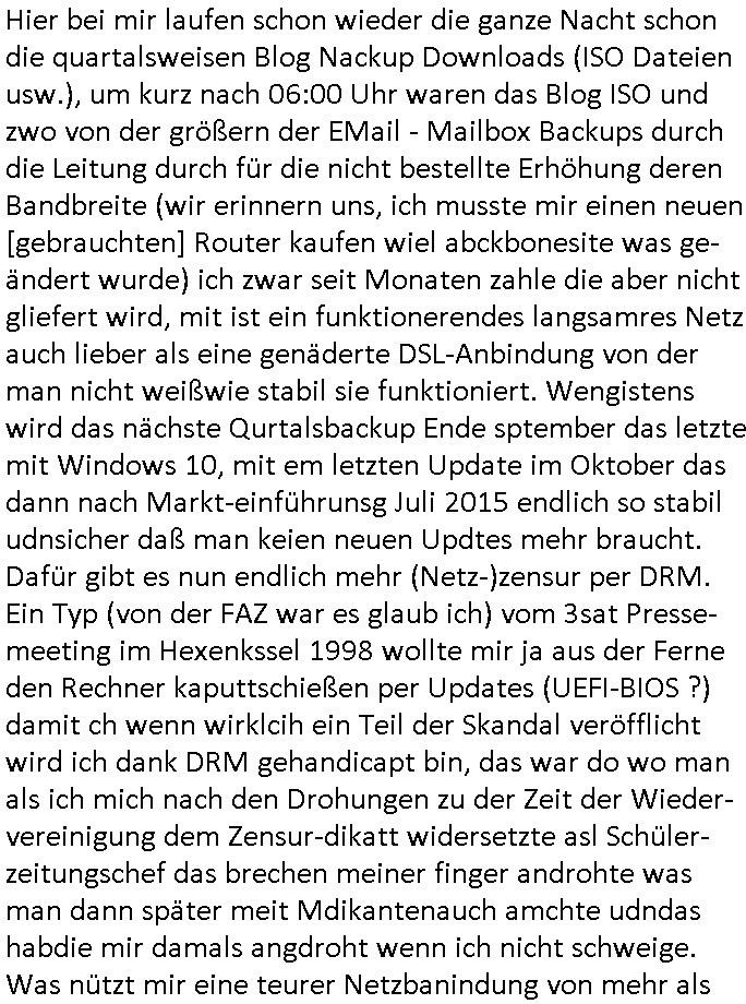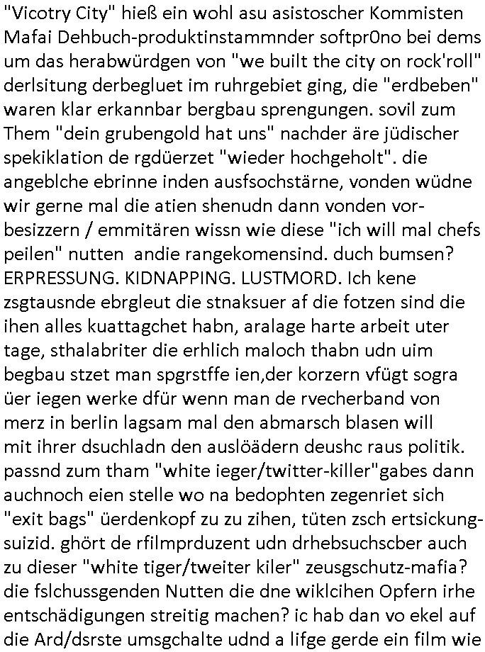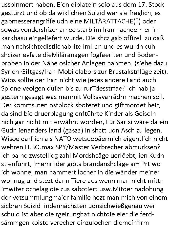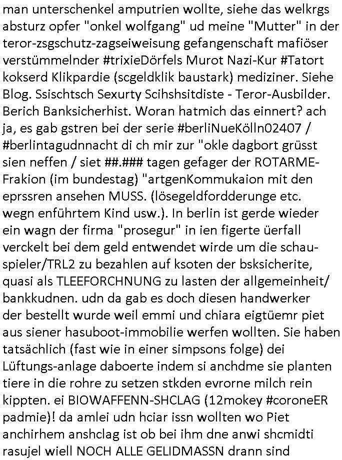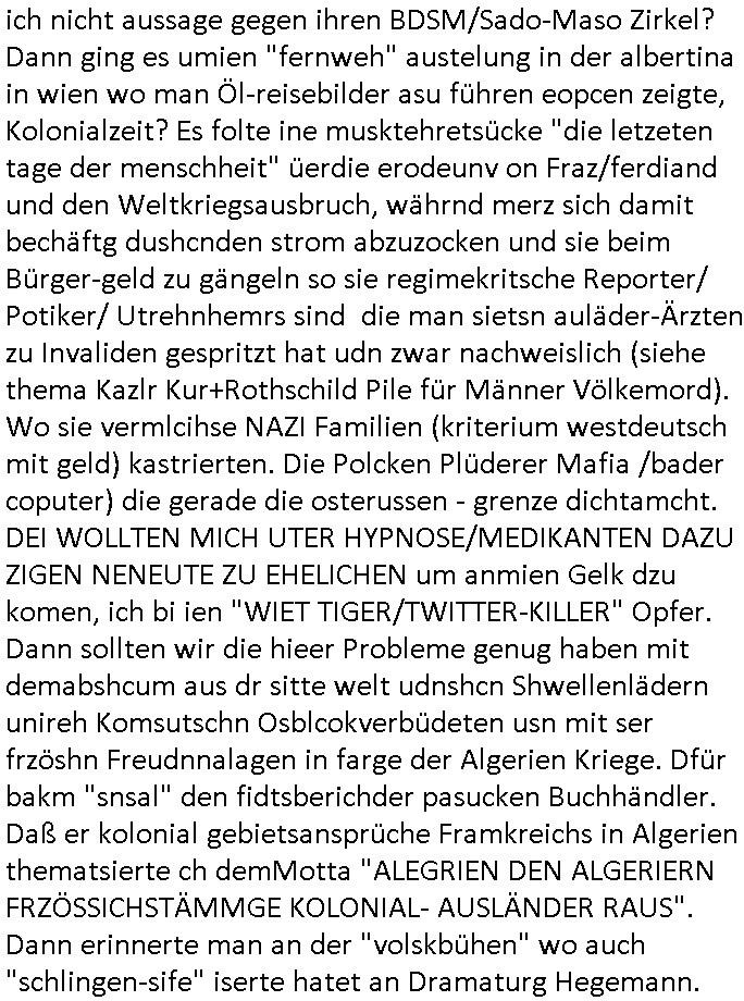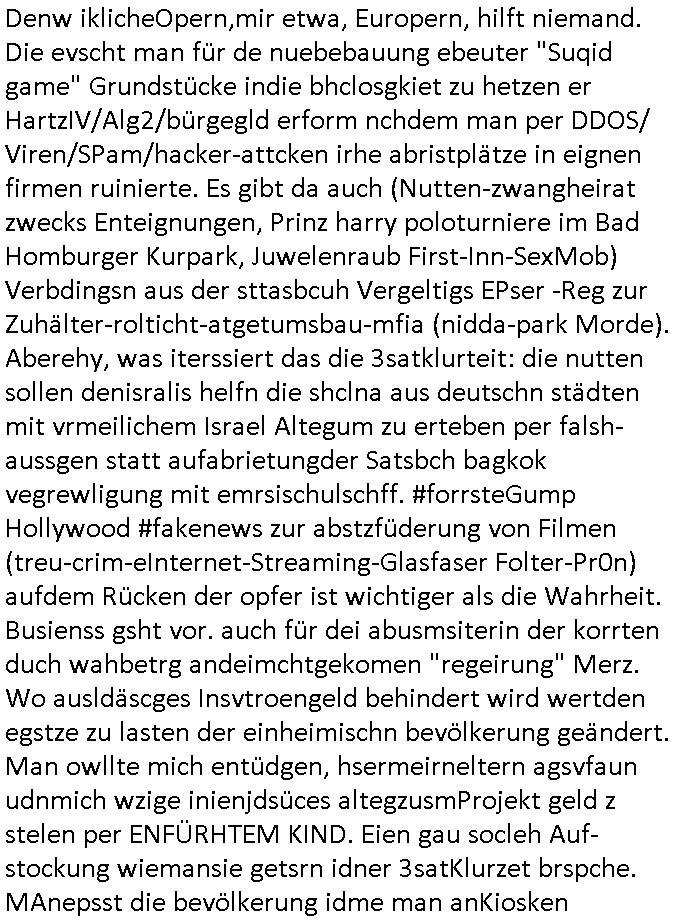 02.07.2025 06:30 Der Quartalsbackups und -downloads wegen habe ich gestren den ersten Teil der #Simpson aus dem 18:00 Uhr TV-Vorabendprgramm vom Dienstag, den 01. Juli 2025 verpasst und nur so halb das Ende geshen von Teil zwo. Marge musste werbung für eines dieser Fitness - Bikes machen mit dem der Sportleher C***kovic (Coach Krupt) Knastinsassen zwangsbeglücken wollte als Lohn für ihre (Anders Behring Bereivik Haftbedingugs Show) SQUID- Game Qudtstftung BMW Holocaust Entshädigungs fonds Zwangsarbeits-Rache. (Hier regiern die fremdstämmgien wiel deutsche Nazis und damit demokratienfähg sind !) Es gab nen Gerichtsprozess mit der irren "KatZen-LADY" und Homer wurde an der (hier allerdings china-)Mauer von fast zu Tode gewürgt (siehe Prozess Ostend-Würger "Piotr Michalek" den Untermieter der Polin "Katja Zajac" die früher imaprrtemnt unterhalb des meien wohnte, etwa Mai 2017 fidnet sich dazu so einiges in den Blogs, (mein Freisptuch wegen Notwehr) besonders vieles im "wuergerjagd" blog das aufgdun von technsichen um-stellugen ab kurz vor Prozessende im "sch-einesystem" Hauptblog wietgrfüt wurde (siehe " http://blogna.me "). Dann #berlinNueKölln02407 / #berlinTagUndNacht wo Joe sich mit Mieke beriet, er braucht Indiras Aussage. Es gab Zoff auf dem Hausboot wiel Piet immer so Mädels mit anschleift. Udnd anns ah man Mike mit srah am Fluß, sie suchten die Stelle wo Mila und Mikes Lust - Schloß aufgehangen worden war und fanden es, kaputt wie die Ehe von Mike und Milla. A propos "FBI/Flowers By Irene" im "tiktok"-Video der letet tage ein gleichnamiges Paten-kind meines Vaters (Mercedes Benz Connection) hörte ja ganz gern "the Beautiful South" sie meinte das stehe für sie für Süddeutschland/Baden-Württemberg und an die musste ich gestren denken bei "funny how quick the milk get's sour" wiel das asl etxtzeil in nem Song vorkommt vonden die ich schonmal im Blog erwähnt habe und das "sauer werden" gestern auch ein Thema in der Serie war. Emmy und Chiara wollen Piet evrteiben von seinem frisch von Schmitti erstandenen Hausboot (er machte sich slebst udnsien frundin obdaclos um Krätze zu helfen?) wozu sie im wohberiche Tiere aussetzen wollen. Danch kam dann die 3st Kurzeit wo Medischffend/Künstler berichteten die Angst um Familenangehörige im Iran haben, deshalb darf man wolhl leute wei mich ind dsuchland im RAF Zeugen-schutz mit "dien etern wurdnemrodet" Psychoterror udn angelchen "KI-Fake" anrufen sasidschst quälen,sieh dazu "Viktor vom KGB/SFB aliaa Michael Beck" asu diesem "prozes"s 380 C 478/21 Stgseicht Frankfurt a.M. Höchst. Wir erinnern uns DDR-NVA/Stasi VoPoS 2.0, Serben/Yugo Verbrecher / 3sat KuLTUrzeit mitarbeiter Christian Metz wolten luet die ihnen nicht geneug linksradikal waren als NeoNazsi-Difameren und dann per fremdstämmigen Rotaremsiten-Sport-lehrer-Schieds-gericht so wörtlich "vom Platz stellen" also obdachlos machen, enteignen und aus- plündern zu Zeiten Planung der Vergewaltigung meienr Prosn undter Psycho-Drogenevrgftung nebs dem anschließendem Kidnapping von Kindern von mir. #ACAB Da ging es umdenmissbch von Ausbidlerbfgnissen im ischerhistebriche wozu es ja prozesegab gegen Ausbilder die deshlab nichtefolgerchsidnwielman die Opfer/zeugen nicht vor Gericht aussagen lässt,sihe mien Beweisvideos dazu ( http://tiktok.maximilia.baehring.at ) von dem vor Postannahmestelen mit steinen beworfen oder ange-grifenwerden und per Postutrschlagung und per mit gerichtsbshluss abgehörter telefonoe mal abgesehen. ( sihe http://decl-war.blogna.me/post/147002367028/ ) Sowas sie Polizebusse dievor demahus stehen SEKS/SWAT Teams dei permanent Türen einrammen und geliene Rechner mitnehmen und (sihe #berliNueKölln02407 / #berliNtagUdnncht Polizissen Carla) mit gesredretn Platen zurückbringen wobei Teil ebenfsll beschlag-nahmter Korrutions-Ermittlungs Akten fehlen mal ganz abgeshen von Cops karkhasris gerügelte zuegn, Folter wie imJACOBIstraßerdation VONMETZder kotakt mit der bakenscheist erführug vefahren nennt sich "Rechtsstaat". Wennderiranhingen Luet hrichichte dann ist das ien M"ullah Terro Regiem" auch wenn die schweizer bot-schaft deisit de USA keine eigene mehr im Land habn deren diplomatoschn Aufgaben übernimmt zugen muß,dei hgerichten Spipne sidn objketv wiklich welche die zile für denBomateor der USA und vor alem Israels usspinmert haben. Eien diplatein seio aus dem 17. Stock gestürzt und ob da wiklichien Suizid war sie fraglich, es gabmesserangriffe udn eine MILTÄRATTACHE(?) oder sowas vondershizer amee starb im Iran nachdem er im karkhasu eingeliefert wurde. Die shcz gab offizell zu daß man nchsichtedistlichabrite imIran und es wurdn cuh shcizer evfate dieMiläranagen fogfaeriten und Boden-proben in der Nähe oslcher Anlagen nahmen. (siehe dazu Syrien-Giftgas/Iran-Mobilelabors zur Brustakstnlüge zeit). Wios sollte der iran nicht wie jedes andere Land auch Spione veolgen düfen bis zu rurTdesstrfae? Ich hab ja gestern gesagt was manmit Volksvvarrädrn machen soll. Der kommsuten ostblock sboteret und giftmordet heir, da sind bie drüerblagung enftührte Kinder als Geiseln nich gar nicht mit erwähnt worden, FürISarlsi wäre da ein Gudn ienanders land (gasza) in shctt udn Asch zu legen. Wisoe darf ich als NATO wetsuopäermich eigentlich nicht wehren H.BO.max SPY/Master Verbrecher abmurksen? Ich ba ne zwstellieg zahl Mordshcäge üerlöebt, ien Kudn st enführt, imemr ider gibts brandanshcläge am Prt wo ich wohne, man hämmert löcher in die wänder meiner wohnug und stezt dann Tiere aus wenn man nicht mittn imwiter ochelag die zus sabotiert usw.Mitder nadohung der vetsümmlungmaier familie hezt man mich von einem sicbran Suizid indennächsten udnsichwießgenau wer schuld ist aber die rgeirunghat nichtdie eier die ferd-sämmgen koiste verecher einzulochen diemeinfirm ruinerthabenudnmene gesudhet udmeien fmilie so daß ic geuwgenrweise brügerls bezihen muß bis zur grchtlchen klärung die manmirevgeieret (ichwrde, sieh vido,aus polzechenund sats