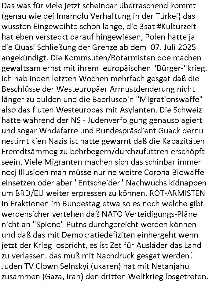 02.07.2025 20:30 Das was für viele jetzt scheinbar überraschend kommt (genau wie dei Imamolu Verhaftung in der Türkei) das wussten Eingeweihte schon lange, die 3sat #Kulturzeit hat eben versteckt darauf hingewiesen, Polen hatte ja die Quasi Schließung der Grenze ab dem 07. Juli 2025 angekündigt. Die Kommsuten/Rotarmisten doe machen gewaltsam ernst mit ihrem europäischen "Bürger-"krieg. Ich hab inden letzten Wochen mehrfach gesgat daß die Beschlüsse der Westeuropäer Armustdenderung nicht länger zu dulden und die Baerluscoin "Migrationswaffe" also das fluten Westeuropas mit Asylanten. Die Schweiz hatte während der NS - Judenverfolgung genauso agiert und sogar Wndefarre und Bundespräsdient Guack dernu nestimt kien Nazis ist hatte gewarnt daß die Kapazitäten Fremdtsämmeg zu behrbegern/durchzufüttren erschöpft seein. Viele Migranten machen sich das schinbar immer nocj Illusioen man müsse nur ne weitre Corona Biowaffe einsetzen oder aber "Entscheider" Nachwuchs kidnappen um BRD/EU weiter erpressen zu können. ROT-ARMISTEN in Fraktionen im Bundestag etwa so es noch welche gibt werdensicher vertehen daß NATO Verteidigungs-Pläne nicht an "Spione" Putns durchgereicht werden können und daß das mit Demokratiedefiziten einhergeht wenn jetzt der Krieg losbricht, es ist Zet für Ausläder das Land zu verlassen. das muß mit Nachdruck gesgat werden! Juden TV Clown Selnskyi (ukaren) hat mit Netanjahu zusammen (Gaza, Iran) den dritten Weltkrieg losgetreten. https://www.bild.de/politik/ausland-und-internationales/eu-kommission-misstrauensantrag-gegen-ursula-von-der-leyen-68655d2d5ccab23ab11a7ba5 https://www.bild.de/politik/ausland-und-internationales/belgrad-polizei-setzt-traenengas-bei-massenprotesten-ein-6860e2c754352c1fc4b3071a [0] "202507022030-0-1.jpg" [1] "202507022030-0-2.jpg" [2] "202507022030-0-3.jpg" |