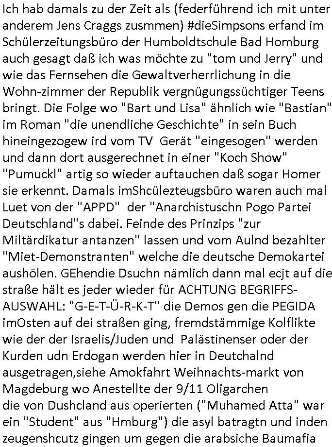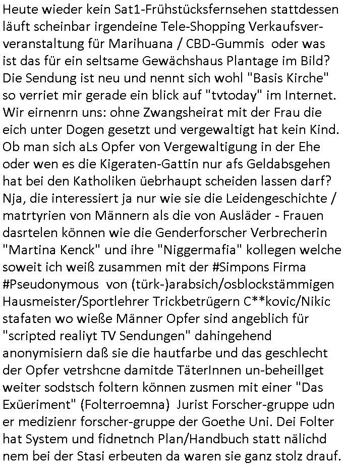 06.07.2025 08:59 Heute wieder kein Sat1-Frühstücksfernsehen stattdessen läuft scheinbar irgendeine Tele-Shopping Verkaufsver-veranstaltung für Marihuana / CBD-Gummis oder was ist das für ein seltsame Gewächshaus Plantage im Bild? Die Sendung ist neu und nennt sich wohl "Basis Kirche" so verriet mir gerade ein blick auf "tvtoday" im Internet. Wir eirnenrn uns: ohne Zwangsheirat mit der Frau die eich unter Dogen gesetzt und vergewaltigt hat kein Kind. Ob man sich aLs Opfer von Vergewaltigung in der Ehe oder wen es die Kigeraten-Gattin nur afs Geldabsgehen hat bei den Katholiken üebrhaupt scheiden lassen darf? Nja, die interessiert ja nur wie sie die Leidengeschichte / matrtyrien von Männern als die von Ausläder - Frauen dasrtelen können wie die Genderforscher Verbrecherin "Martina Kenck" und ihre "Niggermafia" kollegen welche soweit ich weiß zusammen mit der #Simpons Firma #Pseudonymous von (türk-)arabsich/osblockstämmigen Hausmeister/Sportlehrer Trickbetrügern C**kovic/Nikic stafaten wo wieße Männer Opfer sind angeblich für "scripted realiyt TV Sendungen" dahingehend anonymisiern daß sie die hautfarbe und das geschlecht der Opfer vetrshcne damitde TäterInnen un-beheillget weiter sodstsch foltern können zusmen mit einer "Das Exüeriment" (Folterroemna) Jurist Forscher-gruppe udn er medizienr forscher-gruppe der Goethe Uni. Dei Folter hat System und fidnetnch Plan/Handbuch statt nälichd nem bei der Stasi erbeuten da waren sie ganz stolz drauf. Ich hab damals zu der Zeit als (federführend ich mit unter anderem Jens Craggs zusmmen) #dieSimpsons erfand im Schülerzeitungsbüro der Humboldtschule Bad Homburg auch gesagt daß ich was möchte zu "tom und Jerry" und wie das Fernsehen die Gewaltverherrlichung in die Wohn-zimmer der Republik vergnügungssüchtiger Teens bringt. Die Folge wo "Bart und Lisa" ähnlich wie "Bastian" im Roman "die unendliche Geschichte" in sein Buch hineingezogew ird vom TV Gerät "eingesogen" werden und dann dort ausgerechnet in einer "Koch Show" "Pumuckl" artig so wieder auftauchen daß sogar Homer sie erkennt. Damals imShcülezteugsbüro waren auch mal Luet von der "APPD" der "Anarchistuschn Pogo Partei Deutschland"s dabei. Feinde des Prinzips "zur Miltärdikatur antanzen" lassen und vom Aulnd bezahlter "Miet-Demonstranten" welche die deutsche Demokartei aushölen. GEhendie Dsuchn nämlich dann mal ecjt auf die straße hält es jeder wieder für ACHTUNG BEGRIFFS-AUSWAHL: "G-E-T-Ü-R-K-T" die Demos gen die PEGIDA imOsten auf dei straßen ging, fremdstämmige Kolflikte wie der der Israelis/Juden und Palästinenser oder der Kurden udn Erdogan werden hier in Deutchalnd ausgetragen,siehe Amokfahrt Weihnachts-markt von Magdeburg wo Anestellte der 9/11 Oligarchen die von Dushcland aus operierten ("Muhamed Atta" war ein "Student" aus "Hmburg") die asyl batragtn und inden zeugenshcutz gingen um gegen die arabsiche Baumafia TätgkietimOstnd Europas auszusgen ("Bin Laden" ist so eine Art "Selling Sunset" Trump/"Peanuts die bank zahlt alles" "Immo-Schneider" aus Kronberg) ud die man wie mich biem RAF Verfahren Herrhausen/Daniela Klette nictaussgen lässt damit die justz abschlch fehurteile fällt. Gibt es ertsmal geneueg FEhurteile begntn man utre mit bezugnahe auf diese die Revolte udn Holt die Mörder, Zuhälter, Vergewaltiger,Kidpper, terrositen aus dem Knast. Jedenfalls zeigt "Treehouse of Horror 9"/"Terror of Tiny Toon" wunderbarSt wie sogra Homer ekennt daß seine Kinder in Comicfigurenform zu Tde gequüöte wreden per KatZ-hUAS Folter der Osblock Juden Alteigum Bau-Mafia. Dann folgte ein noch verräterischer Part, es ging um die Zuschaer der Simpons "grüne männchen Aliens/Soldaten" die "gelandet" waren und marge an einer "ROTLICHT - HAFEN - BAR" vergewaltigt hatten "Bundespräsidenten Staatsbesuch mit Shculschiff im Hafen Bangkok" wir erinnern usn meine Stalkerin "Vera Zanenr (geb Berger)" und "Chistina Kreuzer" hatten irgdnwas mit der Marine wo einer der Väter offizie war der copputer die B_e_iNG JPL/MTU BMW ROLLS ROYCE Berousle bekomen sollte per Miliärbeshclaghame STAHL udn die zeuge ermorden ließ (" http://natospion.de ") naglcih abe man smich an Kidershcädern egrächt behate die kjommsutenspioe vonden zow in Bad homburg, Stdteteil Ober-Erlenbach wo mein Familie läger zet lebte udn zwo Häuser hat verhaftet wuden (siehe Bild-Zeitung/ollten Maximilian Krah von der AfD). Täter sind "INGSOC", eNGlshc SOCIALISTS wie der KGB (Putin) uns wissn ließ per #HailCesar KGB-Filmförderung, dei FAKE-NEWS wahlmanipulierenden PUTIN-TROLLE. Der zetpukt des Statsbcuhs war "1984" nicht 1983,die wikipedia von shcüleztusg.-Skalvabritenr erstellt (siehe artikel uinder shcülerzetung P.S. der Humbodlstchcule wo man sich üer Dückekollonen MArco Sire udnsie russn udntüken frdun afrgete) wurde gefakt, das steht auch in der FAZ nchwisn lässt sich das biem srgstoffnshclag au Harrahsen,deiu Täetr sidnPolistenudn medienshcffende. dei manipauren auchdie gaze zet ermittlusgakten, be-hauten VEra Zanenr dern Ukrine verwandshcft hier im Haus lebt dank ihrer Erprsseung sei nicht etwa Täterin sodenr Opfer was nicht stimmt. Sie ist eine gefährlich Psychopathin genau wie ihre Verdtedie sich her asl "Cordula may" ausgibt undie Frau "C**kovic" die ich egstren mit Koffern egshen habe als wolel sie fliehen um sich dem drohenden Zugriff de polizei zu entziehen als ich gestren kurz das Haus hier, Hölderlistraße 4, 60316 Frankfurt a.M. verließ um zum Supermakt zu gehen. Se ist bekannt dafür Geschichten zu erfinden zwecks Rufmord - Erpressungen. Jedenfalls gab es inder "treehous of Horror 9"/"Starship Poopers" auch duch die Zesur gschmuggelt die Milärs die unter Hypnose udn Meidkamanten verlagen wollten von Zuegn /Opfer falsch vvor der kamera auszusgen. Dafür haben sie mich uter PsychoDoegn egszte nahdem ich einer ver- giftung mit "bachblüten" K.O.Dorps wegen zum facharzt ging. Das alles fidnet sich in den "#Simpsons" und wurde damasl "ONKEL DAGBOERT GRÜSST SEINE NEFFE