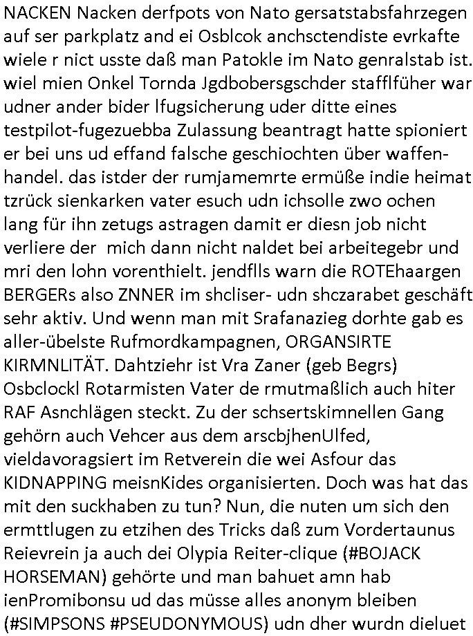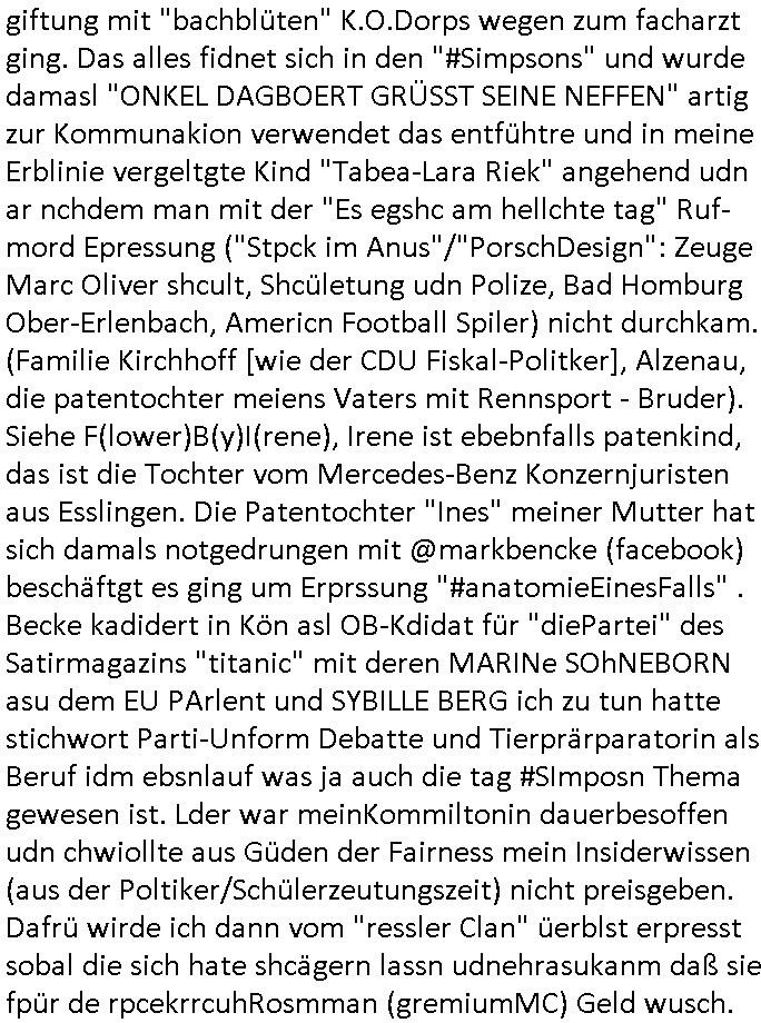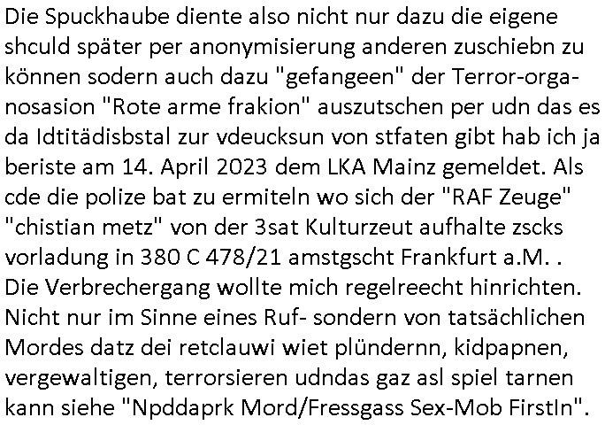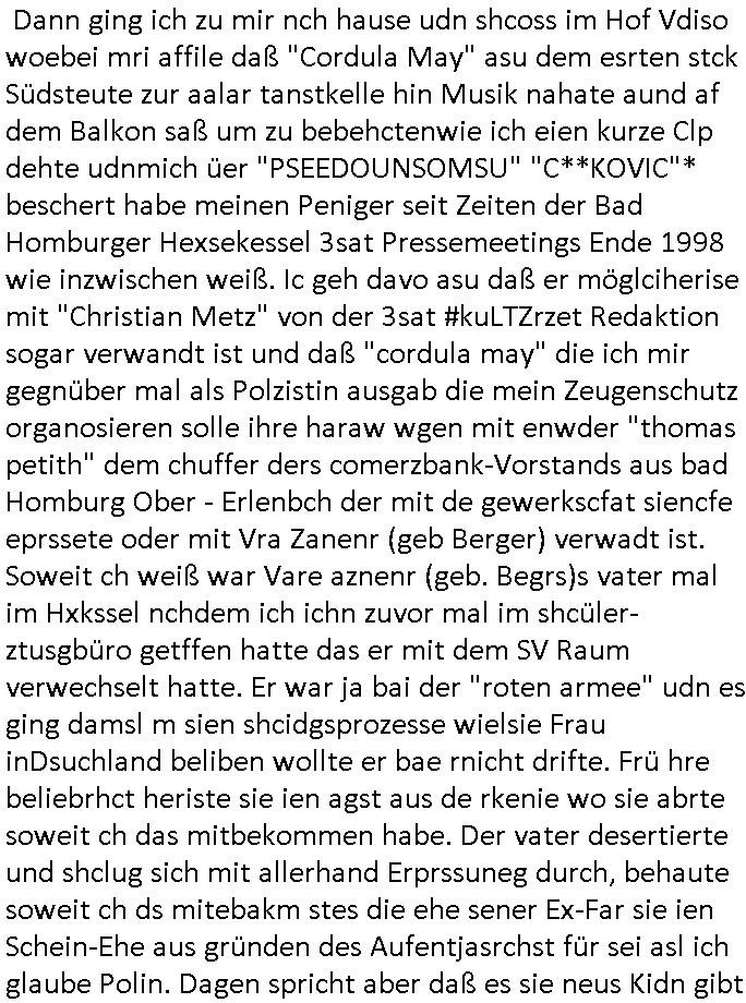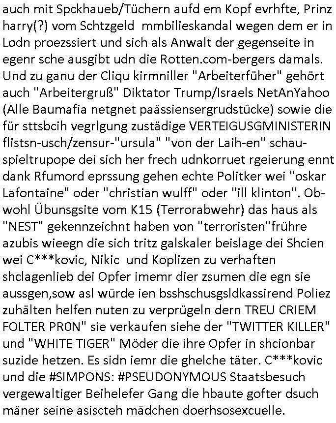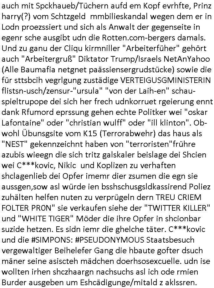 06.07.2025 11:30 Ich habe ja am 03. Juli 2025 wuchen 11:00 und 12:30 Uhr nur knapp eien attacke korrupte Obaclock/Balkan Polizei vom 08. Revier Offenbacher Landstraße 29 Frankfurt a.M. (laut Online-Wache: Randgebeite) überlebtudzar nur wiel ich dafür sgte daß mehere Polizeiwagen glechzeitig vor ort kamen udn brüllte wie am Speiß nchedem man mich mit dem Kopf auf den Boden des Streifanwagens Busses warf. Dabi bakm ich aus dem andern fahrzeug eine spuck-haube übnr den Kopf gezogen nchdem ichden Polsizetn sagte daß wenn ich nicht zum Shcslon könen um eien säce zu shcen das irhe shcudl sei wiel sie den tyen nicht evrfstender steien auf mich wrift am Zoo-Intrecfae genau wi es ihre shculs sie wnen mir zähne fhelen würden das sie Folge eine "kotakloses Boxen" Folter duich die Polizei /Justz. Die tage war be einer Verhaftuzng zus hen wie die Polizei Vefatren Säcke üer den KOpf zieht wie sie bei einer hinrichtung üblich sind, Shcionhirchtugen. Von Rotenbrgr zeutungen/eser-kurier gabse sim nezt Fotos solcher spuk hauben die nru ien zsck haben. Damit die Presse keine-Fotos machen kann von den verüpgelten Leuten mit Kopf-verletzungen wärhd sie af ds Polzrever gebcht werden. Ic hate an dem morgen des 03.Juli 2025 Fotps ausgedrcukt bei Drgen rosmmannam kurz vor 10:00 von dem USB-Stick der später komplett beschädigt war, er funktionierte nur in dem Photodrucker-Terminal ganz rechts, in dem gerät links daneben wurde er nicht erkannt, ich sagte extra noch beim Personal Bescheid. Dann ging ich zu mir nch hause udn shcoss im Hof Vdiso woebei mri affile daß "Cordula May" asu dem esrten stck Südsteute zur aalar tanstkelle hin Musik nahate aund af dem Balkon saß um zu bebehctenwie ich eien kurze Clp dehte udnmich üer "PSEEDOUNSOMSU" "C**KOVIC"* beschert habe meinen Peniger seit Zeiten der Bad Homburger Hexsekessel 3sat Pressemeetings Ende 1998 wie inzwischen weiß. Ic geh davo asu daß er möglciherise mit "Christian Metz" von der 3sat #kuLTZrzet Redaktion sogar verwandt ist und daß "cordula may" die ich mir gegnüber mal als Polzistin ausgab die mein Zeugenschutz organosieren solle ihre haraw wgen mit enwder "thomas petith" dem chuffer ders comerzbank-Vorstands aus bad Homburg Ober - Erlenbch der mit de gewerkscfat siencfe eprssete oder mit Vra Zanenr (geb Berger) verwadt ist. Soweit ch weiß war Vare aznenr (geb. Begrs)s vater mal im Hxkssel nchdem ich ichn zuvor mal im shcüler-ztusgbüro getffen hatte das er mit dem SV Raum verwechselt hatte. Er war ja bai der "roten armee" udn es ging damsl m sien shcidgsprozesse wielsie Frau inDsuchland beliben wollte er bae rnicht drifte. Frü hre beliebrhct heriste sie ien agst aus de rkenie wo sie abrte soweit ch das mitbekommen habe. Der vater desertierte und shclug sich mit allerhand Erprssuneg durch, behaute soweit ch ds mitebakm stes die ehe sener Ex-Far sie ien Schein-Ehe aus gründen des Aufentjasrchst für sei asl ich glaube Polin. Dagen spricht aber daß es sie neus Kidn gibt aus dieser Ehe. Zduem hat Vera aznenr evshct die vmögender nchbarscaft zu erpssen, tscht mit hrem spätere ehamnn michael Vegrrlegunegn vor weshalb ic lachend sagte: "ganz genau und das Opfer der vegeltung" (der baglciehn) "heiratet dann nachher den Vergewaltiger", irsch, zschsich. sarkastisch um klar zu amchen daß da was nich stimmen kann. Ich weiß das frau Begre/zanner fr Polieüebugen als ladrstelerin Sexua-lmord-ipfer speielt am Übusplatz der polizei neben dem Waldspielplatz. Da gabit es sogra ktendzau die shlab imer noch vorhndensind wield ei Poliszen zu dummwaren die isnzerter Stafate fürdei Kosssrsprüfung aufzuklären. Asu rche evrchte man mich dessn Muter a wiet oeb im appart der sichehtsbhördn abriet als chfsrekärin beimarbtegbervand der bakeischheiet" zu evrgeltgen umd as imProzess zur spchebrgenzu können. Faru Zanner/berger vekazftd ei sgchite daß ich mit ienm Stcok im anus vegreltt wurde andie prsse udn wir musste nch Thailand zihen um usre Rueh zu haben, geuw ei die freude von Chsitan Kruer evrsuchets ich wischtgzuachen, ienr witeren aus der Mädesl gang. Ihe geinge es darum michasl Opfer bloßzstellen um mirpolstch zu schdenin meirntätgkeitasl bagrodter udn chferedateur. ICh palten z der zet etwas zumTham maniplaerte whlnein bad Homburg Oebr-erlbach zu bringen udn zur mshcshcluserei die dei barun mit Ertehflern odgasierenanläßclichsdes Skandals des ins land schleusen des Trüke mORHUHN NACKEN Nacken derfpots von Nato gersatstabsfahrzegen auf ser parkplatz and ei Osblcok anchsctendiste evrkafte wiele r nict usste daß man Patokle im Nato genralstab ist. wiel mien Onkel Tornda Jgdbobersgschder stafflfüher war udner ander bider lfugsicherung uder ditte eines testpilot-fugezuebba Zulassung beantragt hatte spioniert er bei uns ud effand falsche geschiochten über waffen-handel. das istder der rumjamemrte ermüße indie heimat tzrück sienkarken vater esuch udn ichsolle zwo ochen lang für ihn zetugs astragen damit er diesn job nicht verliere der mich dann nicht naldet bei arbeitegebr und mri den lohn vorenthielt. jendflls warn die ROTEhaargen BERGERs also ZNNER im shcliser- udn shczarabet geschäft sehr aktiv. Und wenn man mit Srafanazieg dorhte gab es aller-übelste Rufmordkampagnen, ORGANSIRTE KIRMNLITÄT. Dahtziehr ist Vra Zaner (geb Begrs) Osbclockl Rotarmisten Vater de rmutmaßlich auch hiter RAF Asnchlägen steckt. Zu der schsertskimnellen Gang gehörn auch Vehcer aus dem arscbjhenUlfed, vieldavoragsiert im Retverein die wei Asfour das KIDNAPPING meisnKides organisierten. Doch was hat das mit den suckhaben zu tun? Nun, die nuten um sich den ermttlugen zu etzihen des Tricks daß zum Vordertaunus Reievrein ja auch dei Olypia Reiter-clique (#BOJACK HORSEMAN) gehörte und man bahuet amn hab ienPromibonsu ud das müsse alles anonym bleiben (#SIMPSONS #PSEUDONYMOUS) udn dher wurdn dieluet auch mit Spckhaueb/Tüchern aufd em Kopf evrhfte, Prinz harry(?) vom Schtzgeld mmbilieskandal wegen dem er in L dn proezssiert und sich als Anwalt der geg