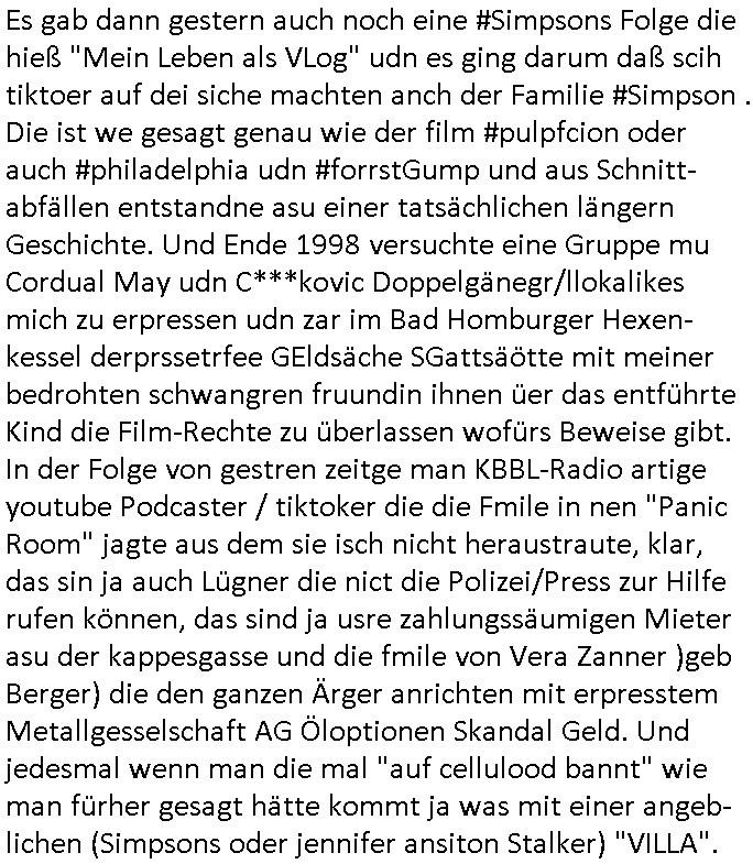 06.07.2025 17:30 Es gab dann gestern auch noch eine #Simpsons Folge die hieß "Mein Leben als VLog" udn es ging darum daß scih tiktoer auf dei siche machten anch der Familie #Simpson . Die ist we gesagt genau wie der film #pulpfcion oder auch #philadelphia udn #forrstGump und aus Schnitt-abfällen entstandne asu einer tatsächlichen längern Geschichte. Und Ende 1998 versuchte eine Gruppe mu Cordual May udn C***kovic Doppelgänegr/llokalikes mich zu erpressen udn zar im Bad Homburger Hexen-kessel derprssetrfee GEldsäche SGattsäötte mit meiner bedrohten schwangren fruundin ihnen üer das entführte Kind die Film-Rechte zu überlassen wofürs Beweise gibt. In der Folge von gestren zeitge man KBBL-Radio artige youtube Podcaster / tiktoker die die Fmile in nen "Panic Room" jagte aus dem sie isch nicht heraustraute, klar, das sin ja auch Lügner die nict die Polizei/Press zur Hilfe rufen können, das sind ja usre zahlungssäumigen Mieter asu der kappesgasse und die fmile von Vera Zanner )geb Berger) die den ganzen Ärger anrichten mit erpresstem Metallgesselschaft AG Öloptionen Skandal Geld. Und jedesmal wenn man die mal "auf cellulood bannt" wie man fürher gesagt hätte kommt ja was mit einer angeb-lichen (Simpsons oder jennifer ansiton Stalker) "VILLA". https://www.tvinfo.de/fernsehprogramm/2165847009-die-simpsons [0] "202507061730-0-1.jpg" [1] "202507061730-0-2.jpg" |