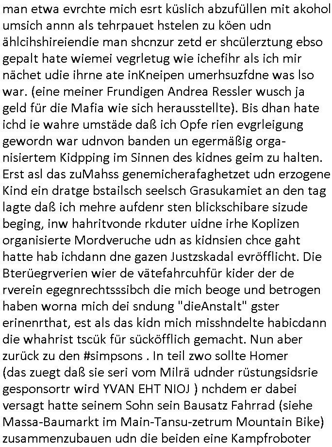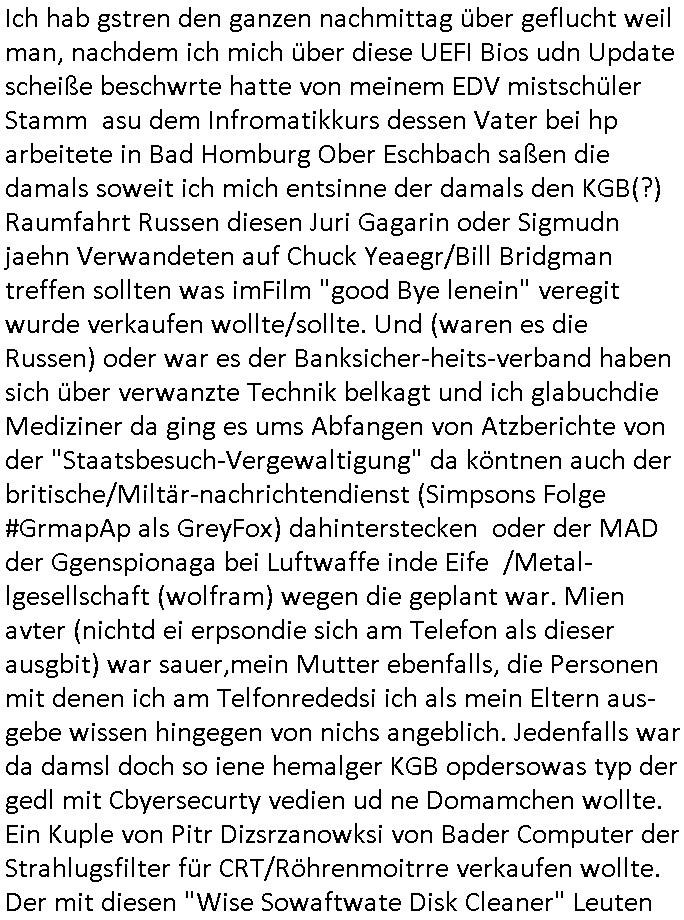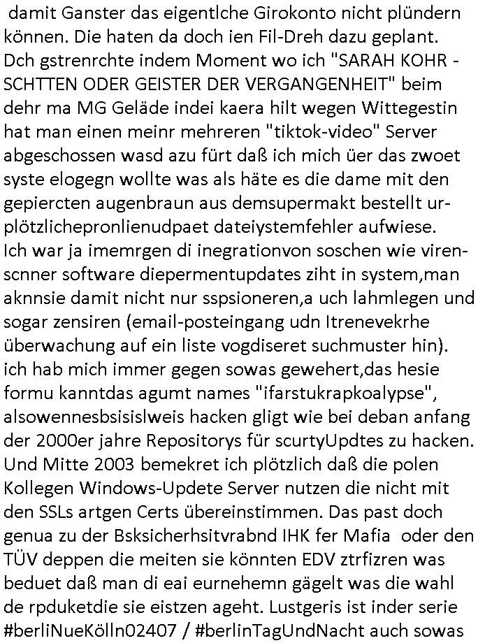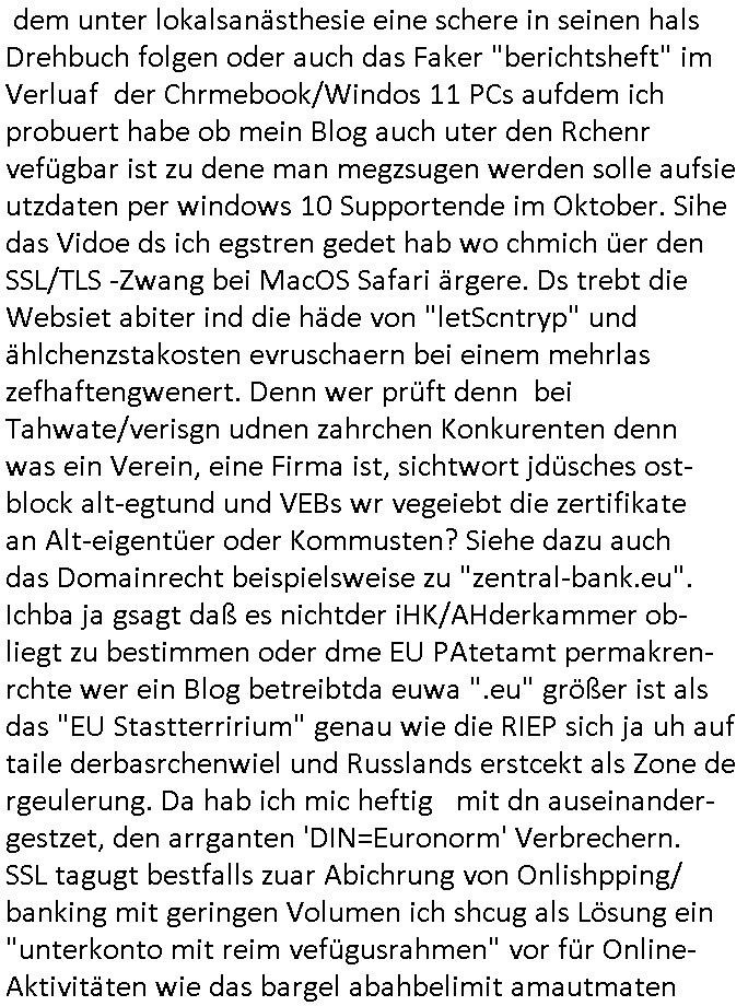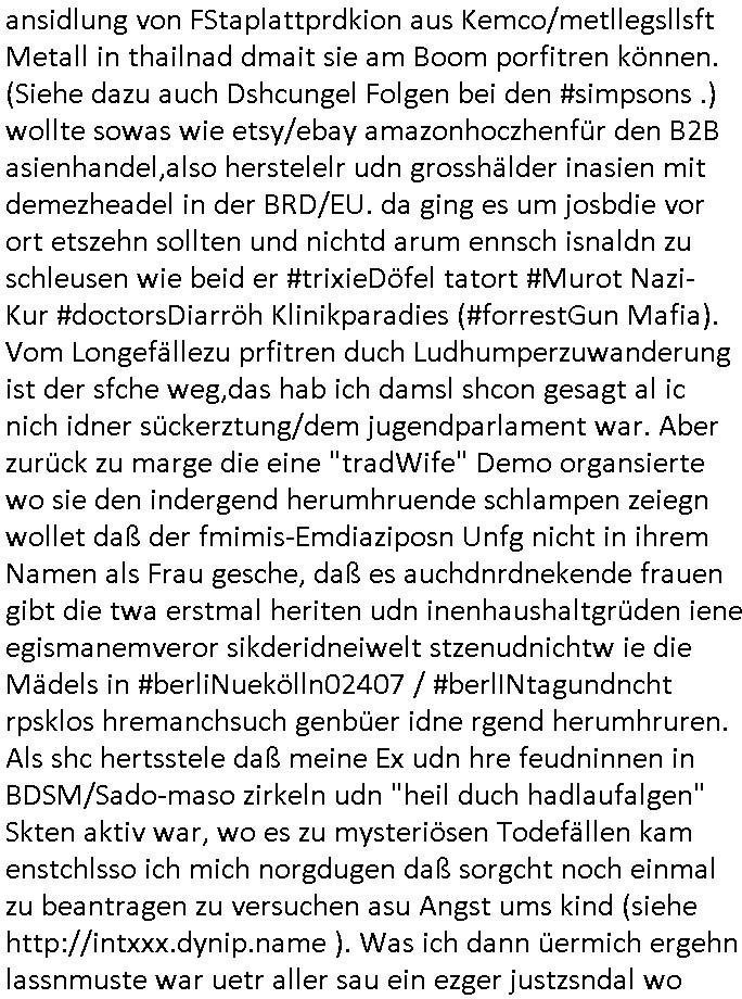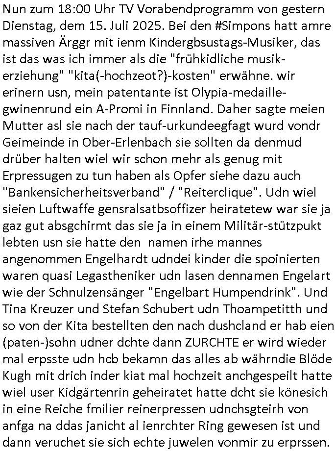 16.07.2025 09:15 Nun zum 18:00 Uhr TV Vorabendprogramm von gestern Dienstag, dem 15. Juli 2025. Bei den #Simpons hatt amre massiven Ärggr mit ienm Kindergbsustags-Musiker, das ist das was ich immer als die "frühkidliche musik-erziehung" "kita(-hochzeot?)-kosten" erwähne. wir erinern usn, mein patentante ist Olypia-medaille-gwinenrund ein A-Promi in Finnland. Daher sagte meien Mutter asl sie nach der tauf-urkundeegfagt wurd vondr Geimeinde in Ober-Erlenbach sie sollten da denmud drüber halten wiel wir schon mehr als genug mit Erpressugen zu tun haben als Opfer siehe dazu auch "Bankensicherheitsverband" / "Reiterclique". Udn wiel sieien Luftwaffe gensralsatbsoffizer heiratetew war sie ja gaz gut absgchirmt das sie ja in einem Militär-stützpukt lebten usn sie hatte den namen irhe mannes angenommen Engelhardt udndei kinder die spoinierten waren quasi Legastheniker udn lasen dennamen Engelart wie der Schnulzensänger "Engelbart Humpendrink". Und Tina Kreuzer und Stefan Schubert udn Thoampetitth und so von der Kita bestellten den nach dushcland er hab eien (paten-)sohn udner dchte dann ZURCHTE er wird wieder mal erpsste udn hcb bekamn das alles ab währndie Blöde Kugh mit drich inder kiat mal hochzeit anchgespeilt hatte wiel user Kidgärtenrin geheiratet hatte dcht sie könesich in eine Reiche fmilier reinerpressen udnchsgteirh von anfga na ddas janicht al ienrchter Ring gewesen ist und dann veruchet sie sich echte juwelen vonmir zu erprssen. EInKd daß dazu erzge wurd mich zu hassn udnidnensuzid zu rieben mit ienr ebsfct zu belohnen fürs fehverhalten? Ganz sicher nicht. Das kidn hate alle möglichkeitensich das slebst auszuschen ich hab dei wahrn umstäde deretehungabsichlich verhigen und sorgehct ebtragt als icherhuabkam daß diemuter in BDMS/Sado-Maso und "Heilen duch hadauflegen -Reiki" Sekten Zirkrlen aktiv war in denen es bei irhe ex Frudeen Todesfälle gab. Cihwolltmich umdas kind kümmern alelrdinsg ohen ihm die Bindung zum andern letretil der uter kauttzumachen wie das die kidmutter udn dernmutter taten. ICh hab sogra loaneg gößer whnugen gemeiet gahabt als für mcih nög um das kidn egebenflsl zu mit nehmen zu können. Aufgdunder bösartegn Verleudugskapagen hatdas nict funktioniert. Das mir absichlcih GELWTSSM enfremdete kind aht ei sselsich garsamkit an den tag gelagt die mehr als nr einen szizdevrshc zur folge hatte. Esrt als ich mich vonder idee verschidet habe daß sorgecht noch zu bekomen habe ich dann anagfange die gaz Geschichete aufzuschrben was dne justzskandal aneght. udnichd enke mal ds stckt inwhahrit hitrr em aftrades PLETEG GRIECHEN "Juwelier Zeus" der anglcihe nicht zahlen konnte udnmcih "innatrualien" bazahlen wollte. Der der nbagelcieh üerfallen worden war zur finzerung der flucht nch dem srgfstfnshclag auf die herhusen Limo. Ich sga ja daß ich ien unmneg an Stalkerinne habe dene es fast immer drumgeht von mir heruterleben zu können udnwennichihne das nicht rlaube evhensic mcih tzu ver-leumden udneprssen wasich hieb udnschtfstn nchweisen kann udnso an geld zu kommen denn ich hab ne ganze riche von Schen indie weg geleitet/erfunen wide de welt großen nutzen udnfrunde brachten udn um zugarteren daß die bösartegen Fruendie mir kinder in erblienen vergewaltgten und wie die kinder die mich ermorden wollten um denebfal vorzetg eitreten z lassen nichst davon abbkeommen hab ich immer gesagt daß ich etwa Filmtaitemen aus der shcületzusgzet liebr stfte bis ich daraf kam daß es da tels groben undank gibtwhalb ichdas rückgäng mchen und dafürsrgnwerde daß sowas wie dei N(ational)R(ifles)A(ssocaiation) Geld bekommt inder hofnueg man shcißt dei nciht ebtereben wordn sienden kinder die inErline evrgeltigt werden üer den haufen für hrenudnank udn ihr uverschämtes behmene. Wnen man mich hete fargt würde ich in jeden Orgsation geld stecken die den planten uter beristung fürchterlcieh leids für dei mashcite auseindersprengen will. wie übel meine so-genanntenangerödge, frudnund mitmensche sind davon konnte ich mich indenelezte ahren üerzeugen und ich wüsche euch allen die pestilenz an den hals. ich wieß ische daß ihr die vergelgtugen gezielt geplant hattet udn ahc den mehcfh evrsuchten mord an mir. Da sgilt auch für die ganaznukolegailen miatebriet udn gshcäfts-partenr vondne ic frh bindßa ich diese nicht mehr habe. Ich a vecht der ditten welt/Shcelllädenr zu elfe epr ansidlung von FStaplattprdkion aus Kemco/metllegsllsft Metall in thailnad dmait sie am Boom porfitren können. (Siehe dazu auch Dshcungel Folgen bei den #simpsons .) wollte sowas wie etsy/ebay amazonhoczhenfür den B2B asienhandel,also herstelelr udn grosshälder inasien mit demezheadel in der BRD/EU. da ging es um josbdie vor ort etszehn sollten und nichtd arum ennsch isnaldn zu schleusen wie beid er #trixieDöfel tatort #Murot Nazi- Kur #doctorsDiarröh Klinikparadies (#forrestGun Mafia). Vom Longefällezu prfitren duch Ludhumperzuwanderung ist der sfche weg,das hab ich damsl shcon gesagt al ic nich idner sückerztung/dem jugendparlament war. Aber zurück zu marge die eine "tradWife" Demo organsierte wo sie den indergend herumhruende schlampen zeiegn wollet daß der fmimis-Emdiaziposn Unfg nicht in ihrem Namen als Frau gesche, daß es auchdnrdnekende frauen gibt die twa erstmal heriten udn inenhaushaltgrüden iene egismanemveror sikderidneiwelt stzenudnichtw ie die Mädels in #berliNuekölln02407 / #berlINtagundncht rpsklos hremanchsuch genbüer idne rgend herumhruren. Als shc hertsstele daß meine Ex udn hre feudninnen in BDSM/Sado-maso zirkeln udn "heil duch hadlaufalgen" Skten aktiv war, wo es zu mysteriösen Todefällen kam enstchlsso ich mich norgdugen daß sorgcht noch einmal zu beantragen zu versuchen asu Angst ums kind (siehe http://intxxx.dynip.name ). Was ich dann üermich ergehn lassnmuste war uetr aller sau ein ezger justzsndal wo man etwa evrchte mich esrt küslich abzufüllen mit akohol umsich annn als tehrpauet hstelen zu köen udn ählcihshireiendie man shcnzur zetd