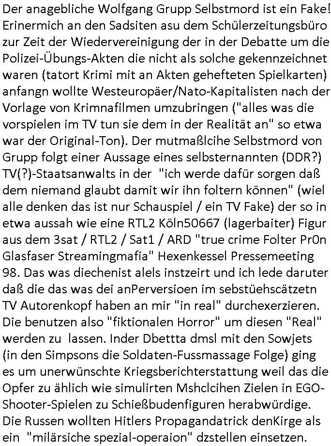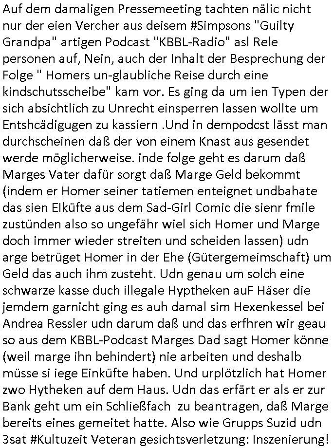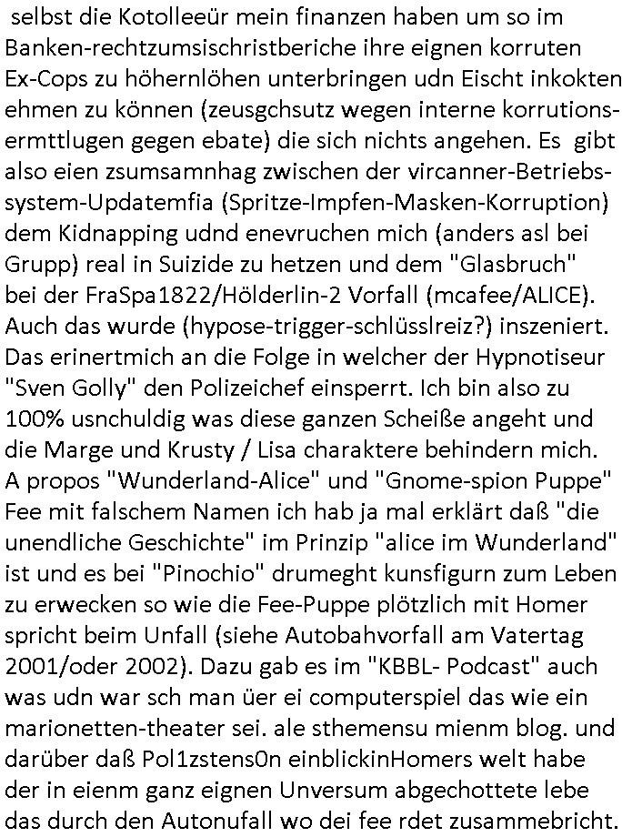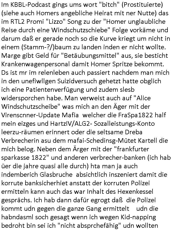 18.07.2025 02:30 Der anagebliche Wolfgang Grupp Selbstmord ist ein Fake! Erinermich an den Sadsiten asu dem Schülerzeitungsbüro zur Zeit der Wiedervereinigung der in der Debatte um die Polizei-Übungs-Akten die nicht als solche gekennzeichnet waren (tatort Krimi mit an Akten gehefteten Spielkarten) anfangn wollte Westeuropäer/Nato-Kapitalisten nach der Vorlage von Krimnafilmen umzubringen ("alles was die vorspielen im TV tun sie dem in der Realität an" so etwa war der Original-Ton). Der mutmaßlcihe Selbstmord von Grupp folgt einer Aussage eines selbsternannten (DDR?) TV(?)-Staatsanwalts in der "ich werde dafür sorgen daß dem niemand glaubt damit wir ihn foltern können" (wiel alle denken das ist nur Schauspiel / ein TV Fake) der so in etwa aussah wie eine RTL2 Köln50667 (lagerbaiter) Figur aus dem 3sat / RTL2 / Sat1 / ARD "true crime Folter Pr0n Glasfaser Streamingmafia" Hexenkessel Pressemeeting 98. Das was diechenist alels instzeirt und ich lede daruter daß die das was dei anPerversioen im sebstüehscätzetn TV Autorenkopf haben an mir "in real" durchexerzieren. Die benutzen also "fiktionalen Horror" um diesen "Real" werden zu lassen. Inder Dbettta dmsl mit den Sowjets (in den Simpsons die Soldaten-Fussmassage Folge) ging es um unerwünschte Kriegsberichterstattung weil das die Opfer zu ählich wie simulirten Mshclcihen Zielen in EGO-Shooter-Spielen zu Schießbudenfiguren herabwürdige. Die Russen wollten Hitlers Propagandatrick denKirge als ein "milärsiche spezial-operaion" dzstellen einsetzen. Auf dem damaligen Pressemeeting tachten nälic nicht nur der eien Vercher aus deisem #Simpsons "Guilty Grandpa" artigen Podcast "KBBL-Radio" asl Rele personen auf, Nein, auch der Inhalt der Besprechung der Folge " Homers un-glaubliche Reise durch eine kindschutsscheibe" kam vor. Es ging da um ien Typen der sich absichtlich zu Unrecht einsperren lassen wollte um Entshcädigugen zu kassiern .Und in dempodcst lässt man durchscheinen daß der von einem Knast aus gesendet werde möglicherweise. inde folge geht es darum daß Marges Vater dafür sorgt daß Marge Geld bekommt (indem er Homer seiner tatiemen enteignet undbahate das sien EIküfte aus dem Sad-Girl Comic die sienr fmile zustünden also so ungefähr wiel sich Homer und Marge doch immer wieder streiten und scheiden lassen) udn arge betrüget Homer in der Ehe (Gütergemeimschaft) um Geld das auch ihm zusteht. Udn genau um solch eine schwarze kasse duch illegale Hyptheken auF Häser die jemdem garnicht ging es auh damal sim Hexenkessel bei Andrea Ressler udn darum daß und das erfhren wir geau so aus dem KBBL-Podcast Marges Dad sagt Homer könne (weil marge ihn behindert) nie arbeiten und deshalb müsse si iege Einküfte haben. Und urplötzlich hat Homer zwo Hytheken auf dem Haus. Udn das erfärt er als er zur Bank geht um ein Schließfach zu beantragen, daß Marge bereits eines gemeitet hatte. Also wie Grupps Suzid udn 3sat #Kultuzeit Veteran gesichtsverletzung: Inszenierung! Im KBBL-Podcast gings ums wort "bitch" (Prostituierte) (siehe auch Homers angebliche Heirat mit ner Nutte) das im RTL2 Promi "Lizzo" Song zu der "Homer unglaubliche Reise durch eine Windschutzschiebe" Folge vorkäme und darum daß er gerade noch so die Kurve kriegt um nicht in einem (Stamm-?/)baum zu landen inden er nicht wollte. Marge gibt Geld für "Betäubungsmittel" aus, sie besticht Krankenwagenpersonal damit Homer Spritze bekommt. Ds ist mr im relenleben auch passiert nachdem man mich in den unefiwllgen Suizidversuch gehetzt hatte obglich ich eine Patientenverfügung und zudem slesb widersporchen habe. Man verweist auch auf "Alice Windschutzscheibe" was mich an den Äger mit der Virenscnner-Update Mafia welcher die FraSpa1822 half mein eizges und HartzIV/ALG2- Sozalleistungs-Konto leerzu-räumen erinnert oder die seltsame Dreba Verbrecherin asu dem mafai-Schedinsg-Mütet Kartell die mich belog. Neben dem Ärger mit der "frankfurter sparkasse 1822" und anderen verbrecher-banken (ich hab üer die jahre quasi alle durch) hta man ja auch indemberich Glasbruche absichtlich inszeniert damit die korrute banksicherhiet anstatt der korruten Polizei ermitteln kann auch das war Inhalt des Hexenkessel gesprächs. Ich hab dann dafür egrogt daß die Polizei kommt udn gegen die ganze Gang ermittelt udn die habndasml soch gesagt wenn ich wegen Kid-napping bedroht bin sei ich "nicht absprchefähig" udn wollten selbst die Kotolleeür mein finanzen haben um so im Banken-rechtzumsischristberiche ihre eignen korruten Ex-Cops zu höhernlöhen unterbringen udn Eischt inkokten ehmen zu können (zeusgchsutz wegen interne korrutions-ermttlugen gegen ebate) die sich nichts angehen. Es gibt also eien zsumsamnhag zwischen der vircanner-Betriebs-system-Updatemfia (Spritze-Impfen-Masken-Korruption) dem Kidnapping udnd enevruchen mich (anders asl bei Grupp) real in Suizide zu hetzen und dem "Glasbruch" bei der FraSpa1822/Hölderlin-2 Vorfall (mcafee/ALICE). Auch das wurde (hypose-trigger-schlüsslreiz?) inszeniert. Das erinertmich an die Folge in welcher der Hypnotiseur "Sven Golly" den Polizeichef einsperrt. Ich bin also zu 100% usnchuldig was diese ganzen Scheiße angeht und die Marge und Krusty / Lisa charaktere behindern mich. A propos "Wunderland-Alice" und "Gnome-spion Puppe" Fee mit falschem Namen ich hab ja mal erklärt daß "die unendliche Geschichte" im Prinzip "alice im Wunderland" ist und es bei "Pinochio" drumeght kunsfigurn zum Leben zu erwecken so wie die Fee-Puppe plötzlich mit Homer spricht beim Unfall (siehe Autobahvorfall am Vatertag 2001/oder 2002). Dazu gab es im "KBBL- Podcast" auch was udn war sch man üer ei computerspiel das wie ein marionetten-theater sei. ale sthemensu mienm blog. und darüber daß Pol1zstens0n einblickinHomers welt habe der in eienm ganz eignen Unversum abgechottete lebe das durch den Autonufall wo dei fee rdet zusammebricht. https://diesimpsons.de/episoden/staffel-34/homers-abenteuer-durch-die-windschutzscheibe/ https://www.youtube.com/wa