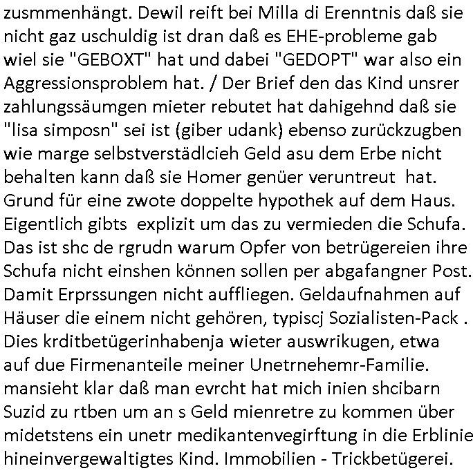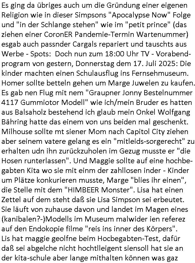 18.07.2025 05:45 Es ging da übriges auch um die Gründung einer eigenen Religion wie in dieser Simpsons "Apocalypse Now" Folge und "in der Schlange stehen" wie im "petit prince" (das ziehen einer CoronER Pandemie-Termin Wartenummer) esgab auch passnder Cargals repariert und tauschts aus Werbe - Spots: Doch nun zum 18:00 Uhr TV - Vorabend-program von gestern, Donnerstag dem 17. Juli 2025: Die kinder machten einen Schulausflug ins Fernsehmuseum. Homer sollte betteln gehen um Marge Juwelen zu kaufen. Es gab nen Flug mit nem "Graupner Jonny Bestelnummer 4117 Gummiotor Modell" wie ich/mein Bruder es hatten aus Balsaholz bestehend ich glaub mein Onkel Wolfgang Bähring hatte das einem von uns beiden mal geschenkt. Milhouse sollte mt siener Mom nach Capitol City ziehen aber seinem vatere gelang es ein "mitleids-sorgerecht" zu erhalten udn ihn zurückzuholen im Gezug musste er "die Hosen runterlassen". Und Maggie sollte auf eine hochbe-gabten Kita wo sie mit einm der zahllosen inder - Kinder um Plätze konkurieren musste, Marge "blies ihr einen", die Stelle mit dem "HIMBEER Monster". Lisa hat einen Zettel auf dem steht daß sie Lisa Simpson sei erbeutet. Sie läuft von zuhause davon und landet im Magen eines (kanibalen?-)Modells im Museum malwider ien referez auf den Endokopie filme "reis ins inner des Körpers". Lis hat maggie geolfne beim Hocbegabten-Test, dafür daß sei abgelche nicht hochtlleigent siensoll hat sie an der kita-schule aber lange mithalten können was gaz eidzig gegen di theorie eines Test-Fschergebisses spricht. Dann #berliNueKölln02407 / #berlinTagUndNacht wo Milla suaer ist und in eienr anderen WG wie sie haraus-bekommen hat daß alle in ihrem Umfeld vonder sache mit sharah udnmaikwusstenund sie angelogen haben. Milla die schon irhe tcohter Amelie rsguegeklet hat dei sie zur adoption ergegebenhatte liest den Brief von Mike. Scheinbar will er "seine Ehe retten" wegen des Kindes? Ist Mike denn der Vater? Oder braucht er das Geld asu der Witwen- und Waisenrente von Amlie das Milla für sch benutzt um "fogericeh gshcäfsrau" zu spielen währnd amlei neben der Schule arbeiten gehen muss umsich zu finanzeiren? War nicht der Vater von Amelie beim "ehe-rette"-Versuch umgkommen (familien #ehRen-mord)? Elias trifft derweil in einer Hotel-Lobby auf seine Tante die ihm eröffnte daß sien mutter ihr efeiheit ein "wildes leben" zu führen demkotakt zu kind vorgezogen hätte. sie wieß aber absolut nichts über dessn Mutte, also ihre Schwester, begündte dies wissenslücken dann damit daß man sich zerstritten habe, mi rkamm das nicht sodelche plausibel vor ich hat fast den enduck das war enkeltrick betrug und die frau gar nicht wielch mit elijas verwandt. ich eriner michs ehr giut an eien "direktor" der kinder adoptern wollte, hsrcilche um an eben an einenjob als direktor (im englsichen steht Dirctor wie in Drectrs-Cut das uch für REGIE-führung wie in REGIME) zu komm,en diemit der adoption von waisenkindern reicher erben zusmmenhängt. Dewil reift bei Milla di Erenntnis daß sie nicht gaz uschuldig ist dran daß es EHE-probleme gab wiel sie "GEBOXT" hat und dabei "GEDOPT" war also ein Aggressionsproblem hat. / Der Brief den das Kind unsrer zahlungssäumgen mieter rebutet hat dahigehnd daß sie "lisa simposn" sei ist (giber udank) ebenso zurückzugben wie marge selbstverstädlcieh Geld asu dem Erbe nicht behalten kann daß sie Homer genüer veruntreut hat. Grund für eine zwote doppelte hypothek auf dem Haus. Eigentlich gibts explizit um das zu vermieden die Schufa. Das ist shc de rgrudn warum Opfer von betrügereien ihre Schufa nicht einshen können sollen per abgafangner Post. Damit Erprssungen nicht auffliegen. Geldaufnahmen auf Häuser die einem nicht gehören, typiscj Sozialisten-Pack . Dies krditbetügerinhabenja wieter auswrikugen, etwa auf due Firmenanteile meiner Unetrnehemr-Familie. mansieht klar daß man evrcht hat mich inien shcibarn Suzid zu rtben um an s Geld mienretre zu kommen über midetstens ein unetr medikantenvegirftung in die Erblinie hineinvergewaltigtes Kind. Immobilien - Trickbetügerei. https://www.tvinfo.de/fernsehprogramm/2169844202-die-simpsons https://www.tvinfo.de/fernsehprogramm/2169844236-die-simpsons [0] "202507180545-0-1.jpg" [1] "202507180545-0-2.jpg" [2] "202507180545-0-3.jpg" [3] "202507180545-0-4.jpg" |