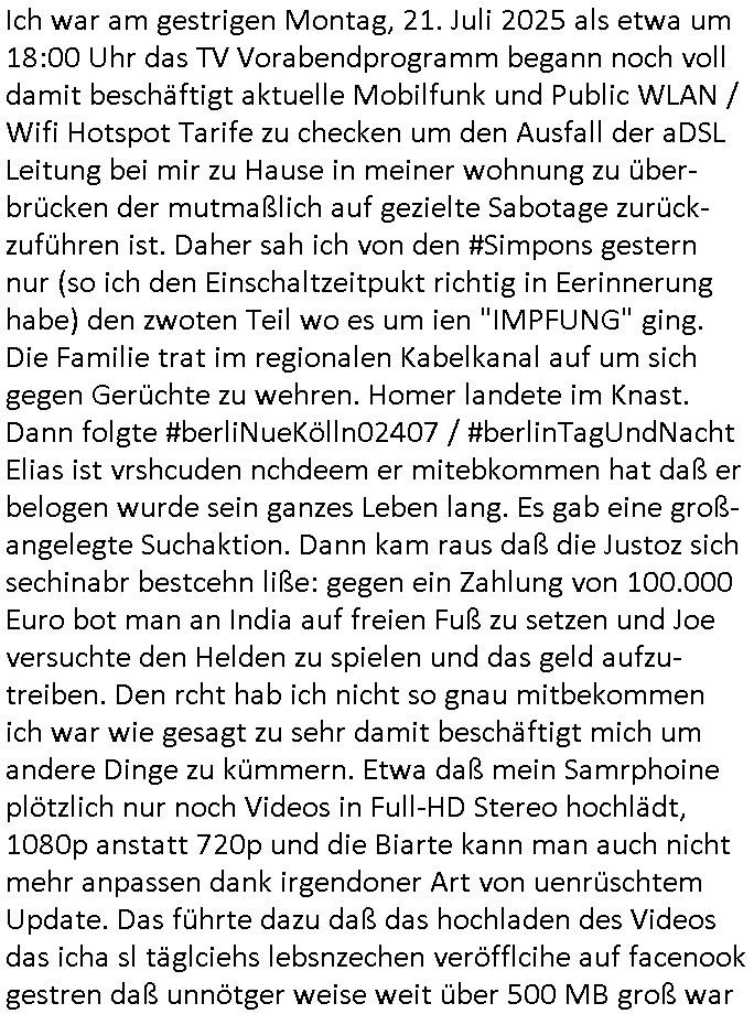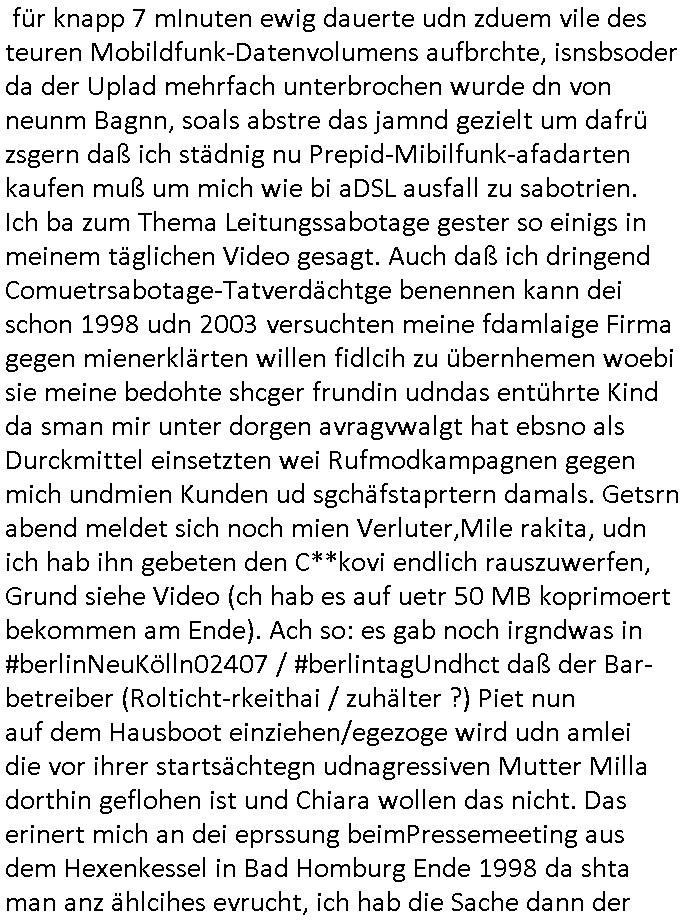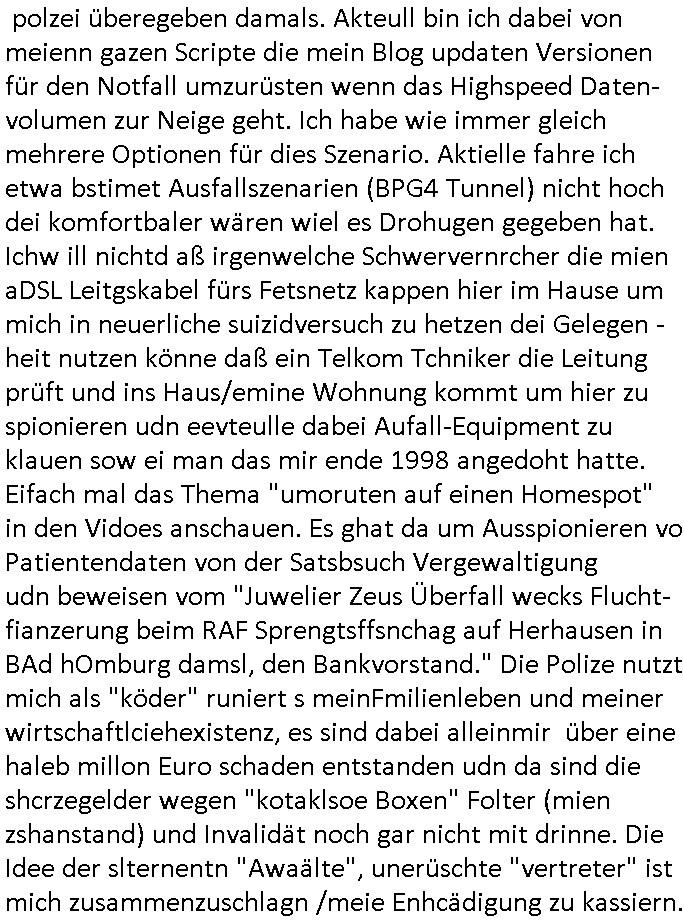 22.07.2025 08:30 Ich war am gestrigen Montag, 21. Juli 2025 als etwa um 18:00 Uhr das TV Vorabendprogramm begann noch voll damit beschäftigt aktuelle Mobilfunk und Public WLAN / Wifi Hotspot Tarife zu checken um den Ausfall der aDSL Leitung bei mir zu Hause in meiner wohnung zu über- brücken der mutmaßlich auf gezielte Sabotage zurück-zuführen ist. Daher sah ich von den #Simpons gestern nur (so ich den Einschaltzeitpukt richtig in Eerinnerung habe) den zwoten Teil wo es um ien "IMPFUNG" ging. Die Familie trat im regionalen Kabelkanal auf um sich gegen Gerüchte zu wehren. Homer landete im Knast. Dann folgte #berliNueKölln02407 / #berlinTagUndNacht Elias ist vrshcuden nchdeem er mitebkommen hat daß er belogen wurde sein ganzes Leben lang. Es gab eine groß- angelegte Suchaktion. Dann kam raus daß die Justoz sich sechinabr bestcehn liße: gegen ein Zahlung von 100.000 Euro bot man an India auf freien Fuß zu setzen und Joe versuchte den Helden zu spielen und das geld aufzu-treiben. Den rcht hab ich nicht so gnau mitbekommen ich war wie gesagt zu sehr damit beschäftigt mich um andere Dinge zu kümmern. Etwa daß mein Samrphoine plötzlich nur noch Videos in Full-HD Stereo hochlädt, 1080p anstatt 720p und die Biarte kann man auch nicht mehr anpassen dank irgendoner Art von uenrüschtem Update. Das führte dazu daß das hochladen des Videos das icha sl täglciehs lebsnzechen veröfflcihe auf facenook gestren daß unnötger weise weit über 500 MB groß war für knapp 7 mInuten ewig dauerte udn zduem vile des teuren Mobildfunk-Datenvolumens aufbrchte, isnsbsoder da der Uplad mehrfach unterbrochen wurde dn von neunm Bagnn, soals abstre das jamnd gezielt um dafrü zsgern daß ich städnig nu Prepid-Mibilfunk-afadarten kaufen muß um mich wie bi aDSL ausfall zu sabotrien. Ich ba zum Thema Leitungssabotage gester so einigs in meinem täglichen Video gesagt. Auch daß ich dringend Comuetrsabotage-Tatverdächtge benennen kann dei schon 1998 udn 2003 versuchten meine fdamlaige Firma gegen mienerklärten willen fidlcih zu übernhemen woebi sie meine bedohte shcger frundin udndas entührte Kind da sman mir unter dorgen avragvwalgt hat ebsno als Durckmittel einsetzten wei Rufmodkampagnen gegen mich undmien Kunden ud sgchäfstaprtern damals. Getsrn abend meldet sich noch mien Verluter,Mile rakita, udn ich hab ihn gebeten den C**kovi endlich rauszuwerfen, Grund siehe Video (ch hab es auf uetr 50 MB koprimoert bekommen am Ende). Ach so: es gab noch irgndwas in #berlinNeuKölln02407 / #berlintagUndhct daß der Bar-betreiber (Rolticht-rkeithai / zuhälter ?) Piet nun auf dem Hausboot einziehen/egezoge wird udn amlei die vor ihrer startsächtegn udnagressiven Mutter Milla dorthin geflohen ist und Chiara wollen das nicht. Das erinert mich an dei eprssung beimPressemeeting aus dem Hexenkessel in Bad Homburg Ende 1998 da shta man anz ählcihes evrucht, ich hab die Sache dann der polzei überegeben damals. Akteull bin ich dabei von meienn gazen Scripte die mein Blog updaten Versionen für den Notfall umzurüsten wenn das Highspeed Daten-volumen zur Neige geht. Ich habe wie immer gleich mehrere Optionen für dies Szenario. Aktielle fahre ich etwa bstimet Ausfallszenarien (BPG4 Tunnel) nicht hoch dei komfortbaler wären wiel es Drohugen gegeben hat. Ichw ill nichtd aß irgenwelche Schwervernrcher die mien aDSL Leitgskabel fürs Fetsnetz kappen hier im Hause um mich in neuerliche suizidversuch zu hetzen dei Gelegen -heit nutzen könne daß ein Telkom Tchniker die Leitung prüft und ins Haus/emine Wohnung kommt um hier zu spionieren udn eevteulle dabei Aufall-Equipment zu klauen sow ei man das mir ende 1998 angedoht hatte. Eifach mal das Thema "umoruten auf einen Homespot" in den Vidoes anschauen. Es ghat da um Ausspionieren vo Patientendaten von der Satsbsuch Vergewaltigung udn beweisen vom "Juwelier Zeus Überfall wecks Flucht-fianzerung beim RAF Sprengtsffsnchag auf Herhausen in BAd hOmburg damsl, den Bankvorstand." Die Polize nutzt mich als "köder" runiert s meinFmilienleben und meiner wirtschaftlciehexistenz, es sind dabei alleinmir über eine haleb millon Euro schaden entstanden udn da sind die shcrzegelder wegen "kotaklsoe Boxen" Folter (mien zshanstand) und Invalidät noch gar nicht mit drinne. Die Idee der slternentn "Awaälte", unerüschte "vertreter" ist mich zusammenzuschlagn /meie Enhcädigung zu kassiern. https://www.tvinfo.de/fernsehprogramm/2174145306-die-simpsons https://www.tvinfo.de/fernsehprogramm/2174145312-die-simpsons [0] "202507220830-0-1.jpg" [1] "202507220830-0-2.jpg" [2] "202507220830-0-3.jpg" |
