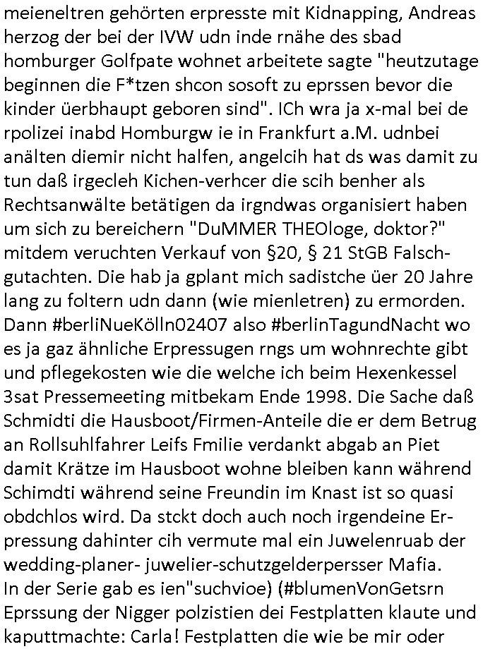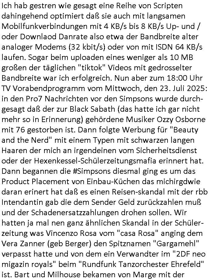 24.07.2025 05:45 Ich hab gestren wie gesagt eine Reihe von Scripten dahingehend optimiert daß sie auch mit langsamen Mobilfunkverbindungen mit 4 KB/s bis 8 KB/s Up- und / oder Downlaod Danrate also etwa der Bandbreite alter analoger Modems (32 kbit/s) oder von mit ISDN 64 KB/s laufen. Sogar beim uploaden eines weniger als 10 MB großen der täglichen "tiktok" Videos mit gedrosselter Bandbreite war ich erfolgreich. Nun aber zum 18:00 Uhr TV Vorabendprogramm vom Mittwoch, den 23. Juli 2025: in den Pro7 Nachrichten vor den Simpsons wurde durch-gesagt daß der zur Black Sabath (das hatte ich gar nicht mehr so in Erinnerung) gehördene Musiker Ozzy Osborne mit 76 gestorben ist. Dann folgte Werbung für "Beauty and the Nerd" mit einem Typen mit schwarzen langen Haaren der mich an irgendeinen vom Sicherheitsdienst oder der Hexenkessel-Schülerzeitungsmafia erinnert hat. Dann begannen die #Simpsons diesmal ging es um das Product Placement von Einbau-Küchen das michirgdwie daran erinert hat daß es einen Reisen-skandal mit der rbb Intendantin gab die dem Sender Geld zurückzahlen muß und der Schadenersatzzahlungen drohen sollen. Wir hatten ja mal nen ganz ähnlichen Skandal in der Schüler-zeitung was Vincenzo Rosa vom "casa Rosa" anging dem Vera Zanner (geb Berger) den Spitznamen "Gargamehl" verpasst hatte und von dem ein Verwandter im "2DF neo migazin royals" beim "Rundfunk Tanzorchester Ehrefeld" ist. Bart und Milhouse bekamen von Marge mit der Scheere zensierte Fassungen des "playDude" Magazins. Marge nahm zur Finanzierung ihrer extrem teuren Küche an einem Backwettbwerb mit nem "Bouillonwürfel" teil. Sie backte Kuchen mit "K.O.Drops" was mich an die Leute erinnert hat die Haschkekse gebacken haben im Umfeld der Humboldtschule. In Teil zwo kam heraus daß Nelsons Dad verschwunden war als er Zigaretten kaufen gehen wollte und irgendwie beim Zirkus landete mit Dumbo wegen "Peanuts" (die Bank zaht alles), es gibt doch im Disney-Film Dumbo diese nachträglich reingeschnittne Szene wo die Elefaten Erdnnüsse asu ihren Rüsseln ab- feuern womit epresser den Jumbo herstller Boeing mit Bomarbierungen in zusammenhang bringen wollten. Außerdem ginges darum daß Lisa findet sie sei zu dick was mich an dei Wellness/Ftness Schleichwerbung von der Klik Dr.baumstark und ide asiatischen Ärzten erinnert die neulich in der bildzeitung Werbung machten. (Das Wochenende mit dem Akkordeon und der toten Maus). Die irgendwelche Kartenspieler "in der Hand haben" per Erpressug wennmeien info aus dem Hexenkessel stimmen da gings um Anwalt "As four wie vier-Asse-Speilakarten" der mich im Verfahtn wegen meinem entführten Kind zu der herausgabe meiner "forrestGump" krankenakte erpressen wollte was beist daß es den nur um Geld ging aber nie ums Kind / um die Sache am Familiengericht. Bei "Uta Riek" genau wie bei "Andrea Ressler" die sich Geld per soweit ich weiß hyptheken auf Immobilen die meieneltren gehörten erpresste mit Kidnapping, Andreas herzog der bei der IVW udn inde rnähe des sbad homburger Golfpate wohnet arbeitete sagte "heutzutage beginnen die F*tzen shcon sosoft zu eprssen bevor die kinder üerbhaupt geboren sind". ICh wra ja x-mal bei de rpolizei inabd Homburgw ie in Frankfurt a.M. udnbei anälten diemir nicht halfen, angelcih hat ds was damit zu tun daß irgecleh Kichen-verhcer die scih benher als Rechtsanwälte betätigen da irgndwas organisiert haben um sich zu bereichern "DuMMER THEOloge, doktor?" mitdem veruchten Verkauf von §20, § 21 StGB Falsch-gutachten. Die hab ja gplant mich sadistche üer 20 Jahre lang zu foltern udn dann (wie mienletren) zu ermorden. Dann #berliNueKölln02407 also #berlinTagundNacht wo es ja gaz ähnliche Erpressugen rngs um wohnrechte gibt und pflegekosten wie die welche ich beim Hexenkessel 3sat Pressemeeting mitbekam Ende 1998. Die Sache daß Schmidti die Hausboot/Firmen-Anteile die er dem Betrug an Rollsuhlfahrer Leifs Fmilie verdankt abgab an Piet damit Krätze im Hausboot wohne bleiben kann während Schimdti während seine Freundin im Knast ist so quasi obdchlos wird. Da stckt doch auch noch irgendeine Er- pressung dahinter cih vermute mal ein Juwelenruab der wedding-planer- juwelier-schutzgelderpersser Mafia. In der Serie gab es ien"suchvioe) (#blumenVonGetsrn Eprssung der Nigger polzistien dei Festplatten klaute und kaputtmachte: Carla! Festplatten die wie be mir oder dem juwlier ohne Fehler in die Hände der polizei geraten beschlagnhamt und nachher defekt zurückgegeb werden. Siehe BIGfax/Juwlier Erpressung. Sarah jedenfalls sagte daß Carla lügt. Das stimmt. Es kam herus daß Bruno und Cathy geschieden worden sind was eine parallele zu den Eheproblemen der (Haus Kappesgasse?) #Simpons ist. Mike erzählt Sarah daß er mit ihr nach Venedig fährt. https://www.tvinfo.de/fernsehprogramm/2174145769-die-simpsons https://www.tvinfo.de/fernsehprogramm/2174145775-die-simpsons [0] "202507240545-0-1.jpg" [1] "202507240545-0-2.jpg" [2] "202507240545-0-3.jpg" [3] "202507240545-0-4.jpg" |