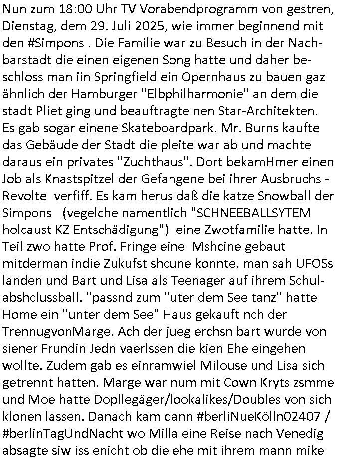 Nun zum 18:00 Uhr TV Vorabendprogramm von gestren, Dienstag, dem 29. Juli 2025, wie immer beginnend mit den #Simpons . Die Familie war zu Besuch in der Nach-barstadt die einen eigenen Song hatte und daher be-schloss man iin Springfield ein Opernhaus zu bauen gaz ähnlich der Hamburger "Elbphilharmonie" an dem die stadt Pliet ging und beauftragte nen Star-Architekten. Es gab sogar einene Skateboardpark. Mr. Burns kaufte das Gebäude der Stadt die pleite war ab und machte daraus ein privates "Zuchthaus". Dort bekamHmer einen Job als Knastspitzel der Gefangene bei ihrer Ausbruchs - Revolte verfiff. Es kam herus daß die katze Snowball der Simpons (vegelche namentlich "SCHNEEBALLSYTEM holcaust KZ Entschädigung") eine Zwotfamilie hatte. In Teil zwo hatte Prof. Fringe eine Mshcine gebaut mitderman indie Zukufst shcune konnte. man sah UFOSs landen und Bart und Lisa als Teenager auf ihrem Schul-abshclussball. "passnd zum "uter dem See tanz" hatte Home ein "unter dem See" Haus gekauft nch der TrennugvonMarge. Ach der jueg erchsn bart wurde von siener Frundin Jedn vaerlssen die kien Ehe eingehen wollte. Zudem gab es einramwiel Milouse und Lisa sich getrennt hatten. Marge war num mit Cown Kryts zsmme und Moe hatte Dopllegäger/lookalikes/Doubles von sich klonen lassen. Danach kam dann #berliNueKölln02407 / #berlinTagUndNacht wo Milla eine Reise nach Venedig absagte siw iss enicht ob die ehe mit ihrem mann mike