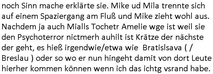 noch Sinn mache erklärte sie. Mike ud Mila trennte sich auf einem Spaziergang am Fluß und Mike zieht wohl aus. Nachdem ja auch Mialls Tochetr Amelie wge ist weil sie den Psychoterror nictmerh auhilt ist Krätze der nächste der geht, es hieß irgendwie/etwa wie Bratislsava ( / Breslau ) oder so wo er nun hingeht damit von dort Leute hierher kommen können wenn ich das ichtg vsrand habe.
