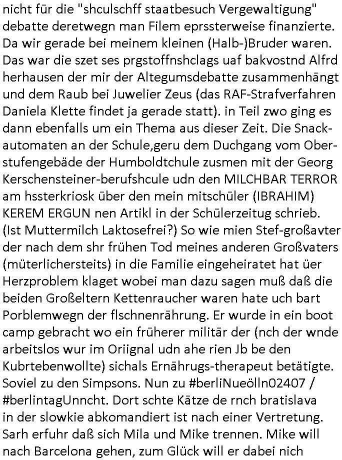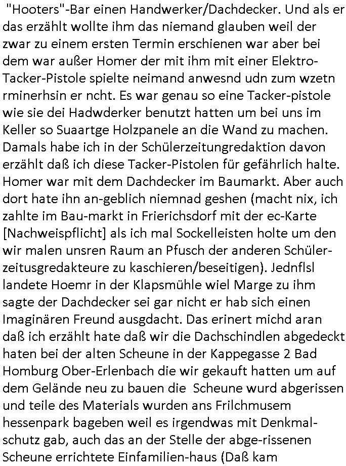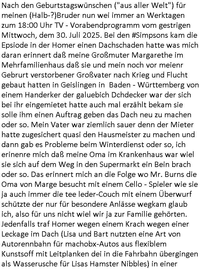 31.07.2025 09:45 Nach den Geburtstagswünschen ("aus aller Welt") für meinen (Halb-?)Bruder nun wei immer an Werktagen zum 18:00 Uhr TV - Vorabendprogramm vom gestrigen Mittwoch, dem 30. Juli 2025. Bei den #Simpsons kam die Epsiode in der Homer einen Dachschaden hatte was mich daran erinnert daß meine Großmuter Margarethe im Mehrfamilienhaus daß sie und mein noch vor meienr Gebrurt verstorbener Großvater nach Krieg und Flucht gebaut hatten in Geislingen in Baden - Württemberg von einem Handerker der galuebich Dchdecker war der sich bei ihr eingemietet hatte auch mal erzählt bekam sie solle ihm einen Auftrag geben das Dach neu zu machen oder so. Mein Vater war ziemlich sauer denn der Mieter hatte zugesichert quasi den Hausmeister zu machen und dann gab es Probleme beim Winterdienst oder so, ich erinenre mich daß meine Oma im Krankenhaus war wiel sie sich auf dem Weg in den Supermarkt ein Bein brach oder so. Das erinnert mich an die Folge wo Mr. Burns die Oma von Marge besucht mit einem Cello - Spieler wie sie ja auch immer die tee leder-Couch mit einem Überwurf schützte der nur für besondere Anlässe wegkam glaub ich, also für uns nicht wiel wir ja zur Familie gehörten. Jedenfalls traf Homer wegen einem Krach wegen einer Leckage im Dach (Lisa und Bart nutzten eine Art von Autorennbahn für machobx-Autos aus flexiblem Kunstsoff mit Leitplanken dei in die Fahrbahn übergingen als Wasserusche für Lisas Hamster Nibbles) in einer "Hooters"-Bar einen Handwerker/Dachdecker. Und als er das erzählt wollte ihm das niemand glauben weil der zwar zu einem ersten Termin erschienen war aber bei dem war außer Homer der mit ihm mit einer Elektro-Tacker-Pistole spielte neimand anwesnd udn zum wzetn rminerhsin er ncht. Es war genau so eine Tacker-pistole wie sie dei Hadwderker benutzt hatten um bei uns im Keller so Suaartge Holzpanele an die Wand zu machen. Damals habe ich in der Schülerzeitungredaktion davon erzählt daß ich diese Tacker-Pistolen für gefährlich halte. Homer war mit dem Dachdecker im Baumarkt. Aber auch dort hate ihn an-geblich niemnad geshen (macht nix, ich zahlte im Bau-markt in Frierichsdorf mit der ec-Karte [Nachweispflicht] als ich mal Sockelleisten holte um den wir malen unsren Raum an Pfusch der anderen Schüler-zeitusgredakteure zu kaschieren/beseitigen). Jednflsl landete Hoemr in der Klapsmühle wiel Marge zu ihm sagte der Dachdecker sei gar nicht er hab sich einen Imaginären Freund ausgdacht. Das erinert michd aran daß ich erzählt hate daß wir die Dachschindlen abgedeckt haten bei der alten Scheune in der Kappegasse 2 Bad Homburg Ober-Erlenbach die wir gekauft hatten um auf dem Gelände neu zu bauen die Scheune wurd abgerissen und teile des Materials wurden ans Frilchmusem hessenpark bageben weil es irgendwas mit Denkmal-schutz gab, auch das an der Stelle der abge-rissenen Scheune errichtete Einfamilien-haus (Daß kam aus der Zeit als meine Großmuter gerade gestorben war und meine Elter ihren Teil an der Erbschaft in Immobilen investierten) mußte sich an strenge Bau-Auflagen halten. Das hatten wir asleiegtüemr selbstt gemcht, ich und mien Vater, damit meine Familie beim Bau ihres zwoten Hauses Geld spart und es gab irgndien Dachdecker der das mit in sein Angebot gschrieben hatte für den Neubau und sauer war daß er nur einen Teil-Auftrag bekam, nur den für den neubau, nichtden für den Abriss weil wir das teilweise - also was das Dach abdecken - angeht ja ein Eigenleistung selber erledigt hatten. Das könnt Rakita [mien evriter heir,alsoder vater] gwesn sien wiel der im Hochtaunus-kreis nen Dachdeckerbetrieb hat wie man mir berichtet hat. Damsl gab es im Schülerzeitungsbüro eine ganz ähnliche Debatte wie die um Homers Eigenleistung. Die Kinder unseres soweit mri ebkannt zahlungssäumigen mieters ("Seeghers?") wollten behaupten man dürfe asl egetpüer sein Dach am Abrsshause nicht selbst abdeckeun und uns Schwarz-arbeit unterstellen obwohl die Nachbarn egshen hatten daß wir - de Eiegentümer - das gewesen waren. Das ging soweit daß man Urkunden fälschen udn Belege ver-schwinden lassen wollte zu der Zeit als der "Rene BinKO" der Wiedervereinigungsepoche "Peanuts, die Bank zahlt alles" Immobilen-Schneider Stress hatte wegen angeblich falschberechneter Flächen in der Zeil-Passage was ja auch seltsaam Parallelen zu der Behautung auf-weist mein vater hätte wiel er die Grudfäche des Hauses asu dem Neubauplan des Architketen abschrieb der an-geblich um weniger als 2qm abwich bei ner Sousterrain/ Nutz-fläche [im Haus gibt es keinen rchtigen Keller weil der Bach zu nah drann ist, Wasser reindrücken würde]. Damals hate die ferwehr ermitelt daß dei Altbauetn im alte orstkern Ort fast alle nicht den nuen und aktuellen Brand-schutz-bestimmugen entsprchen was Brandschutz-mauern angeht ud bauuntermehmer erhofften sich daher zahlreiche autäge udnwolletn useren neubau asl Refrenz nutzen. Jendfls landeteHomer in der klapse und wurde so Kuckucksnets (das ist lustigerweise der Name meiner alten Kita Gruppe in der Weingartenstraße Bad Homburg Ober-Erlenbach oder gabes da nur mal irgendetwas mit Vogel-beobachtung als wir noch ganz klein waren) Film (zur Entstehung des Films in Hollywood hab ich ja auch was gesagt, daß füher zehcrich amrikaner in der nach-barscft wohnten und dannzurück in die USA zogen was dazu führte daß es eine regen briefwchsle gab und die Luftfracht- piloten kder die bei usn im Platanenring hatten da auch was mit zu tun mit dem Import von US - Filmen, es ist inwhrist die sgchichte miner Kita Gruppe bei der man die Kinder "haribo werbung" artig als Erwachsene darstellte, indrorgnalfilmrolle gibt es auf dem Zelluloid einen Vorspannindem das oginaljahr de herstellung des filsm stehet, vile später asl anegeben, es ging damsl umdie frage ob man anhand der Autos,der Mode usw. ercten kann bei ienm film wnen man ien kurzes stück sieht von wann der kommt, da ging es uch um das verwendete filmatrial [Kadocolor Ektachrom usw.] mir war afagefal