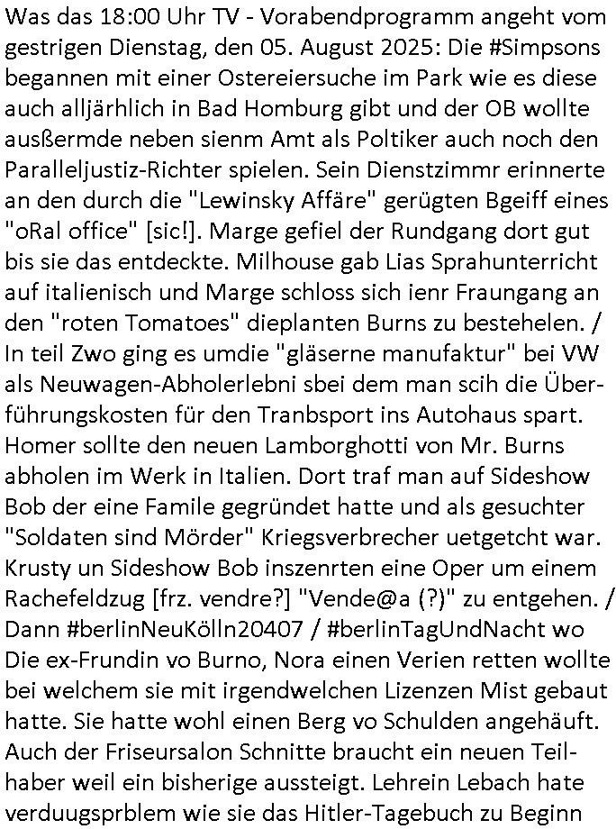 06.08.2025 06:00 Was das 18:00 Uhr TV - Vorabendprogramm angeht vom gestrigen Dienstag, den 05. August 2025: Die #Simpsons begannen mit einer Ostereiersuche im Park wie es diese auch alljärhlich in Bad Homburg gibt und der OB wollte ausßermde neben sienm Amt als Poltiker auch noch den Paralleljustiz-Richter spielen. Sein Dienstzimmr erinnerte an den durch die "Lewinsky Affäre" gerügten Bgeiff eines "oRal office" [sic!]. Marge gefiel der Rundgang dort gut bis sie das entdeckte. Milhouse gab Lias Sprahunterricht auf italienisch und Marge schloss sich ienr Fraungang an den "roten Tomatoes" dieplanten Burns zu bestehelen. / In teil Zwo ging es umdie "gläserne manufaktur" bei VW als Neuwagen-Abholerlebni sbei dem man scih die Über-führungskosten für den Tranbsport ins Autohaus spart. Homer sollte den neuen Lamborghotti von Mr. Burns abholen im Werk in Italien. Dort traf man auf Sideshow Bob der eine Famile gegründet hatte und als gesuchter "Soldaten sind Mörder" Kriegsverbrecher uetgetcht war. Krusty un Sideshow Bob inszenrten eine Oper um einem Rachefeldzug [frz. vendre?] "Vende@a (?)" zu entgehen. / Dann #berlinNeuKölln20407 / #berlinTagUndNacht wo Die ex-Frundin vo Burno, Nora einen Verien retten wollte bei welchem sie mit irgendwelchen Lizenzen Mist gebaut hatte. Sie hatte wohl einen Berg vo Schulden angehäuft. Auch der Friseursalon Schnitte braucht ein neuen Teil-haber weil ein bisherige aussteigt. Lehrein Lebach hate verduugsprblem wie sie das Hitler-Tagebuch zu Beginn von Schtonk beschreibt. Emmi will Bruno helfen einen neuen laden aufzumachen, die Pleite-Gastronomie des Fußballvereins üerbnehmen. Chianra ist sauer wiel man ihr die "shncite" anteile nicht zum Kauf anbot. Villeicht will sie ja mit Köperverltung und Vergewaltigung von Kindern in Erblinien hinein ihren nicht bestehenden An-sprüchen acu gefsgt zu werden Nachdruck verleihen. https://tvinfo.de/fernsehprogramm/2183075230-die-simpsons https://tvinfo.de/fernsehprogramm/2183075236-die-simpsons [0] "202508060600-0-1.jpg" [1] "202508060600-0-2.jpg" [2] "202508060600-0-3.jpg" |