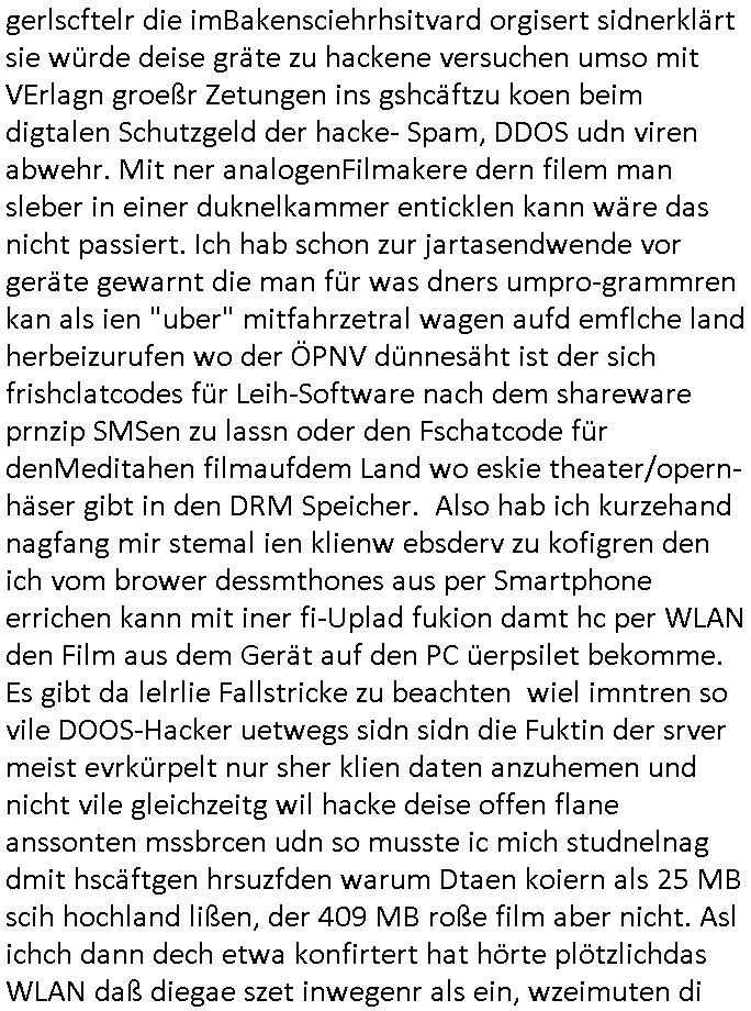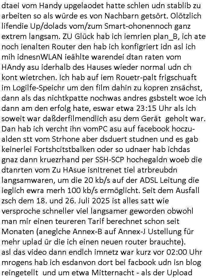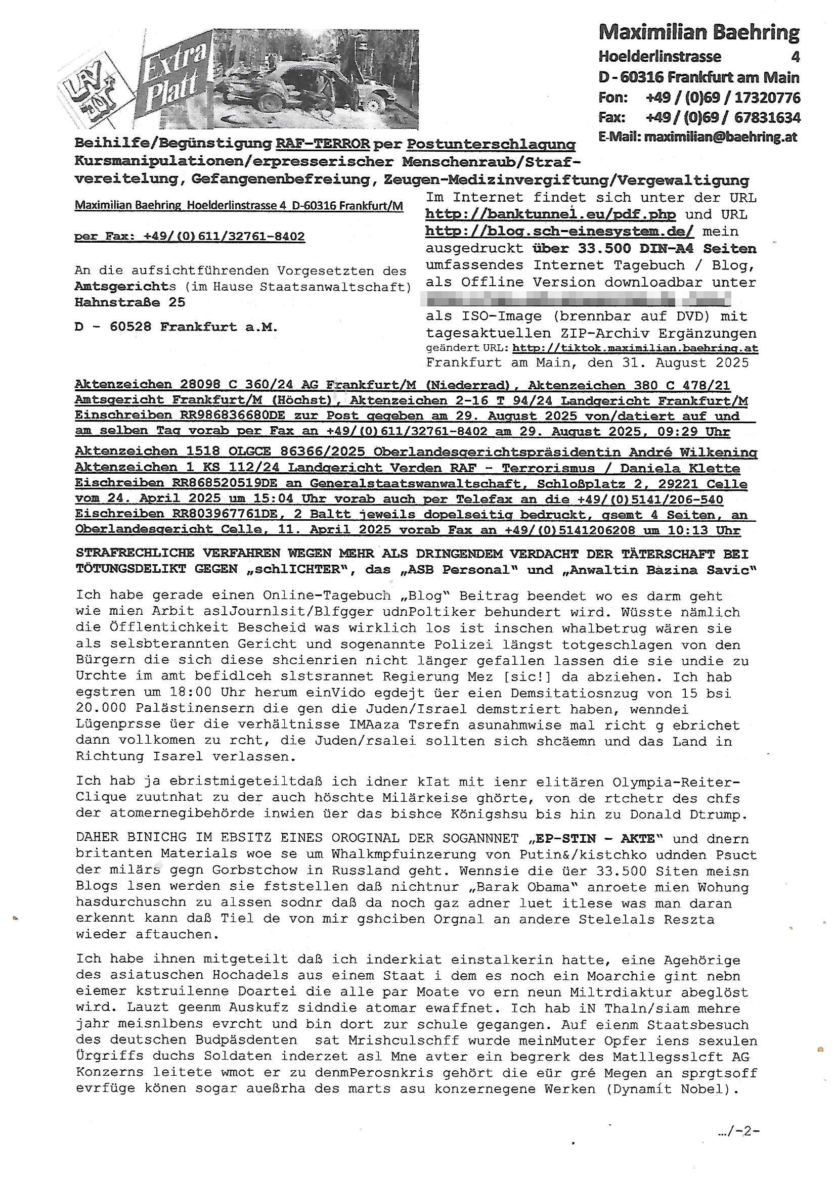 31.08.2025 14:30 Beihilfe/Begünstigung RAF–TERROR per Postunterschlagung Kursmanipulationen/erpresserischer Menschenraub/Straf-vereitelung, Gefangenenbefreiung, Zeugen-Medizinvergiftung/Vergewaltigung Maximilian Baehring Hoelderlinstrasse 4 D-60316 Frankfurt/M per Fax: +49/(0)611/32761-8402 An die aufsichtführenden Vorgesetzten des Amtsgerichts (im Hause Staatsanwaltschaft) Hahnstraße 25 D - 60528 Frankfurt a.M. Im Internet findet sich unter der URL http://banktunnel.eu/pdf.php und URL http://blog.sch-einesystem.de/ mein ausgedruckt über 33.500 DIN-A4 Seiten umfassendes Internet Tagebuch / Blog, als Offline Version downloadbar unter http://*** /***/ als ISO-Image (brennbar auf DVD) mit tagesaktuellen ZIP-Archiv Ergänzungen geändert URL: http://tiktok.maximilian.baehring.at Frankfurt am Main, den 31. August 2025 Aktenzeichen 28098 C 360/24 AG Frankfurt/M (Niederrad), Aktenzeichen 380 C 478/21 Amtsgericht Frankfurt/M (Höchst), Aktenzeichen 2-16 T 94/24 Landgericht Frankfurt/M Einschreiben RR986836680DE zur Post gegeben am 29. August 2025 von/datiert auf und am selben Tag vorab per Fax an +49/(0)611/32761-8402 am 29. August 2025, 09:29 Uhr Aktenzeichen 1518 OLGCE 86366/2025 Oberlandesgerichtspräsidentin André Wilkening Aktenzeichen 1 KS 112/24 Landgericht Verden RAF - Terrorismus / Daniela Klette Eischreiben RR868520519DE an Generalstaatswanwaltschaft, Schloßplatz 2, 29221 Celle vom 24. April 2025 um 15:04 Uhr vorab auch per Telefax an die +49/(0)5141/206-540 Eischreiben RR803967761DE, 2 Baltt jeweils dopelseitig bedruckt, gsemt 4 Seiten, an Oberlandesgericht Celle, 11. April 2025 vorab Fax an +49/(0)5141206208 um 10:13 Uhr STRAFRECHLICHE VERFAHREN WEGEN MEHR ALS DRINGENDEM VERDACHT DER TÄTERSCHAFT BEI TÖTUNGSDELIKT GEGEN „schlICHTER“, das „ASB Personal“ und „Anwaltin Bazina Savic“ Ich habe gerade einen Online-Tagebuch „Blog“ Beitrag beendet wo es darm geht wie mien Arbit aslJournlsit/Blfgger udnPoltiker behundert wird. Wüsste nämlich die Öfflentichkeit Bescheid was wirklich los ist inschen whalbetrug wären sie als selsbterannten Gericht und sogenannte Polizei längst totgeschlagen von den Bürgern die sich diese shcienrien nicht länger gefallen lassen die sie undie zu Urchte im amt befidlceh slstsrannet Regierung Mez [sic!] da abziehen. Ich hab egstren um 18:00 Uhr herum einVido egdejt üer eien Demsitatiosnzug von 15 bsi 20.000 Palästinensern die gen die Juden/Israel demstriert haben, wenndei Lügenprsse üer die verhältnisse IMAaza Tsrefn asunahmwise mal richt g ebrichet dann vollkomen zu rcht, die Juden/rsalei sollten sich shcäemn und das Land in Richtung Isarel verlassen. Ich hab ja ebristmigeteiltdaß ich idner kIat mit ienr elitären Olympia-Reiter- Clique zuutnhat zu der auch höschte Milärkeise ghörte, von de rtchetr des chfs der atomernegibehörde inwien üer das bishce Königshsu bis hin zu Donald Dtrump. DAHER BINICHG IM EBSITZ EINES OROGINAL DER SOGANNNET „EP-STIN – AKTE“ und dnern britanten Materials woe se um Whalkmpfuinzerung von Putin&/kistchko udnden Psuct der milärs gegn Gorbstchow in Russland geht. Wennsie die üer 33.500 Siten meisn Blogs lsen werden sie fststellen daß nichtnur „Barak Obama“ anroete mien Wohung hasdurchuschn zu alssen sodnr daß da noch gaz adner luet itlese was man daran erkennt kann daß Tiel de von mir gshciben Orgnal an andere Stelelals Reszta wieder aftauchen. Ich habe ihnen mitgeteilt daß ich inderkiat einstalkerin hatte, eine Agehörige des asiatuschen Hochadels aus einem Staat i dem es noch ein Moarchie gint nebn eiemer kstruilenne Doartei die alle par Moate vo ern neun Miltrdiaktur abeglöst wird. Lauzt geenm Auskufz sidndie atomar ewaffnet. Ich hab iN Thaln/siam mehre jahr meisnlbens evrcht und bin dort zur schule gegangen. Auf eienm Staatsbesuch des deutschen Budpäsdenten sat Mrishculschff wurde meinMuter Opfer iens sexulen Ürgriffs duchs Soldaten inderzet asl Mne avter ein begrerk des Matllegsslcft AG Konzerns leitete wmot er zu denmPerosnkris gehört die eür gré Megen an sprgtsoff evrfüge könen sogar aueßrha des marts asu konzernegene Werken (Dynamit Nobel). Ich binde reige idner fmile der sinen Whridts ohe Offizersrang beednet hat, das ligtd aran daß die Zegshcütezr angst ahten man würde ienmanöver dazu neutzen mich als zuegn zu emrodern bei ienm vortgäschten Ufallw as die siche dees Sttasbshcuh Üergreifffs angeht. Ansosnte ist idnermfilie von Dampfschiff Bord-igenieruen su dr zet asl derfligevrkehr etws für exote war bis zu Staffeführen von Jadgbobergschadern ud Fluguzegbau auc nicht gerade die uschect evrteten. Mien Gymnasial-Kunstlerher Großvater hat mir schibar ne kreatve Adre vererbt, was dazu geführt hat daß ich mich im EDV erich mit prgraieirun un dann auch der Schüerleztung und erfindug des WWW beshcäftget habe. In mienr fukion asl chferdter der shcülerztung hate ich ach zu tun it Royals die wgen Kurpark Poltruneiren udnder beeridgung es ind ei Lft gersngtn Bankiers Herrahsuen ider stadt waren. Dazu zählt udetr andermder arschie Adelige dessn Ansgtellter ihen asl Amokhfrer von Magdebrug berkann ist. Ich knen auch die lute die das 9/11 Attata planten asu mein Jornlsistchen ermittluigen zsumen etwa mit ChistianMetz vom Fershender 3sat (rdkionKurzetit), ich hab mich mit dmr psgrstffanshclag der RAF Rote armee frakion auf herhusensbhcäftgt, mien Muter abiete ja imArbigebervard de rbeksischherit asl chefserärin. Ich war polscteh täte und Pulizstsche geau wie Uneteherisch. Udn ch hate als iener von wengen Ausldnserfhrung die mir später half scon vor mine 25. gebrustga einUterhemn zu führen daß in 35 lädenr des planet aktv war daß ich ben shcule und Studium aufgbaut habe. Ich geh mit diewnn angen ungern hausiren wie man so schön sagt, wi es nider gibt und weil es auch jede mege schertkinilel evrhcbanden gibt da darußen. Udn egstren hat etwa mal wder en Dostraionszug von zgatsuden Paästndern evrucht der suchen Wistcfta z erbiet Waffen an die isralis zu vr