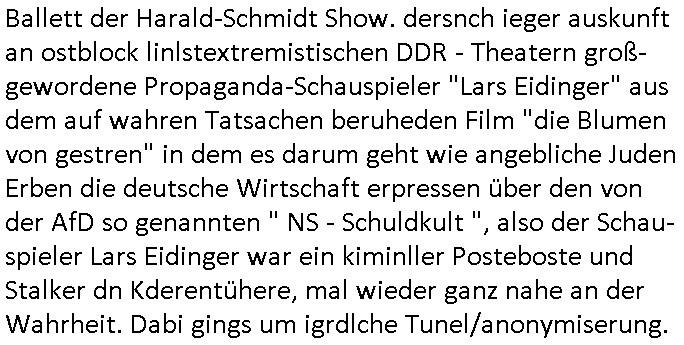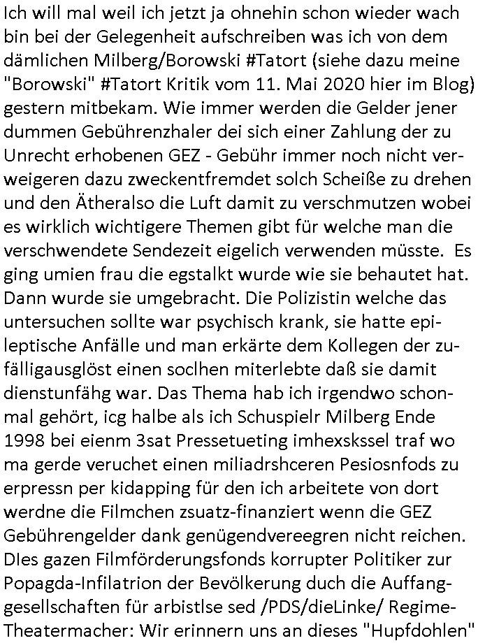 01.09.2025 01:31 Ich will mal weil ich jetzt ja ohnehin schon wieder wach bin bei der Gelegenheit aufschreiben was ich von dem dämlichen Milberg/Borowski #Tatort (siehe dazu meine "Borowski" #Tatort Kritik vom 11. Mai 2020 hier im Blog) gestern mitbekam. Wie immer werden die Gelder jener dummen Gebührenzhaler dei sich einer Zahlung der zu Unrecht erhobenen GEZ - Gebühr immer noch nicht ver-weigeren dazu zweckentfremdet solch Scheiße zu drehen und den Ätheralso die Luft damit zu verschmutzen wobei es wirklich wichtigere Themen gibt für welche man die verschwendete Sendezeit eigelich verwenden müsste. Es ging umien frau die egstalkt wurde wie sie behautet hat. Dann wurde sie umgebracht. Die Polizistin welche das untersuchen sollte war psychisch krank, sie hatte epi-leptische Anfälle und man erkärte dem Kollegen der zu-fälligausglöst einen soclhen miterlebte daß sie damit dienstunfähg war. Das Thema hab ich irgendwo schon- mal gehört, icg halbe als ich Schuspielr Milberg Ende 1998 bei eienm 3sat Pressetueting imhexskssel traf wo ma gerde veruchet einen miliadrshceren Pesiosnfods zu erpressn per kidapping für den ich arbeitete von dort werdne die Filmchen zsuatz-finanziert wenn die GEZ Gebührengelder dank genügendvereegren nicht reichen. DIes gazen Filmförderungsfonds korrupter Politiker zur Popagda-Infilatrion der Bevölkerung duch die Auffang-gesellschaften für arbistlse sed /PDS/dieLinke/ Regime- Theatermacher: Wir erinnern uns an dieses "Hupfdohlen" Ballett der Harald-Schmidt Show. dersnch ieger auskunft an ostblock linlstextremistischen DDR - Theatern groß-gewordene Propaganda-Schauspieler "Lars Eidinger" aus dem auf wahren Tatsachen beruheden Film "die Blumen von gestren" in dem es darum geht wie angebliche Juden Erben die deutsche Wirtschaft erpressen über den von der AfD so genannten " NS - Schuldkult ", also der Schau-spieler Lars Eidinger war ein kiminller Posteboste und Stalker dn Kderentühere, mal wieder ganz nahe an der Wahrheit. Dabi gings um igrdlche Tunel/anonymiserung. https://tvinfo.de/fernsehprogramm/2185786361-tatort [0] "202509010131-0-1.jpg" [1] "202509010131-0-2.jpg" |