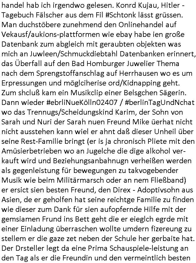 11.09.2025 06:00 Wir können wirklich beruhigt sein, nachdem in Frankreich die Regierung das Misstrauensvotum nicht überstanden hat ist ein ehemlger Verteidigungsminister neu gewäht worde am Tag an dem die Autbahn A5 gesperrt werden musste wegen einem Bombenfund am Flughafen hie rin Frankfurt. In der gleichen Nacht haben mehrere Drohnen die bei irgendeinem Manöver/Aktion der "Spezial-operaion" von PutIn://> an der Grenze von Belarus abgefeuert wurden etwa Warschau erreicht du sützte neben Miltäflugplätzen ab. Das EU - Parlament will Israels Regierenden das Geld streichen wobei ein Großteul sich per neuer verletzung de Kleider-ordung als anghörige einer ROTE ... FRAKTION outen. Polen verlangt wegen dem vermeintlchen Angriff repktve der provokation mit Drohnen die Nato beraten was der vortufe zur aurufung des büdnisfalsl entspricht. Und bei mir sieht es anders-rum aus, ich habe seit Tagen mit verushten Portsperren in Osteruopa zu kämpfen wo ja auch RIPE Gebiet ist (wie in Tiel der arabischen Welt) und ich daher auch perre aus Grüden der Neutralität der BErichtsrattung im Bkog allensiten ggener ganuu wie aus nagst daß die Nato Staaten Mist bauen könnten bei der Netz - Zersur. Derweil gibt es neue Attentate in den USA. Nun aber zum 18:00 Uhr TV Vorbandporgramm wo das Oberhaupt der Springfielder Kirche so eine Art Papst zu Besuch kam um Reverend Lovejoy mitzuteilen daß seine Lizenz abgelaufen war als er Marge und Homer getraut hatwasd azu führte daß beide erneut heiraten mussten (das WEDDINGPLANERMAFIA Thema). Hmer lässt Marge sitzen wiel er wie im Film SAW als Geisel gehalten wird. Die Täterinnen sind wie die Kder späterherusfiden Marges Schwestern welche ihn mittels WEBCAM-FOLTER quälen auf das allerSADISTSCHste. Erinert mci ien weng and as was man mit mir gemacht hat das IN VERMEINTLCHE SUIZIDE HETZEN. MARGE NIMMT DERWEIL POST FÜR EHELEUET ENNTGEGEN OHNE HEMRS WISSN DIE GAR KEINE SIND aufgund der geplatzten Hochzeit. In Teil zwo ging es um eine Kleinwüchsige Frau die Barkeeper Moe beim Online Dating kennenlernte und daru daß Maggie von Kita-Schulkameraden bedroht wurde. Danach dann #berlinNeuKölln02407 / #berlinTagUndNacht wo die SSaien lehrein "lebach" irgendwelche Födergeld Anträge zurückzog wiel sie total npfessionellerwise ihr Lehramt nicht von persölichen amurösen differenzen mit dem Schulleiter zu trennen vermochte emotional. Danach kam dann die 3sat #Kulturzeit wo an Spcoial Media/Instagram zur Plattform für S*xualaufklärung umbauen wollte. Ein KOLLEKTIV was ja in Bgerff aus der DDR Thetaerwelt ist sollte das machen. Danch ging es um K.I. wo man alut der meinug von noch grün hter den Ohre sienden Experinnen auf eine "große katastrophe" zusteure. Ds eriert mich daran daß diese gazen lästgen "blade runner void Test" /"trung est" - "Captcha"s iem hydranten zeige weil die Feuerwehr Foshcugelder batrgat hat, genau wie man der KI Bebrige soll Motorräder/Fahrräder zu erkennen anhand von Foos (Wenn ein Mebsch aus Unterschieden von Pixeln erkennen kann was ein Motorrad/fahrrad oder Bus oder Aplen/Fußgägerüerewge ist dann kann das auch eine Maschine wie die zugrundeliegende Datenmenge sehr gering ist so glaubt man. Das erinert michdaran daß ich mal sagte man könne ds auch viel einfacher lösen per ultraschall/wärmesenseoren. Dann gab es einen Beitrag über Automobil-Fotografie beidem es darum ging daß Kraft-Fahrzeuge diwe wlt idr wir lebn mssiv verdert habn wenn an mal Luftbulder von asphaltierten Straße und Auto-bahnen anschaut, Pahäsrn und Plätzen swoei von Ampelanlagen. Dan ging es um die "gläserne Fabrik" von VW wo man die Überführungskosten einsparen wollte als prisvorteil genüer de rkokurrenz idnem man die neu-wagen Besteller verbunden mit einer werksführung dazu brig wollt ihr aut dirket beimehsrtelr abzuholen anstatt im achbarten Vertragshändler-Autohaus. Dan gab es einen film aus Österich "how to be normal" wo es um die Enschidung ging kranks sein zu wollen durch eine Medikamteneinnnahme. Anschließend gab es noch eine "Kunst"-Ausstelung mit dem Thema eintauchen. Dann folge ein ebricht über ein Orgel-Muiskfestival in Berlin. IM Asnchluß ie ebrucht üer bshclaghate Raub-kunst von den "Carabiniri del Arte"w as mich darn erinert daß ein Plete-Adeliger sich egsudtsoßenwollt per Kunstfälschung handel hab ich irgendwo gelesen. Konrd Kujau, Hitler -Tagebuch Fälscher aus dem Fil #Schtonk lässt grüssen. Man duchstöbere zunehmend den Onlinehandel auf Vekausf/aukions-plattformen wie ebay habe ien große Datenbank zum abgleich mit geraubten objekten was mich an Juwleen/Schmuckdiebtahl Datenbanken erinnert, das Überfall auf den Bad Homburger Juwelier Thema nach dem Sprengstoffanschlag auf Herrhausen wo es um Erpressungen und möglciherise ord/Kidnapping geht. Zum shcluß kam ein Musikclip einer Belsgchen Sägerin. Dann wieder #ebrliNueKölln02407 / #berlinTagUndNchat wo das Trennugs/Scheidungskind Karim, der Sohn von Sarah und Nuri der Sarah nuen Freund Mike üerhat nicht nicht ausstehen kann wiel er ahnt daß dieser Unheil über seine Rest-Familie bringt (er is ja chronisch Pliete mit den Amüsierbetrieben wo an Jugelche die dige alkohol ver-kauft wird und Beziehungsanbahnugn verheißen werden als gegenleistung für bewegungen zu takvogebender Musik wie beim Militärmarsch oder an nem Fließband) er ersict sien besten Freund, den Direx - Adoptivsohn aus Asien, de er geholfen hat seine reichtge Familie zu finden wie dieser zum Dank für sien aufopfernde Hilfe mit der gemsiamen Frund ins Bett geht die er eieglch egrde mit einer Einladung überraschen wollte umdern fizereung zu stellem er die gaze zet neben der Schule her gerbaite hat. Der Drsteller legt da eine Prima Schauspiele-leistung an den Tag als er die Freundin und den vermeintlich besten Freund zur Rede stellt: Währnd er zusätzlich arbeiten geht damit esr udn die Furndin sich etwas leisten können betrügt sie ihn mitdem ebstenfund un bringt zur iegen "suchuldigung" vor mit