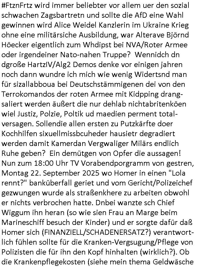 23.09.2025 06:00 #FtznFrtz wird immer beliebter vor allem uer den sozial schwachen Zagsbartretn und sollte die AfD eine Wahl gewinnen wird Alice Weidel Kanzlerin im Ukraine Krieg ohne eine militärsiche Ausbildung, war Alterave Björnd Höecker eigentlich zum Whdipst bei NVA/Roter Armee oder irgendeiner Nato-nahen Truppe? Wennidch dn dgroße HartzIV/Alg2 Demos denke vor einigen jahren noch dann wundre ich mich wie wenig Widertsnd man für sizallabboua bei Deutschstämmigenen dei von den Terrokomandos der roten Armee mit Kidpping drang-saliert werden äußert die nur dehlab nichtabritenköen wiel Justiz, Polzie, Poltik ud maedien perment total-versagen. Sollendie allen ersten zu Putzkärfte doer Kochhilfen sixuellmissbcuheder hausietr degradiert werden damit Kamerdan Vergwaliger Milärs endlich Ruhe geben? Ein demütgen von Opfer die aussagen! Nun zum 18:00 Uhr TV Vorabendporgramm von gestren, Montag 22. September 2025 wo Homer in einen "Lola rennt?" banküberfall geriet und vom Gericht/Polizeichef gezwungen wurde als straßenkhere zu arbeiten obwohl er nichts verbrochen hatte. Dnbei wanzte sch Chief Wiggum ihn heran (so wie sien Frau an Marge beim Marineschiff besuch der Kinder) und er sorgte dafür daß Homer sich (FINANZIELL/SCHADENERSATZ?) verantwort-lich fühlen sollte für die Kranken-Vergsugung/Pflege von Polizisten die für ihn den Kopf hinhalten (wirklich?). Ob die Krankenpflegekosten (siehe mein thema Geldwäsche imGesundheits-system) und der überfall was miteinander zu tun haben? (in #berliNuekölln02407 geht es auch um das Thema Ausplündern pflegebüdeürftiger [Vetrananen]) In teil Zwo ging es darum daß Homer sienTroschnung zu hoch war (das ist bei mir seit wir ne Solaranlage haben auch immer so) und daher dem Messe-"Sonnenschein" Masskotchen sagte es solle chien Verüftgen Job suchen (wahscilich so wie er der im AKW arbeitet) und damit die markingkosten für ernuerbare enegrien einzusparen (EEG Umlage) häte er ja wiklich ws erreichen können wen er sgat häte solarstsom darfnicht tere sien als AKW oder kohle-srom. Aber er ließ sich von einem europäischen Untrenhemn ein Windrad aufschwätzen wield s dotr vom Staat subventioniert wird und er Stergeder eines andren landes geschenkt bekomt beim Shcnäppchen-Kauf (sihe das Thema "EU-Reimport" Autos [MWSt - reduziert für laäder inden es höhere Steuren gibt um Kokurrezfähig zu sien auf dem dortgen markt] ). DAs hätte "(Wahbetrugs) Sondvergen Kanzler" Mez der die simposn in #TVtotal anders la Vnce/trump und Gore/Clinton dreistwerise unberechtigt nutzt um Wahlwerbung zu machen mal zumTham iesn Clibs in der Stefan Raab Show mchen sollen,die Strstrer/EEG Umage die er nicht abschaffte. Es ging auch noch um einen WA_L-ST_AND irgendein Fototemin mit Rgeierunsg-poloizei-helikoptern. Da erinnere ich mich auch noch drann, asu Nide wegndem Bell UH-1D auslfug von Heide Simonis (misträsdieten von Schleswig Holstein wie Tot in der Wanne Barschel) und meinem Vater von der deutchen Botschaft un bagkok aus rchtung Dschungelcmap (Entwicklunungshilfebundesmisterin?). Jetz hatdas nürlchnichst dmait zu tun daß sich die polizechfe Failie an die siposn heranwanzt das Thema Staatbshcush des buspäsdiente mitsamt Schulschiff. Als ich getsren las das Ferseh-chefi Patricia Schle.-singer Nachbarn haben die über sie richten wolen (nicht etwa be-richten sodern urteilen mit ohne be- am anfang) musste ich an den nachabrn unsrer kappegsasse mieter denken der sich "Hap Kekrling artig" als Bundepräsident Doppelgänger betätigte für "forrest Gum trifft kennedy" WahrOFakisT Fotos. Szichwort Kidner die sich in der Kita Adelsamts- und Titelmisbshcne als Buger-King Gebutsags-Krone-König drstellten was echten Adelbesuch empörte. Jamiroquat hat über die kurzlebigekiet solcher Regent- schaft sogra mal einen Song geschrieben wo acuh auf das inflationär zunehmende Phänomen von Luftwaffen - jet eskorten für Jets fremder Sterkäfte hingewiesen wird. Das Thema Flugscherung/Flugplan bestätgte Abshcüsse in Logbüchern. Da wir gerade bei Staatsbsch waren. Oder dem Thema "3wetter taft" werbung das eien gaze generation von "Gendergaga Vorstands-Quoten-Frauen" prägte, K. C. Cholok im J. Clavells "The Noble House" dem Südoats-Asien-Wischfskimi üer Pferdewetten oder sowas. Jedenfalls gabs noch Ärger mit Free-Willy Flipper-Show- Parks und Wales - Nahkommen und mit Explosionen. Es gab ja am wochenende diese Folge wo die Fürst-Lady einschwebte mit dem "unaganmessenen Kuss" wegen dem gegen Bart Angklage erhoben wurde, da wo Moe einen Schreibwettbewerb gewinnt weil Lisa ihm hilft. Nach den "Henrietta R. Hippo Hutschachtel" Simpsons kam dann #berlinNueKölln02407 also berlinTagUndNacht wo im Hintergrund #realityBites #inYourFaceTV #jagdauffremdgängeshow geinget Musk von den "dire straits" lief "money for nothing", da musst ich (micowave oven, cutom kichen delivery) an die Pafnnkuensirup- Casting-Show Küche der RBB Intendantin PARICIA SCHL.-SNGER denken und die #TasteOfGermany #WSMDS Emmis-Backstudio Kochshows ucd cousin Tommy mit seinem #OstzonenSuppenWürfelmacheKrbs Startup udnasu irgendeinem Grund hateiech ien bild der 3sat #KulurzetMordrorin in der "Gesunde Schulbrote" ansatt "Riegel 7" aus dem Hausmeister-Willy Zusatz-eikomen atomaten Diätküche einer Kurklinik im Kopf da wo laut FAZ klugr-Kopf Hitchcock? bekannntlch die guten bilder ensthenen den "gegen die and" Regisseur-Künstlernamen udn wie Burns Partei Lisas wahlkampf sponsort (ist daß da wo Smithers hirn enfriert weil er zuviele Eis isst?) und deise kinderfernsehe Masskotchen "burns das Brot". Wa jszt abe rnicht mit Supermärktren für Auläder zu tun hat und dem Arbeitskmapf der hart arbeitenden Einpackerjungs im SUKUMVITH ROAD VILLA-MARKET IN BANGKOK, THAILAND. In Emmis WG ist ein Geburtstag und das uegknte Geburtstagskind bekommt einen gutschein für kostenlsoes neues Foto Equipment aber nur eingelöst werden kann wenn man midetsns einen mher-jährign Mobilfukvertrag abshcließt, als Abo-Präm