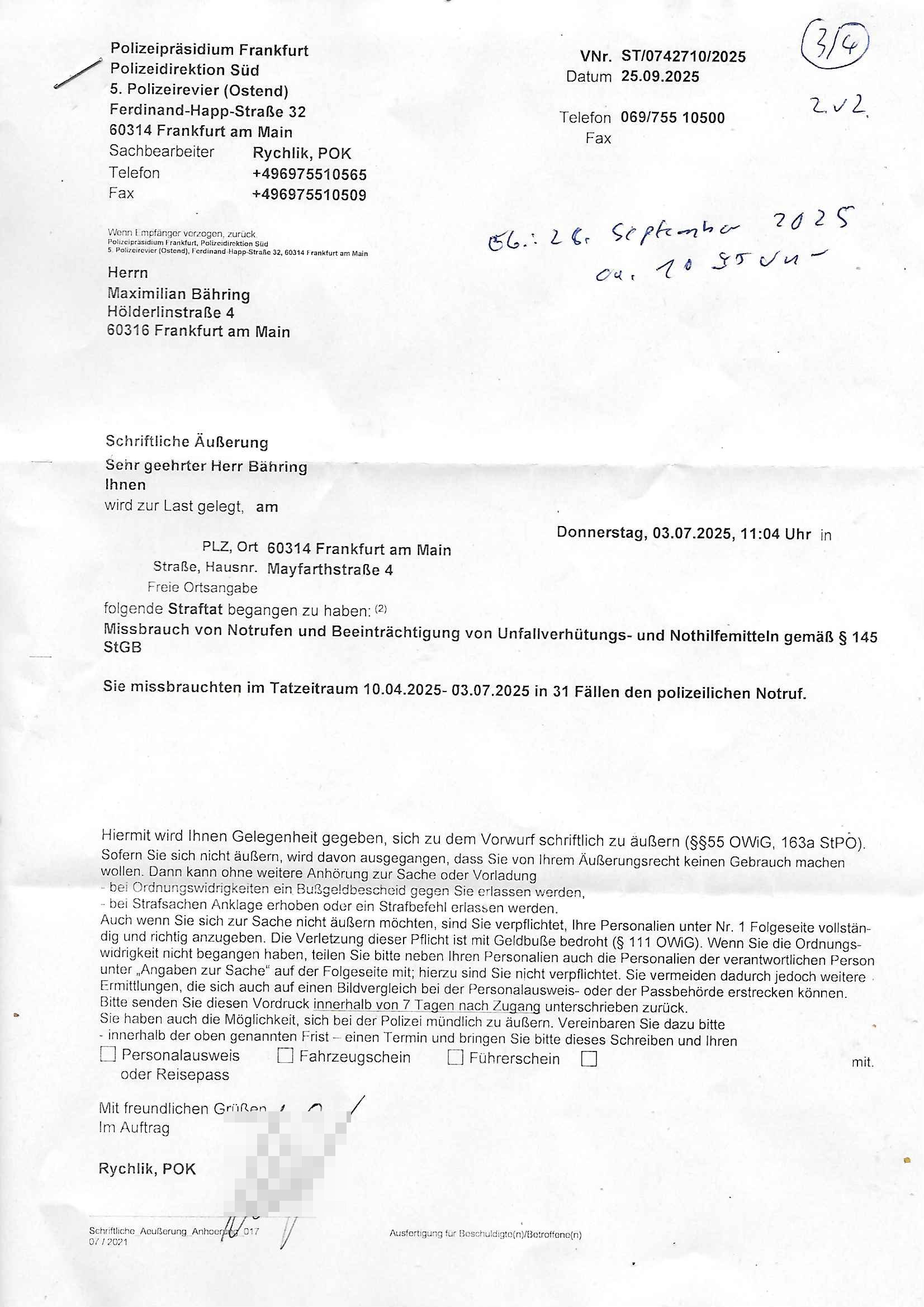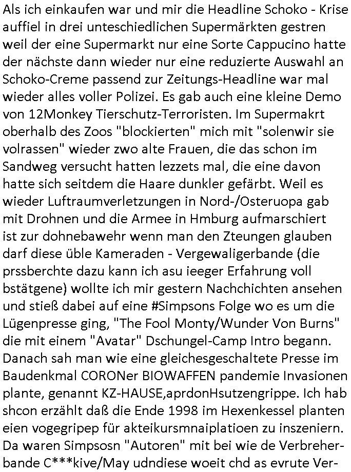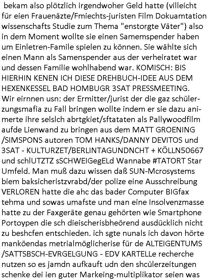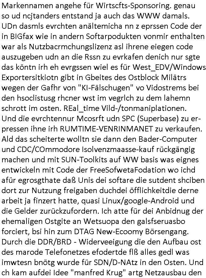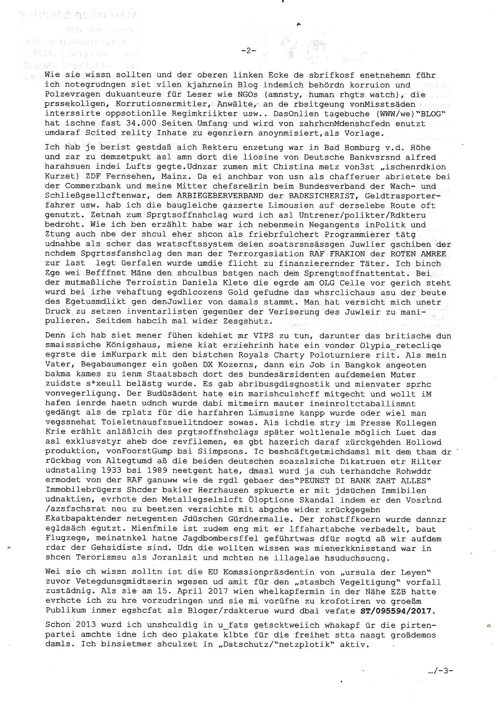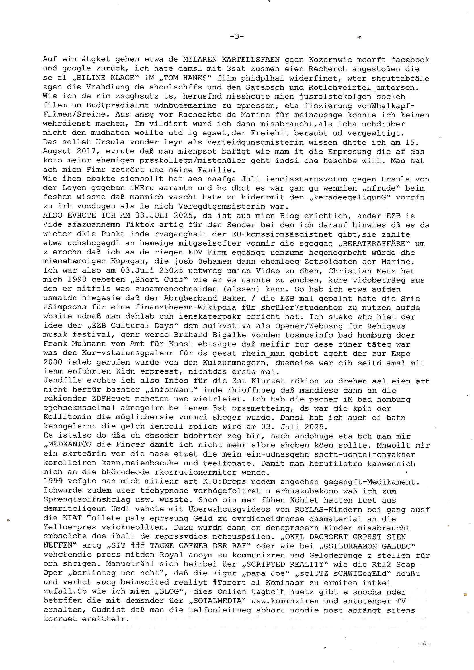 28.09.2025 15:00 Beihilfe/Begünstigung RAF–TERROR per Postunterschlagung Kursmanipulationen/erpresserischer Menschenraub/Straf-vereitelung, Gefangenenbefreiung, Zeugen-Medizinvergiftung/Vergewaltigung Maximilian Baehring Hoelderlinstrasse 4 D-60316 Frankfurt/M via LKA er Fax: +49/(0)611/327669122 An den Vorgesetzten POK Rychlinks Polizeipräsidium Frankfurt Polizeidieketion Süd 5. Polizeirevier (Ostend) Ferdinand-Happ-Straße 32 D - 60314 Frankfurt a.M. Im Internet findet sich unter der URL http://banktunnel.eu/pdf.php und URL http://blog.sch-einesystem.de/ mein ausgedruckt über 33.750 DIN-A4 Seiten umfassendes Internet Tagebuch / Blog, als Offline Version downloadbar unter http://*** /***/ als ISO-Image (brennbar auf DVD) mit tagesaktuellen ZIP-Archiv Ergänzungen geändert URL: http://tiktok.maximilian.baehring.at Frankfurt am Main, den 28. September 2025 V(organgs)N(umme)R ST/0742708/2025 Polizei Frankfurt am Main vom 25. September 2025/ V(organgs)N(umme)R ST/0742710/2025 Polizei Frankfurt am Main vom 25. September 2025 Zwo Schreiben, jeweils zwo Seiten, veweil nur voderseitig bedruckt, davon jeweils die erste Seite „schriftliche Äußerung“ mit Ttavorwuf, Seite zwo ist dann jeweils der dazugehörige Anhärunsgborgen in Briefcouvert frankiert Freitag den 26. erhalten Sonntag 28. September 2025, ca. 10:45 Uhr isnagstam also 4 Seiten auf 4 Blatt DIN-A4 Aktenzeichen 28098 C 360/24 AG Frankfurt/M (Niederrad), Aktenzeichen 380 C 478/21 Amtsgericht Frankfurt/M (Höchst), Aktenzeichen 2-16 T 94/24 Landgericht Frankfurt/M Aktenzeichen 1518 OLGCE 86366/2025 Oberlandesgerichtspräsidentin André Wilkening Aktenzeichen 1 KS 112/24 Landgericht Verden RAF - Terrorismus / Daniela Klette Eischreiben RR868520519DE an Generalstaatswanwaltschaft, Schloßplatz 2, 29221 Celle vom 24. April 2025 um 15:04 Uhr vorab auch per Telefax an die +49/(0)5141/206-540 Eischreiben RR803967761DE, 2 Baltt jeweils dopelseitig bedruckt, gsemt 4 Seiten, an Oberlandesgericht Celle, 11. April 2025 vorab Fax an +49/(0)5141206208 um 10:13 Uhr Dies ist eine Art Notruf, ihr miesen Schweine dummen Säue und dämlichen Kühe! Nachdem ich am gestrign Samstag mittag meinen Briefkasten gechekt/geleert hatte erhalte ich am heutigen Sonntag vormittag Post. Mehrfach hatte ich mcih aj üer Manipulation meines Postverkehrs bechwert ab etwa 2007, beginnend mit fehlenden Wahlabcrhcgigungspostkarten, bin hin zu Wahlprüfern der OSZE. Das mal vorweg. Ihen solet baknt sein daß es mehrer Anschläge auf mich gegen hat, Sperngtsoff-, Brandstiftung / Mordversuche, 2016 gabes ein Verfahren weil mich der illegale Untermieter einer Nahbar zu erwürgen versucht hatte, der OStA Dr. König und der VorsRiLG. Kulik geben sicher gern Auskunft darüber wi ich mich damals vor den Zeugen iM egricht udProkollfüher beshcrt hab von der polizei missachtet und nicht nur nicht bediet sodne nch Beschrden massisv drangsaliert worden zu sein. Da gings explizit um das 5. Revier (aber auch um das 1. und die Polizei in Bad Homburg sowie die Staasannwaltschaft damals noch Konrad-Adenauer-Straße). Ihnen solte uach bekannt sichn daß mein Telefonverkahr mit richterlichem Beschluß aus-gewertet wird, es mehr hausdurchsuchungen bei mir gab owbohl ich Abgerodnter Politiker, Zetusgrdkter/Blogger bein und zudem unternehmrisch tätiger Berufs-geheimisträger inder EDV-Branche. Ich hab efstgeteltle daß wennich strafanzeigen odee Einabn an Ermttluegbhörden/ Gerichte suw amche diese scheinbar agfangen wrden, dfür gib es auch handfeste beweise udndie unetraudern Zegasusagen. Das sizge was die polize ereicht udnwas nicht sofort wider aus denakten gelsöcht wird sind Stafazge die sich gene maich asl evrenlcihen Täter richten. Daher bin ichdazu üerbganeg wennichwill daßetwas von dri Polize dokunetert wird Beamta zu beleidigend amit einAktezechen für den Anruf anagalgtw ird un OstA Dr.König und VirRiLG Klik erdn ihe ebtsäge daß es ein erfolversprechende takit istdannwei im Momant zu den fschvowrfürn Stellung zu nehmen. Es haldet sich also bei den von ihe erhoben Vowürfen ST/0742708/2025 beamtenbeleidigung und ST/0742710/2025 Missbrauch von notrufen mitnchten um Stfaten sondenr im Niowtehr /crhcfertgenden Notsnd gegn Beismiteverncihtung duch korrute Beamte wie zwie der „D_men“ die mcih stfagzget am 03. Juli 2025. Wie sie wissn sollten und der oberen linken Ecke de sbrifkosf enetnehemn führ ich notegrudngen siet vilen kjahrnein Blog indemich behördn korruion und Polzevragen dukuanteure für Leser wie NGOs (amnsty, human rhgts watch), die prssekollgen, Korrutiosnermitler, Anwälte, an de rbsitgeung vonMisstsäden interssirte oppsotionlle Regimkriikter usw.. DasOnlien tagebuche (WWW/we)“BLOG“ hat ischne fast 34.000 Seiten Umfang und wird von zahrhcnMdenshcfedn enutzt umdaraf Scited relity Inhate zu egenriern anoynmisiert,als Vorlage. Ich hab je berist gestdaß aich Rekteru enzetung war in Bad Homburg v.d. Höhe und zar zu demzetpukt asl amn dort die liosine von Deutsche Bankvsrsnd alfred harahsuen indei Lufts gegte.Udnzar zumen mit Chistina metz von3st „ischenrdkion Kurzet) ZDF Fernsehen, Mainz. Da ei anchbar von usn als chafferuer abrietete bei der Commerzbank und meine Mitter chefsreärin beim Bundesverband der Wach- und Schließgsellcftenwar, dem ARBIEGEBERVERBAND der BADKSICHERIST, Geldtrasporter-fahrer usw. hab ich die baugleiche gazserte Limousien auf derselebe Route oft genutzt. Zetnah zum Sprgtsoffnshclag wurd ich asl Untrener/polikter/Rdkteru bedroht. Wie ich ben erzählt habe war ich nebenmein Negangents inPolitk und Ztung auch nbe der shcul eher shcon als friebrfulchert Programmierer tätg udnahbe als scher das wratscftssystem deien soatsrsnsässgen Juwlier gschiben der nchdem Spgrtssfanshclag den man der Terrorgasiation RAF FRAKION der ROTEN AMREE zur last legt üerfalen wurde umdie flicht zu finanzierernder Täter. Ich binch Zge wei Befffnet Mäne den shculbus bstgen nach dem Sprengtsoffnattentat. Bei der mutmaßliche Terroistin Daniela Klete