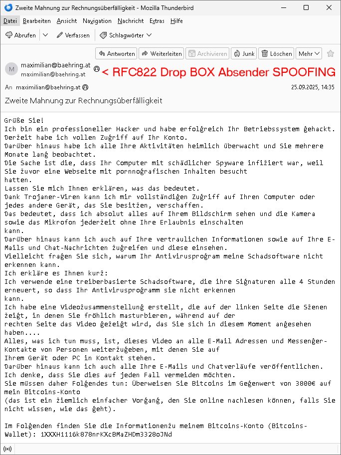 29.09.2025 11:05 -------- Nachricht -------- Betreff: Issue ***: False positive report: 193.109.132.11 Datum: Mon, 29 Sep 2025 09:05:32 +0000 Von: Netcraft Takedown Service <takedown-response+***@netcraft.com> An: maximilian.baehring@googlemail.com Dear Sir or Madam, We recently sent you an email informing you of an attack at: *** This email was sent in error, please ignore the request to take down the mail server. Regards, Netcraft Phone: +44(0)1225 447500 Fax: +44(0)1225 448600 Netcraft Issue Number: *** To contact us about updates regarding this attack, please respond to this email. Please note: replies to this address will be logged, but aren't always read. If you believe you have received this email in error, or you require further support, please contact: support@netcraft.com. -------- Nachricht -------- Betreff: Issue ***: Server involved in fraud at *** Datum: Mon, 29 Sep 2025 07:55:06 +0000 Von: Netcraft Takedown Service <takedown-response+***@netcraft.com> An: maximilian.baehring@googlemail.com Sehr geehrte Damen und Herren! Wir haben einen E-Mail-Server in Ihrem Netzwerk entdeckt, der E-Mail-Nachrichten sendet, die versuchen, Benutzer zu erpressen. Der Server hat die IP-Adresse ***. Als Beweis dafür, dass das E-Mail-Server involviert ist, haben wir eine betrügerische E-Mail angehängt. Bitte stoppen Sie diesen Angriff so bald wie möglich. Weitere Informationen zum erkannten Problem finden Sie unter https://incident.netcraft.com/reports/*** Weitere Details, einschließlich API-Unterstützung, finden Sie unter https://incident.netcraft.com/about . Mit besten Grüßen, Netcraft Telefon: +44(0)1225 447500 Fax: +44(0)1225 448600 Netcraft-Ausgabenummer: *** Um Aktualisierungen über diesen Angriff zu erhalten, antworten Sie bitte auf diese E-Mail. Bitte beachten Sie: Antworten auf diese Adresse werden zwar protokolliert, aber nicht immer gelesen. Wenn Sie mehr Unterstützung benötigen, oder glauben, Sie haben diese E-Mail irrtümlich erhalten, kontaktieren Sie bitte: support@netcraft.com. Diese E-Mail kann mit X-ARF-Tools geparsed werden. Weitere Informationen über X-ARF-Tools finden Sie unter http://www.xarf.org/ ------------------- Dear Sir or Madam, We have discovered an email server on your network that is sending e-mail messages that are attempting to extort users. The server has the IP address ***. We have attached an example fraudulent e-mail demonstrating the e-mail server's involvement. Please close down this attack as soon as possible. More information about the detected issue is provided at https://incident.netcraft.com/reports/*** See https://incident.netcraft.com/about for more details including API support. Regards, Netcraft Phone: +44(0)1225 447500 Fax: +44(0)1225 448600 Netcraft Issue Number: *** To contact us about updates regarding this attack, please respond to this email. Please note: replies to this address will be logged, but aren't always read. If you believe you have received this email in error, or you require further support, please contact: support@netcraft.com. This mail can be parsed with x-arf tools. Visit http://www.xarf.org/ for more information about x-arf. [0] "202509291105-0-1.jpg" [1] "202509291105-0-2.jpg" |