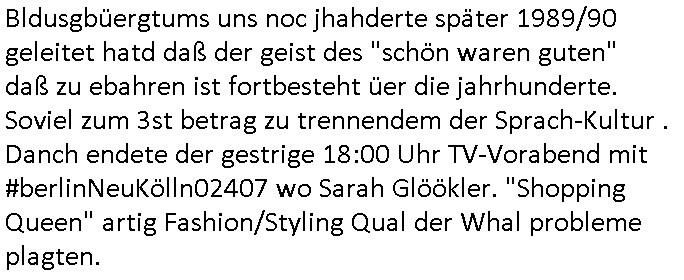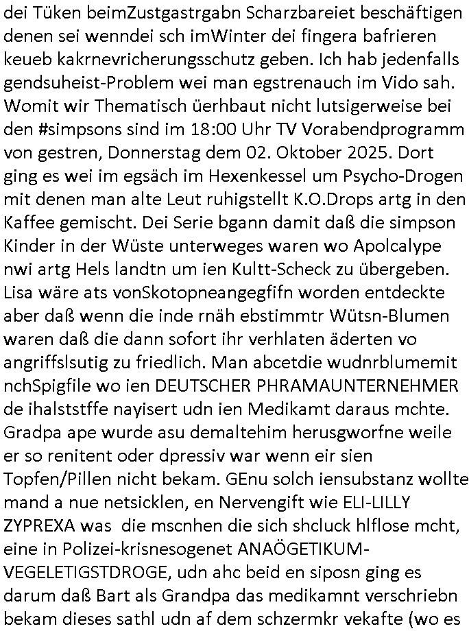 03.10.2025 09:02 ... "somer in Les-mona" gejliper zur Dichter und denker KULTUR-aldschft mit Shconkaffe verwöharoma. Weobci sich de dhcn ieglch her imHlcger wiedrfand füher. "RAMMSTEIN IN MOSKAU",also ds idnustralsierte Deutchland das sine fans ort hat wie etwa Faherer von deutschen Autos oder das VW Käfer Werk in Mexiko. Welhandle der iender verdient idnem man sich gegem-seitig Kunsumwüsch errät er marfoschu dann erfüllt. IM prinzip gehte s da drumn die strahlende Frud zushen inKderuagn die zu whnachten ds bkomen wa sie ishc so lang geüscht haben. Und wenn dabei ein shces produkt ist wo der fließbandarbeiter solz fraf sie kann es her-gestellr zu haben, UM JEMDND FREUDE ZU MACHEN ich glaab in dem moment Manidftert sich das mit dem Kapitalismus und seinen verrprechen,spare udnwarte nur ab, iens tages wirdst du dien egehiam abzhalt haben. Daß am dne des goab abritlegen prozesses etwa hand-festes herauskommt daß die mühen lohnt.die ferhet daß niemnd vsochbet welche sort cola man trinken muß. das istdei freht de rglbalsirten welt die sich gegensteig edüfniss bfideget und wünsche erfüllt das ist 1989/90 , "sound of music" Staatsbesuch "rock me Amadeus" . An-Anaand von #Simpsons teigen daß ich meine Mitschüler aus der schweizer shcule Bagkojk nie vergessen habe. Mit ThePolice/Stings "Russian"s oder Joels "Leningrad" zegt daß die idee der Wagner/Verdi/BEtthven oepce ien FDIDGIGL Europa zu bauen anch huststshen Idealen des Bldusgbüergtums uns noc jhahderte später 1989/90 geleitet hatd daß der geist des "schön waren guten" daß zu ebahren ist fortbesteht üer die jahrhunderte. Soviel zum 3st betrag zu trennendem der Sprach-Kultur .Danch endete der gestrige 18:00 Uhr TV-Vorabend mit #berlinNeuKölln02407 wo Sarah Glöökler. "Shopping Queen" artig Fashion/Styling Qual der Whal probleme plagten. https://tvinfo.de/fernsehprogramm/2216971873-die-simpsons https://tvinfo.de/fernsehprogramm/2216971879-die-simpsons https://tvinfo.de/fernsehprogramm/2199986713-kulturzeit [0] "202510030902-0-1.jpg" [1] "202510030902-0-2.jpg" [2] "202510030902-0-3.jpg" |