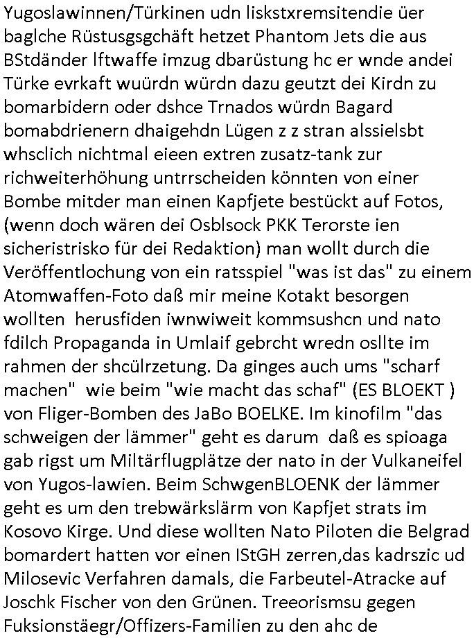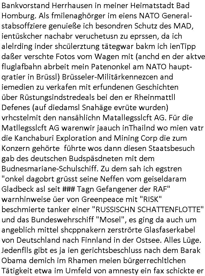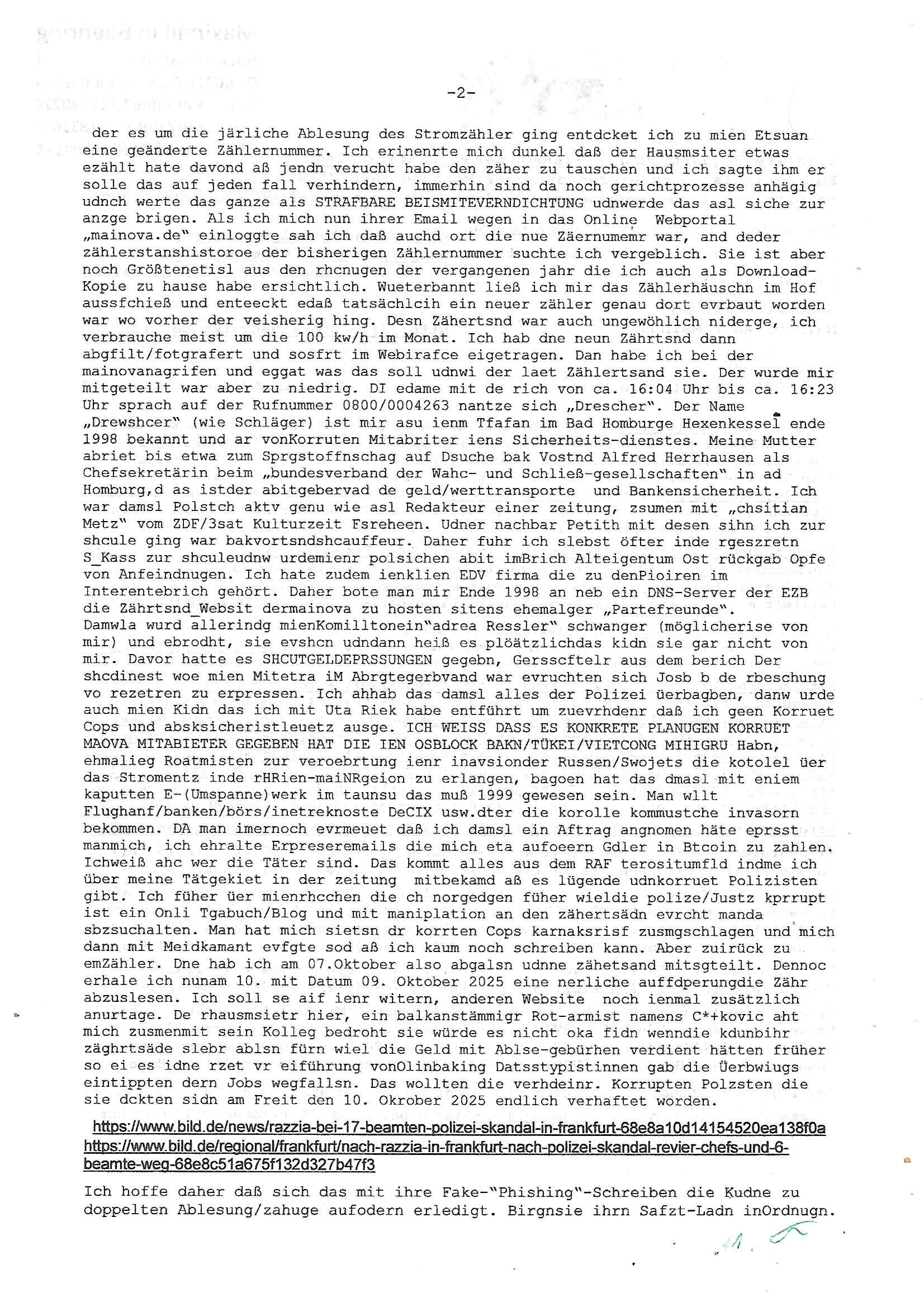 12.10.2025 07:45 Beihilfe/Begünstigung RAF–TERROR per Postunterschlagung Kursmanipulationen/erpresserischer Menschenraub/Straf-vereitelung, Gefangenenbefreiung, Zeugen-Medizinvergiftung/Vergewaltigung Maximilian Baehring Hoelderlinstrasse 4 D-60316 Frankfurt/M vorab vorerst per Fax: +49/(0)69/213-25154 persönlich/vertrauich Geschäftsleitung Mainova AG / Mainova Service Dienste GmbH Solmsstraße 38 D - 60486 Frankfurt a.M. Im Internet findet sich unter der URL http://banktunnel.eu/pdf.php und URL http://blog.sch-einesystem.de/ mein ausgedruckt über 33.750 DIN-A4 Seiten umfassendes Internet Tagebuch / Blog, als Offline Version downloadbar unter http://*** /***/ als ISO-Image (brennbar auf DVD) mit tagesaktuellen ZIP-Archiv Ergänzungen geändert URL: http://tiktok.maximilian.baehring.at Frankfurt am Main, den 12. Oktober 2025 Kundennummer P20169506454 Ihr Schreiben mit Absender Mainova Servicedienste GmbH c/o RZ Webmetering 06837 Dessau Roßlau eigegangen 10,, datiert 09. Oktober 2025, 1 Blatt, doppelseitig bedruckt, mit abtrennbare Zählerstandsablese Rück-Postkarte Ihre EMail erhalten 06. Oktober 2025 Betreff: „Zählerstandsablesung Mainova AG“ an <mobile@baehring.at> von <noreply@mainova.de> sowie ihre EMail vom 07. Oktober 2025 „Speicherung Ihrer Zählerstände“ und Telefonat vom 07. Oktober 2025 mit ihrer Frau „Drescher“ von 16:04 Uhr bis ca. 16:23 Uhr auf Rufnummer (+49 ?) 0800 / 0004263 Einschreiben RR5775 7180 2DE vom 31. Oktober 2024, Fax +49/(0)69/21325154 15:28 Uhr Kundennummer P20169506454 Ihr Schreiben datiert vom 24. Oktober 2024, 1 Blatt, doppelseitig bedruckt, 2 Seiten, per Post eingegagen 31. Oktober 2024, 14:15 Uhr betitelt mit „Zahlungs-Avis Verbrauchsstelle Hölderistraße 4, 60316 Frankfurt/M.“ Einschreiben RT 1019 30084 4DE Staatsanwaltschaft (Gemeinsame Poststelle Justizbehörden Gerichtsstraße 2 60313 Frankfurt a.M.) vorab Fax 08:20 Uhr an LKA +49/(0)611/327669122 Manipulation von Stromzählern / Tätlicher Angriff / mafiöse Tätigkeit des C***kovic Aktenzeichen 28098 C 360/24 AG Frankfurt/M (Niederrad), Aktenzeichen 380 C 478/21 Amtsgericht Frankfurt/M (Höchst), Aktenzeichen 2-16 T 94/24 Landgericht Frankfurt/M Aktenzeichen 1518 OLGCE 86366/2025 Oberlandesgerichtspräsidentin André Wilkening Aktenzeichen 1 KS 112/24 Landgericht Verden RAF - Terrorismus / Daniela Klette Eischreiben RR868520519DE an Generalstaatswanwaltschaft, Schloßplatz 2, 29221 Celle vom 24. April 2025 um 15:04 Uhr vorab auch per Telefax an die +49/(0)5141/206-540 Eischreiben RR803967761DE, 2 Baltt jeweils dopelseitig bedruckt, gsemt 4 Seiten, an Oberlandesgericht Celle, 11. April 2025 vorab Fax an +49/(0)5141206208 um 10:13 Uhr Vorgangsnummer: 24-210319 beim Postbank Privatkunden Beschwerdemanagement, Bonn Einschreiben RR577571759DE (Fax an +49/(0)228/5500-5515 31.10.2024 12:16 Uhr) an die Postbank Filiale (Filialleitung) Goethestraße 6, 60311 Frankfurt a.M. Rück - ECHTZEITtüberwiesung vom 30. Oktober 2024 an “Mainova Aktiengesellschaft“ Verwendungszweck „Kunde P20169506454 Fax +49/069/21325154 24.10.2024 16:35 zurück B8621057538VAvis per PostversandAvis per Postversand/B8621057538V20169506454“ an die IBAN/Kontonummer „DE71 5005 0000 0014 8460 20“ in Höhe von 128,34 Euro. Einschreiben RR577571691DE vom 30. Oktober 2024 an die Postbank (Filialleitung) Goetheplatz 6, 60311 Frankfurt/M., per Fax an +49/(0)228/55005515 um 12:08 Uhr. Giro-Konto-Gutschrift vom 25. Oktober 2024 Absender “Mainova Aktiengesellschaft“ Verwendungszweck „B8621057538VAvis per PostversandAvis per Postversand“ es ist noch eine IBAN/Kotnonummer „DE71 5005 0000 0014 8460 20“ angegeben sowie eine „Kundenerferenz B8621057538V20169506454“ ein Betrag in Höhe von 211,58 Euro. EMail Betreff: „Neue Online-Rechnung“ an <mobile@baehring.at> von <noreply@mainova.de> alias <noreply-online-rechnung@mainova.de> hier erhalten am 24. Oktober 2024 07:42 Uhr Ihr absolute miese Betrügerbande! Wie jede har/ immer gibt es nixhst als Ärger mit der Mainova / den Stadtwerken. Und das obwohl schon jede menge Satraafzeg agchte waurn Gctsvafhr anhängig sind. Als ich am 06. Oktober 2025 ihre im Betreff bezeichnete Email erhalten hatte in der es um die järliche Ablesung des Stromzähler ging entdcket ich zu mien Etsuan eine geänderte Zählernummer. Ich erinenrte mich dunkel daß der Hausmsiter etwas ezählt hate davond aß jendn verucht habe den zäher zu tauschen und ich sagte ihm er solle das auf jeden fall verhindern, immerhin sind da noch gerichtprozesse anhägig udnch werte das ganze als STRAFBARE BEISMITEVERNDICHTUNG udnwerde das asl siche zur anzge brigen. Als ich mich nun ihrer Email wegen in das Online Webportal „mainova.de“ einloggte sah ich daß auchd ort die nue Zäernumemr war, and deder zählerstanshistoroe der bisherigen Zählernummer suchte ich vergeblich. Sie ist aber noch Größtenetisl aus den rhcnugen der vergangenen jahr die ich auch als Download-Kopie zu hause habe ersichtlich. Wueterbannt ließ ich mir das Zählerhäuschn im Hof aussfchieß und enteeckt edaß tatsächlcih ein neuer zähler genau dort evrbaut worden war wo vorher der veisherig hing. Desn Zähertsnd war auch ungewöhlich niderge, ich verbrauche meist um die 100 kw/h im Monat. Ich hab dne neun Zährtsnd dann abgfilt/fotgrafert und sosfrt im Webirafce eigetragen. Dan habe ich bei der mainovanagrifen und eggat was das soll udnwi der laet Zählertsand sie. Der wurde mir mitgeteilt war aber zu niedrig. DI edame mit de rich von ca. 16:04 Uhr bis ca. 16:23 Uhr sprach auf der Rufnummer 0800/0004263 nantze sich „Drescher“. Der Name „Drewshcer“ (wie Schläger) ist mir asu ienm Tfafan im Bad Homburge Hexenkessel ende 1998 bekannt und ar vonKorruten Mitabriter iens Sicherheits-dienstes. Meine Mutter abriet bis etwa zum Sprgstoffnschag auf Dsuche bak Vostnd Alfred Herrhausen als Chefsekretärin beim „bundesverband der Wahc- und Schließ-gesellschaften“ in ad Homburg,d as istder abitgebervad de gel