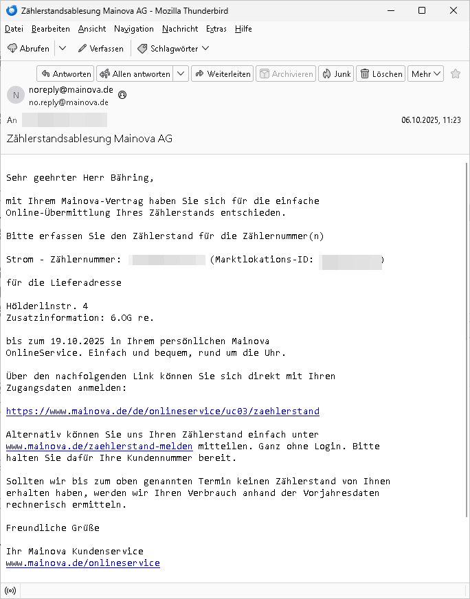 12.10.2025 03:31 -------- Nachricht -------- Betreff: Zählerstandsablesung Mainova AG Datum: Mon, 6 Oct 2025 11:23:55 +0200 Von: noreply@mainova.de <no.reply@mainova.de> An: *** Sehr geehrter Herr Bähring, mit Ihrem Mainova-Vertrag haben Sie sich für die einfache Online-Übermittlung Ihres Zählerstands entschieden. Bitte erfassen Sie den Zählerstand für die Zählernummer(n) Strom - Zählernummer: 1DZG0062482338 (Marktlokations-ID: 50667855934) für die Lieferadresse Hölderlinstr. 4 Zusatzinformation: 6.OG re. bis zum 19.10.2025 in Ihrem persönlichen Mainova OnlineService. Einfach und bequem, rund um die Uhr. Über den nachfolgenden Link können Sie sich direkt mit Ihren Zugangsdaten anmelden: https://www.mainova.de/de/onlineservice/uc03/zaehlerstand Alternativ können Sie uns Ihren Zählerstand einfach unter www.mainova.de/zaehlerstand-melden mitteilen. Ganz ohne Login. Bitte halten Sie dafür Ihre Kundennummer bereit. Sollten wir bis zum oben genannten Termin keinen Zählerstand von Ihnen erhalten haben, werden wir Ihren Verbrauch anhand der Vorjahresdaten rechnerisch ermitteln. Freundliche Grüße Ihr Mainova Kundenservice www.mainova.de/onlineservice DIES IST EINE AUTOMATISCH GENERIERTE NACHRICHT. Bitte antworten Sie nicht auf diese E-Mail. Wenn Sie sich an uns wenden möchten, können Sie dies ganz einfach per Kontaktformular: www.mainova.de/kontakt -------- Nachricht -------- Betreff: Speicherung Ihrer Zählerstände Datum: Tue, 7 Oct 2025 15:57:23 +0200 Von: noreply@mainova.de <no.reply@mainova.de> An: *** Sehr geehrter Herr Bähring, vielen Dank für die Übermittlung Ihres aktuellen Zählerstands 615 für die Zählernummer ***. Wir haben die Angaben in unserem System gespeichert. Ihr Kundenkonto ist damit auf dem neuesten Stand. Schauen Sie gerne noch einmal nach: Die Vertragsdaten finden Sie zentral in Ihrem persönlichen Login-Bereich. Einfach und bequem, flexibel und effizient – der Mainova OnlineService bietet Ihnen umfassenden Kundenservice rund um die Uhr. Jetzt einloggen: https://www.mainova.de/de/onlineservice/uc03/zaehlerstand Freundliche Grüße Ihr Mainova Kundenservice www.mainova.de/onlineservice DIES IST EINE AUTOMATISCH GENERIERTE NACHRICHT. Bitte antworten Sie nicht auf diese E-Mail. Wenn Sie sich an uns wenden möchten, können Sie dies ganz einfach per Kontaktformular: www.mainova.de/kontakt === Anrufe Datum Name / Rufnummer *** Eigene Rufnummer Dauer (hh:mm) 07.10.25 16:04 08000004263 *** 6967831634 0:19 07.10.25 15:26 06980088012 *** 6967831634 0:04 === Zeitraum 07.10.2025 16:04:34 Dauer 18:43 Eigene Rufnummer 06967831634 Status Ausgehende Gesprächspartner 08000004263 Typ Anruf Zeitraum Zeitraum 07.10.2025 15:26:03 Dauer 03:12 Eigene Rufnummer 06967831634 Status Ausgehende Gesprächspartner 06980088012 Typ [0] "202510120331-0-1.jpg" [1] "202510120331-0-2.jpg" [2] "202510120331-0-3.jpg" [3] "202510120331-0-4.jpg" [4] "202510120331-0-5.jpg" [5] "202510120331-0-6.jpg" [6] "202510120331-0-7.jpg" |
