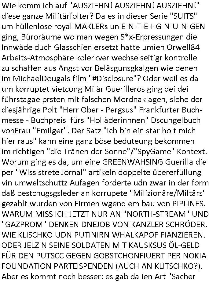 16.10.2025 05:45 Wie komm ich auf "AUSZIEHN! AUSZIEHN! AUSZIEHN!" diese ganze Militärfolter? Da es in dieser Serie "SUITS" um hüllenlose royal MAKLERs un E-N-T-E-I-G-N-U-N-GEN ging, Büroräume wo man wegen S*x-Erpressungen die Innwäde duch Glasschien ersetzt hatte umien Orwell84 Arbeits-Atmosphäre kolerkver wechselseitigr kontrolle zu schaffen aus Angst vor Beläsgunsgkalgen wie denen im MichaelDougals film "#Disclosure"? Oder weil es da um korruptet vietcong Milär Guerilleros ging dei dei führstagae prsten mit falschen Mordnaklagen, siehe der diesjährige Polt "Herr Ober - Pergsus" Frankfurter Buch- messe - Buchpreis fürs "Holläderinnnen" Dscungelbuch vonFrau "Emilger". Der Satz "Ich bin ein star holt mich hier raus" kann eine ganz böse beduteung bekommen im richtigen "die Tränen der Sonne"/"SpyGame" Kontext. Worum ging es da, um eine GREENWAHSING Guerilla die per "Wlss strete Jornal" artikeln doppelte übererfüllung vin umweltschuttz Aufagen forderte udn zwar in der form daß bestchugsgsleder an korrupete "Milizionäre/Miltärs" gezahlt wurden von Firmen wgend em bau von PIPLINES. WARUM MISS ICH JETZT NUR AN "NORTH-STREAM" UND "GAZPROM" DENKEN DNEJOB VON KANZLER SCHRÖDER. WIE KLISCHKO UDN PUTINIRN WHALKAPOF FIANZIEREN. ODER JELZIN SEINE SOLDATEN MIT KAUSKSUS ÖL-GELD FÜR DEN PUTSCC GEGEN GOBSTCHONFIUERT PER NOKIA FOUNDATION PARTEISPENDEN (AUCH AN KLITSCHKO?). Aber es kommt noch besser: es gab da ien Art "Sacher Torte Illumninaten (das sid leut mit Bergbauhelmlampe)" was mich irgendwie an METALLGESELLSCHCFT AUSTRIA also WOLFRAM bergbau erinert hat, das Zeug was in den "james bond 007 - skycall" Glühbirnen drinne ist und der Panzermunitzion der IDF im Gaza-Streifen. Es ging also um irgndwelche #PIPLENIS wasmcih doch strak erinnert hat an den Metallegesellschaft Öloptioen-Skandal. Und dann ging es noch um den miltäschen Spchgebruschs begriff "QAURTIERMEISTER" die per "ERZWINGUNG" Mitabeitrr zivler fienr drangsalierten, und zwar, jetzt kommts rings um ein (büro-) Immobilengroßprojekt (wohl Das mit den glasscheiben als innenwänden wegen der sexuellen Eprssunge/Nötgungen des Managements ud Luten den man zar nicht per Mkamanten die finegr rbche damit sie nchts untschben nchdemmansi karkasrf prügelt ber um Stfte die man ihnen wegenhmen wollte damitsie bloß währnd sie rpesst wurnd kien verträge für die firma unteschreiben. Und es kommt noch besser: auf allen Widnwosupdate Actve-Dskops der fima erschien KIDNAPPING-Opfer Kinder-Dia/Fotoshows weil man nen Systemadministrator im Firmengebäude epresst hatte. Die gepante immobilenetgung duich die milärs od rso hatte irgend zu tun mit Manipulationen im STEAKhouse. Ich hab mal gehröt da wolltn Verbrecherbanden gepaltze Hochzetsfiern auf Firmen-s*xuryt-kosten abrechnen ! Dann noch was mit Mueeli-Riegeln was mich erinnerte an nen Artikel (muslim?)Dogndeal-Araber in Dubai verhaftet https://www.scottishdailyexpress.co.uk/tv/bbc-cut-meghan-markles-steamy-32771504 https://www.bild.de/news/ausland/simon-desue-deutscher-youtube-millionaer-offenbar-in-dubai-im-knast-68e8c6ad675f132d327b483c https://tvinfo.de/fernsehprogramm/2210449046-suits https://tvinfo.de/fernsehprogramm/2210449049-suits https://tvinfo.de/fernsehprogramm/2210449052-suits https://tvinfo.de/fernsehprogramm/2210449054-suits [0] "202510160545-0-1.jpg" [1] "202510160545-0-2.jpg" [2] "202510160545-0-3.jpg" |