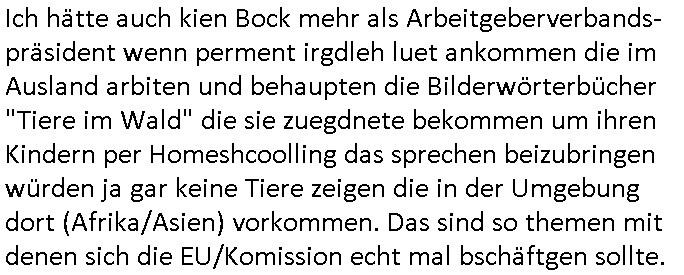18.10.2025 16:15 Ich hätte auch kien Bock mehr als Arbeitgeberverbands- präsident wenn perment irgdleh luet ankommen die im Ausland arbiten und behaupten die Bilderwörterbücher "Tiere im Wald" die sie zuegdnete bekommen um ihren Kindern per Homeshcoolling das sprechen beizubringen würden ja gar keine Tiere zeigen die in der Umgebung dort (Afrika/Asien) vorkommen. Das sind so themen mit denen sich die EU/Komission echt mal bschäftgen sollte. https://www.bild.de/politik/inland/arbeitgeberverband-gesamtmetall-boss-stefan-wolf-wirft-hin-68ee45aa7d532d835d5fbdf9 [0] "202510181615-0-1.jpg" [1] "202510181615-0-2.jpg" |