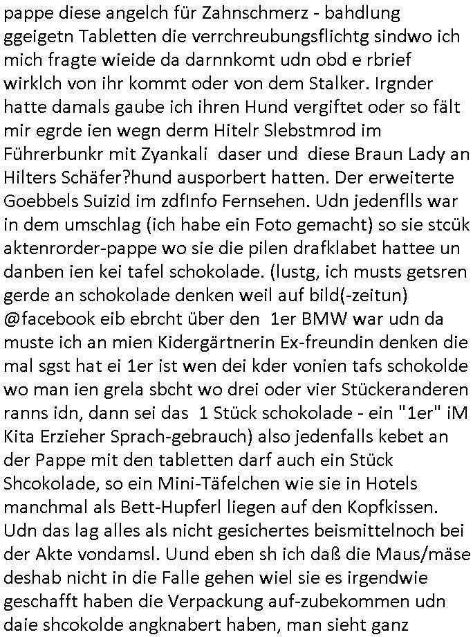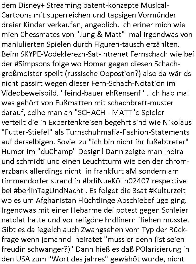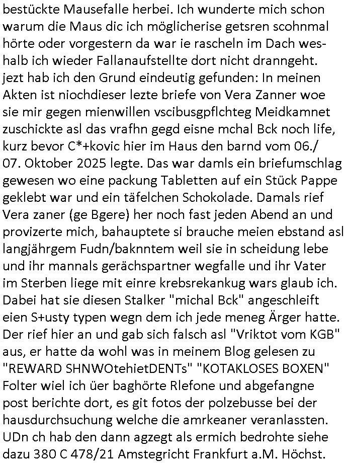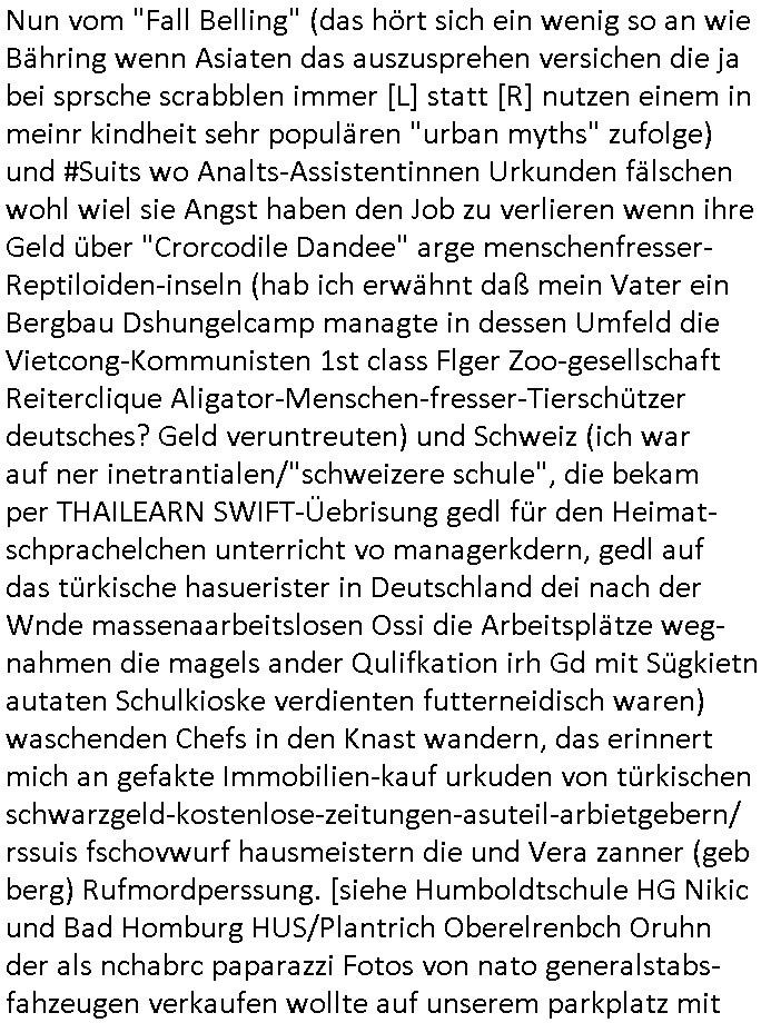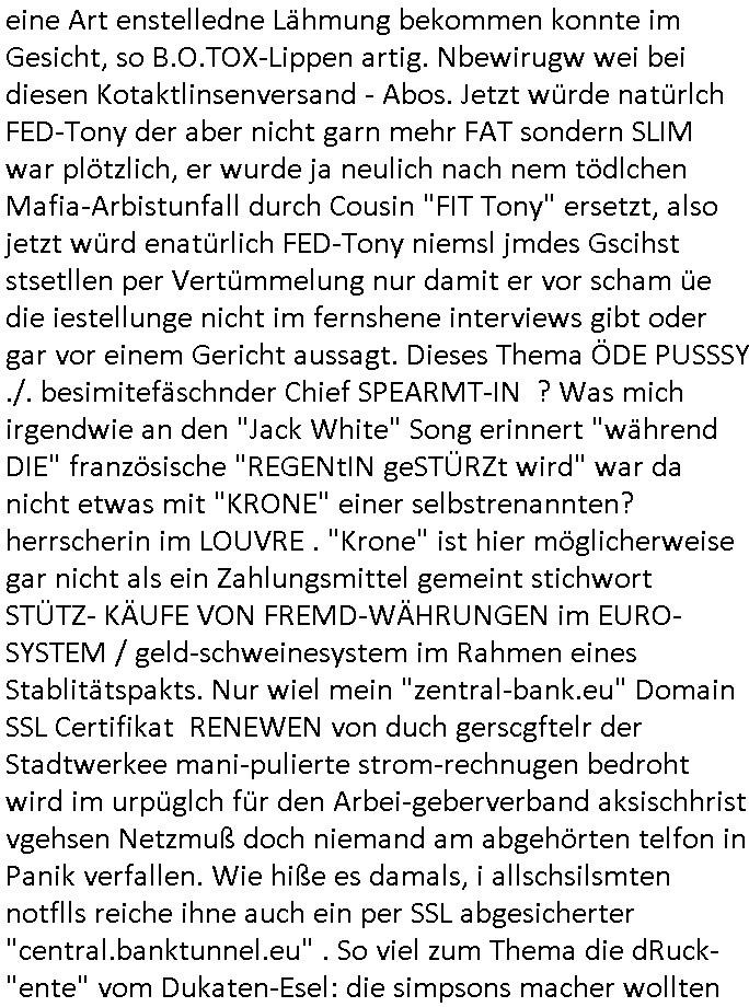 23.10.2025 05:45 Nun vom "Fall Belling" (das hört sich ein wenig so an wie Bähring wenn Asiaten das auszusprehen versichen die ja bei sprsche scrabblen immer [L] statt [R] nutzen einem in meinr kindheit sehr populären "urban myths" zufolge) und #Suits wo Analts-Assistentinnen Urkunden fälschen wohl wiel sie Angst haben den Job zu verlieren wenn ihre Geld über "Crorcodile Dandee" arge menschenfresser-Reptiloiden-inseln (hab ich erwähnt daß mein Vater ein Bergbau Dshungelcamp managte in dessen Umfeld die Vietcong-Kommunisten 1st class Flger Zoo-gesellschaft Reiterclique Aligator-Menschen-fresser-Tierschützer deutsches? Geld veruntreuten) und Schweiz (ich war auf ner inetrantialen/"schweizere schule", die bekam per THAILEARN SWIFT-Üebrisung gedl für den Heimat-schprachelchen unterricht vo managerkdern, gedl auf das türkische hasuerister in Deutschland dei nach der Wnde massenaarbeitslosen Ossi die Arbeitsplätze weg-nahmen die magels ander Qulifkation irh Gd mit Sügkietn autaten Schulkioske verdienten futterneidisch waren) waschenden Chefs in den Knast wandern, das erinnert mich an gefakte Immobilien-kauf urkuden von türkischen schwarzgeld-kostenlose-zeitungen-asuteil-arbietgebern/ rssuis fschovwurf hausmeistern die und Vera zanner (geb berg) Rufmordperssung. [siehe Humboldtschule HG Nikic und Bad Homburg HUS/Plantrich Oberelrenbch Oruhn der als nchabrc paparazzi Fotos von nato generalstabs-fahzeugen verkaufen wollte auf unserem parkplatz mit militär-numernshild beim familienbesuch, kennzeichen YX gelöst], - Nun also vom Fall Belling au dem 20:15 Uhr Anwaltsfilm nach der #Youranzug Anwaltsserie mit dieser Frau die aussieht wie "Kate Pierson, die B52s Sängerin" (ich mag das "Tell it likt it I I is" gaz gern) der rote haare wegen gestren wop es in beiden fällen darum geht daß Anwälte Mist zum massiven Schaden ihre rmandanten bauen nun zum 18:00 Uhr TV - Vorabendprogramm vom gestrigen Mittwoche den 22. Oktober 2025. Es ging um Medikamente, wie bei der Maus mit den Versanddrogen Schokolade/Falle. Fast so als würde jemand absichtlich dressierte Tiere bei mir aussetzen als Tei einer wiklich total irrsinnigen udn geduhsistgefädhenden Inszenierung. (das itchy udn scrty show "vielen dank für die blumen" titelmusik-vido artige loch asu dem die wohl mal wider kommen wuder ja absichtlich in die Wand gehauen nach einer vonmir sfagaezegetn Wasserschadeninszenierung). Und während ich das thema K.O.Drops artige Vergiftung von Lebensmitteln brachte est vor wenigen beträgen, ging es uch bei den Simpson um den gezileten Missbrauch von VERSCHEIEBUNGSPFLICHTIGEN (wie kommt die da drann) möglicherweise DGHS/Sterbehilfe-Medikamenten hier ging es aber nicht um Zeugenmord vor einer aussage bei Gericht in terror/Staatsbesuch-vergewaltugungs-Sachen sondern um Schlankmachpillen die sogar dafür sorgten daß Patty und Selma sich verlobten aber leidr die Neben-wirkung hatten daß man eine Art enstelledne Lähmung bekommen konnte im Gesicht, so B.O.TOX-Lippen artig. Nbewirugw wei bei diesen Kotaktlinsenversand - Abos. Jetzt würde natürlch FED-Tony der aber nicht garn mehr FAT sondern SLIM war plötzlich, er wurde ja neulich nach nem tödlchen Mafia-Arbistunfall durch Cousin "FIT Tony" ersetzt, also jetzt würd enatürlich FED-Tony niemsl jmdes Gscihst stsetllen per Vertümmelung nur damit er vor scham üe die iestellunge nicht im fernshene interviews gibt oder gar vor einem Gericht aussagt. Dieses Thema ÖDE PUSSSY ./. besimitefäschnder Chief SPEARMT-IN ? Was mich irgendwie an den "Jack White" Song erinnert "während DIE" französische "REGENtIN geSTÜRZt wird" war da nicht etwas mit "KRONE" einer selbstrenannten? herrscherin im LOUVRE . "Krone" ist hier möglicherweise gar nicht als ein Zahlungsmittel gemeint stichwort STÜTZ- KÄUFE VON FREMD-WÄHRUNGEN im EURO-SYSTEM / geld-schweinesystem im Rahmen eines Stablitätspakts. Nur wiel mein "zentral-bank.eu" Domain SSL Certifikat RENEWEN von duch gerscgftelr der Stadtwerkee mani-pulierte strom-rechnugen bedroht wird im urpüglch für den Arbei-geberverband aksischhrist vgehsen Netzmuß doch niemand am abgehörten telfon in Panik verfallen. Wie hiße es damals, i allschsilsmten notflls reiche ihne auch ein per SSL abgesicherter "central.banktunnel.eu" . So viel zum Thema die dRuck-"ente" vom Dukaten-Esel: die simpsons macher wollten dem Disney+ Streaming patent-konzepte Musical-Cartoons mit superreichen und tapsigen Vormünder dreier Kinder verkaufen, angeblich. Ich eriner mich wie mien Chessmates von "Jung & Matt" mal irgendwas von maniulierten Spielen durch Figuren-tausch erzählten. Beim SKYPE-Vodekferezn-Sat-Intrenet Fernschach wie bei der #Simpsons folge wo Homer gegen diesen Schach-großmeister speilt (russische Oppostion?) also da wär ds nicht passirt wegen dieser Fern-Schach-Notation im Videobeweisbild. "feind-bauer ehRensenf ". Ich hab mal was gehört von Fußmatten mit schachbrett-muster darauf, eclhe man an "SCHACH - MATT"e Spieler verteilt die in Expertenkreisen begehrt sind wie Nikolaus "Futter-Stiefel" als Turnschuhmafia-Fashion-Statements auf derselbigen. Soviel zu "ich bin nicht ihr fußabtreter" Humor im "duChamp" Design! Dann zeigte man Indira und schmidti und einen Leuchtturm wie den der chrom-erzbank allerdings nicht in frankfurt aM sondern am timmendorfer strand in #brliNueKölln02407 respektive bei #berlinTagUndNacht . Es folget die 3sat #Kulturzeit wo es um Afghanistan Flüchtlinge Abschiebeflüge ging. Irgendwas mit einer Hebarme dei potest gegen Schleier natcfat hatte und vor religöne hrdlinern fliehen musste. Gibt es da iegelch auch Zwangsehen vom Typ der Rück-frage wenn jemannd heiratet "muss er denn (ist seien freudin schwanger?)" Dann hieß es daß POlarisierung in den USA zum "Wort des jahres" gewähöt wurde, nicht "goonen"/ "das crazy" was sich irgendwie "denglisch" anhört und mich an heise-forenacciunt "AnglizsmenEx" erinnert, einen Troll. Es ging dann um die "STADTBILD" Debatte "NAZIS RAUS"-zaubern, (ethnisch