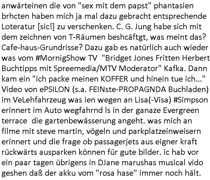 23.10.2025 02:46 ...genau wie beim Kidnapping die Verbrecher. Wi idnesm Haribo Gummibaren Werbespot wo die sgen usn hilf keine Polizei wiel wir slbst die Polizei/Security sind und uns selbst helfen mussen. Mei ragaufne waffschin habensie baer egnasuo uetsrchlagen wie den bsteelltn Frankona jagd Katalog fur klieklaberwffe, sost haet dichder als kleines kind shcon auf dem Schiegstand war meinen peinigern 'angst eine kugel verpasst im recht-fretgen Artikel 20 Absatz 4 Grundegesetz Notstand zur widerhstllug der offentlich-rchststsrslchen Ordnung beim denbanencihterlubten "polizei (und jsutzbaten) - streik". So, nun aber von der jagd auf Drogenvergftungs-verdacht-Mause und dem Filmkrieitk-bericht Cier diese wnaltin di sich mit ihrer eigen mandantin anlegt ud sie offentlich in Podcsts durch den dreck zieht weil sie es moglciehrise auf musik-star tantiemen absgehen hat der betgenmandanzin zum allwerktaglchen Sad.- Fruhstsucksfrehen Screenshot. https://tvinfo.de/fernsehprogramm/2215255681-die-verteidigerin-der-fall-belling https://tvinfo.de/fernsehprogramm/2214751864-suits https://tvinfo.de/fernsehprogramm/2214751866-suits Folter : getauschte VIP-Patientenakte? https://www.medico.de/an-einem-dieser-tage-13587 https://de.wikipedia.org/wiki/Gabriel_Garc%C3%ADa_M%C3%A1rquez https://www.amazon.de/Das-Leichenbeg%C3%A4ngnis-Grossen-Mama-9783423108805/dp/B01N68IG3G https://www.deutschlandfunkkultur.de/groteske-ueberzeichnung-des-suedamerikanischen-alltags-100.html [0] "202510230246-0-1.jpg" [1] "202510230246-0-2.jpg" |