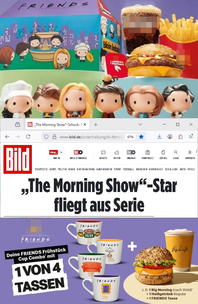 23.10.2025 13:30 Jet kommt es ganz dicke: nicht nur daß ich gestern #Suits mit #Pocahontas verpasst habe, nein, quasi zeitgleich zum Erscheinen des #Friends "Happy Meal" Menüs ("mit alles auf Burger") erreicht mich die nachricht daß eine von der #Aniston "Morning Show" nicht mehr mitmachen wird. #Aniston war ja auch bei " #Friends " dabei wo sie eine Serviererin gespielt hat im "Central __k" Cafe und da gibt es jetzt zu jeder Lunchbox für Kinder-Sammel-tassen und es gibt wohl auch Action - Figuren wenn man den kompletten Frühstücks-brunch dort bestellt . Ich sag nur "EAT THIS, Marlene Lufen"! ("ann ich dann das speilzeug ....?" Übrgens: Hab immer noch Melodie und Text zu McBaCOn im Kopf von damals. P.S.: #merkauMussWeg https://www.bild.de/unterhaltung/tv-fernsehformate/the-morning-show-schock-star-fliegt-aus-der-apple-serie-68f8b10d4fa665dfcbddd479 [0] "202510231330-0-1.jpg" [1] "202510231330-0-2.jpg" |