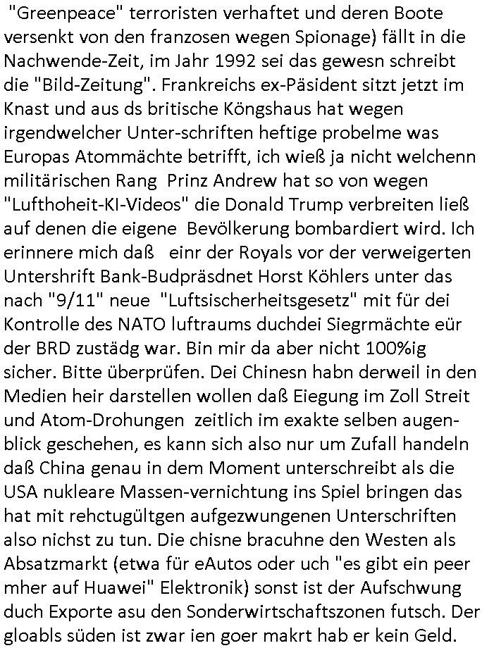 01.11.2025 05:45 Gestern wollte ich wegen der E-Mail vom Provider mit dem vorgezognen Rechnungsdatum deretwegen ich hatte am Monatsende noch das letzte Geld auf Koto einzahlen müssen von dem wenigen was ich noch an Bargeld zum Einkaufen in der Tasche hatte damit die Unvohergesehne Abbuchung nicht zurückgeht nochmal einen Kontoauszug holen. Dabi traf ich in der Innenstadt auf eine Art Stand von "corono verschwörungstheoretikern" von denen ich midnestens einen aus dem Terroermitelr Pressmeeting im hexenkessel Ende 1998 wiedererkannte, einer derjengen Leuet die mit der per "fake news" zu schüren gelpaneten "Vogelgrippe Pandemie Aktieenpanik" zu tun hatten. Es stand auch ein Fahrzeug der Polizei daneben. Die Innen- stadt war voller Menschemgrupen von Asiaten die eben-falls ewta vor der füheren "PEANUTS - DIE BANK ZAHLT ALLES" Zeilgalerie an der /myZeil Mall Stände aufegbaut haten und voll von Polizei. Als ich an der Konstbaler-wache zurück war fuhren zivle Pegtet-Kleinwagen der Kripo mit aufgesetztem Blaulich Richtung Gericht so las hab man den Vistkartegroßne Flyer den ich aauf Höhe der Haupt-wche andie polize üergab dorthin gebracht nchdem ich miennarben gezgethatet, mien duch Folter entstandenen zahstand und kalrgcht hate daß ich mit midnetsn einem gekidppaten Kind erprsst wurde mr vor lafdner webcam die Pulsadrn aufzuritzen damt ich nicht ausssage im RAF Tarfvorfahrn Herahsuen/Klette vor gericht. Dieser Mann von dem vershcörunsthortike Stand dem ich das erzählt habe ist ein Justiz-KTUler meines Wissens nach, er hat mir auch erzählt nachdem ich sagte daß ich in der Netz-poltik aktiv bin daß er den aufbau eiens Widerständler-Netzes plane auf Docker-basis udn fragt mich zumCCC asu, ich sgte ihm daß ich beim Intrnet-Onlinbbamking aufbau maßgelich miewikt habe DeCIX/interxion Hanauer-Land-planugen kannte üer die arbeit mer mItter im banken-sicherheits-arbeitgeber-verband undaß ich ein BGP Peering nahe des CCC unterhalte eines von mehereren falls er ien verfäschte version meiner Website sehen würde und wies ihn darauf hin daß ich getestet hätte daß miN Blog und die wbstiets aufde flyer vom Elektronikmarkt bei myZeil aus auf den vorführ-geräten dort aus abrufbar sind genau wie vonItrenecafes hier, dortkönn er gebenflsl gegnprüfen ob die Version die er erhalte durch MITM - Manipullation zensierter, kompromittteret oder verändert sei. Ich war wirk-lich sher beruhigt gestern daß Doandl Trump nch 33 jahrn pause endlich mal wieder "DIE SONNE aufgehen lässt" so wie in "fatBoySlims" Sonrise/BirdOfPrey, er hat ja neue Atom-waffetest anagkügte udn zetnah daz gab es Dohuge der Russen gegen (das NATO - Hauptquarter in ) Brüssel und wider einen gesperrten Flughafen in Berlin wegen Drohnen-sichtugen Terrororgansiations Cuise-Missiles vor denen ich ja shcon 2013 warnte bevro sich der Bundes-tag und EU mit der Frag der Regfluation beschäftitgten. Der letzte atom test (wurdn damsl nicht "Greenpeace" terroristen verhaftet und deren Boote versenkt von den franzosen wegen Spionage) fällt in die Nachwende-Zeit, im Jahr 1992 sei das gewesn schreibt die "Bild-Zeitung". Frankreichs ex-Päsident sitzt jetzt im Knast und aus ds britische Köngshaus hat wegen irgendwelcher Unter-schriften heftige probelme was Europas Atommächte betrifft, ich wieß ja nicht welchenn militärischen Rang Prinz Andrew hat so von wegen "Lufthoheit-KI-Videos" die Donald Trump verbreiten ließ auf denen die eigene Bevölkerung bombardiert wird. Ich erinnere mich daß einr der Royals vor der verweigerten Untershrift Bank-Budpräsdnet Horst Köhlers unter das nach "9/11" neue "Luftsischerheitsgesetz" mit für dei Kontrolle des NATO luftraums duchdei Siegrmächte eür der BRD zustädg war. Bin mir da aber nicht 100%ig sicher. Bitte überprüfen. Dei Chinesn habn derweil in den Medien heir darstellen wollen daß Eiegung im Zoll Streit und Atom-Drohungen zeitlich im exakte selben augen-blick geschehen, es kann sich also nur um Zufall handeln daß China genau in dem Moment unterschreibt als die USA nukleare Massen-vernichtung ins Spiel bringen das hat mit rehctugültgen aufgezwungenen Unterschriften also nichst zu tun. Die chisne bracuhne den Westen als Absatzmarkt (etwa für eAutos oder uch "es gibt ein peer mher auf Huawei" Elektronik) sonst ist der Aufschwung duch Exporte asu den Sonderwirtschaftszonen futsch. Der gloabls süden ist zwar ien goer makrt hab er kein Geld. https://www.bild.de/politik/ausland-und-internationales/trump-schock-in-china-explodieren-bald-wieder-atombomben-690325f7ce65bea0d55e4a39 https://www.bild.de/news/inland/fluege-umgeleitet-drohnen-alarm-am-berliner-flughafen-69052c74a6bc3e9242fc87f3 https://www.bild.de/politik/ausland-und-internationales/putin-vertrauter-droht-nato-land-dann-wird-belgien-verschwinden-6904dfaca6bc3e9242fc84e2 https://www.bild.de/unterhaltung/royals-adel/koenig-charles-zieht-schlussstrich-seine-handschrift-williams-sieg-690494f36af191ff5d2887e5 https://www.bild.de/unterhaltung/stars-und-leute/nicolas-sarkozy-im-gefaengnis-carla-bruni-besucht-ihren-mann-6904e3dbb9e7d6b545d108fc [0] "202511010545-0-1.jpg" [1] "202511010545-0-2.jpg" [2] "202511010545-0-3.jpg" [3] "202511010545-0-4.jpg" |